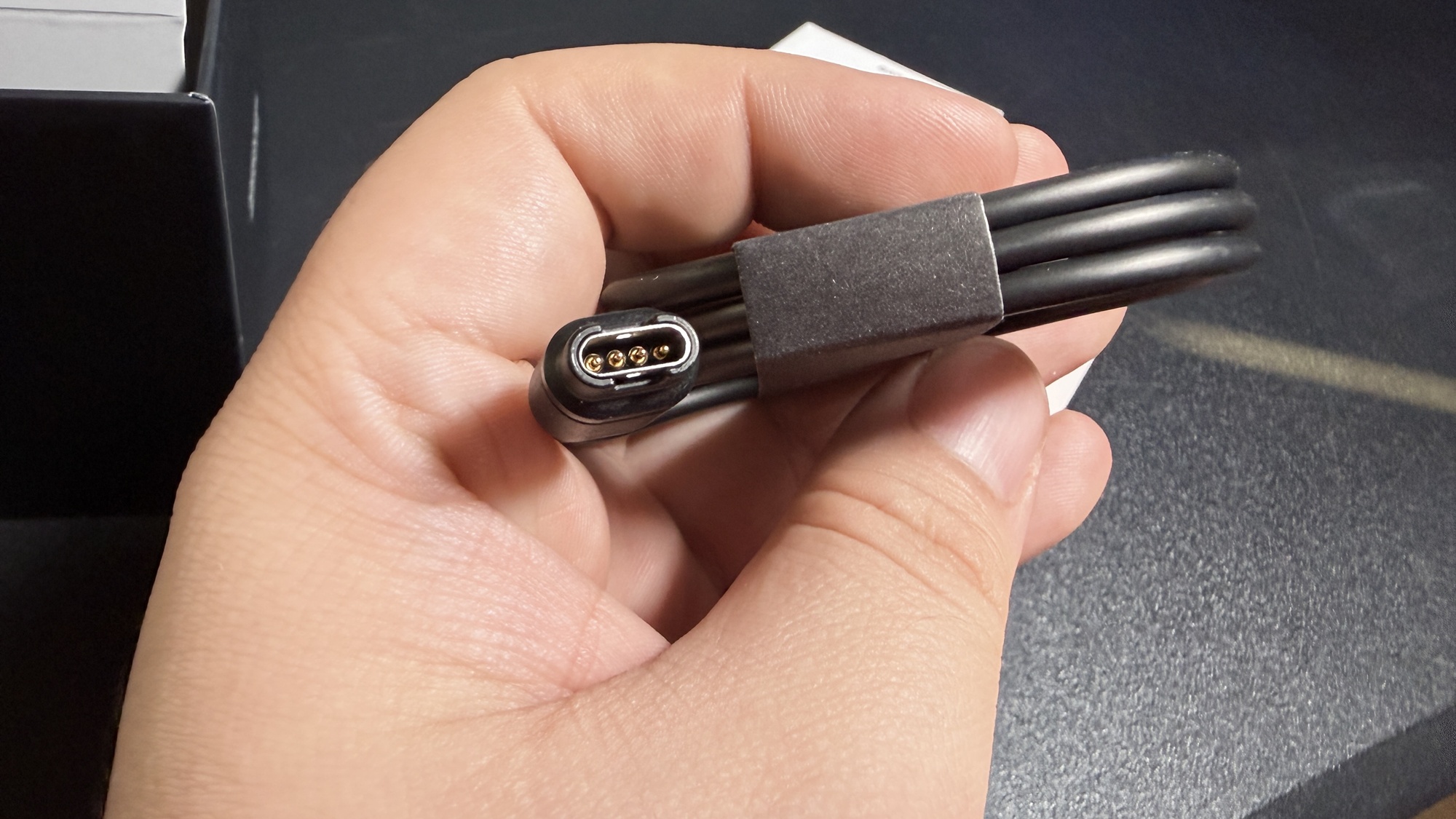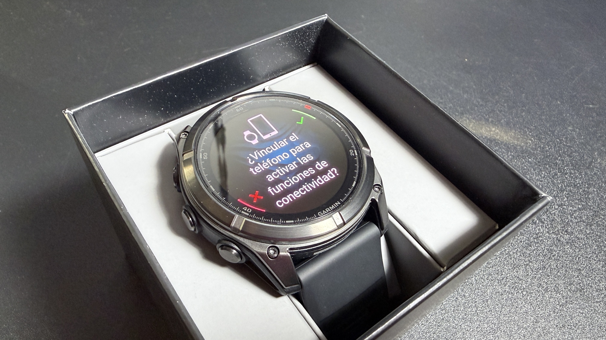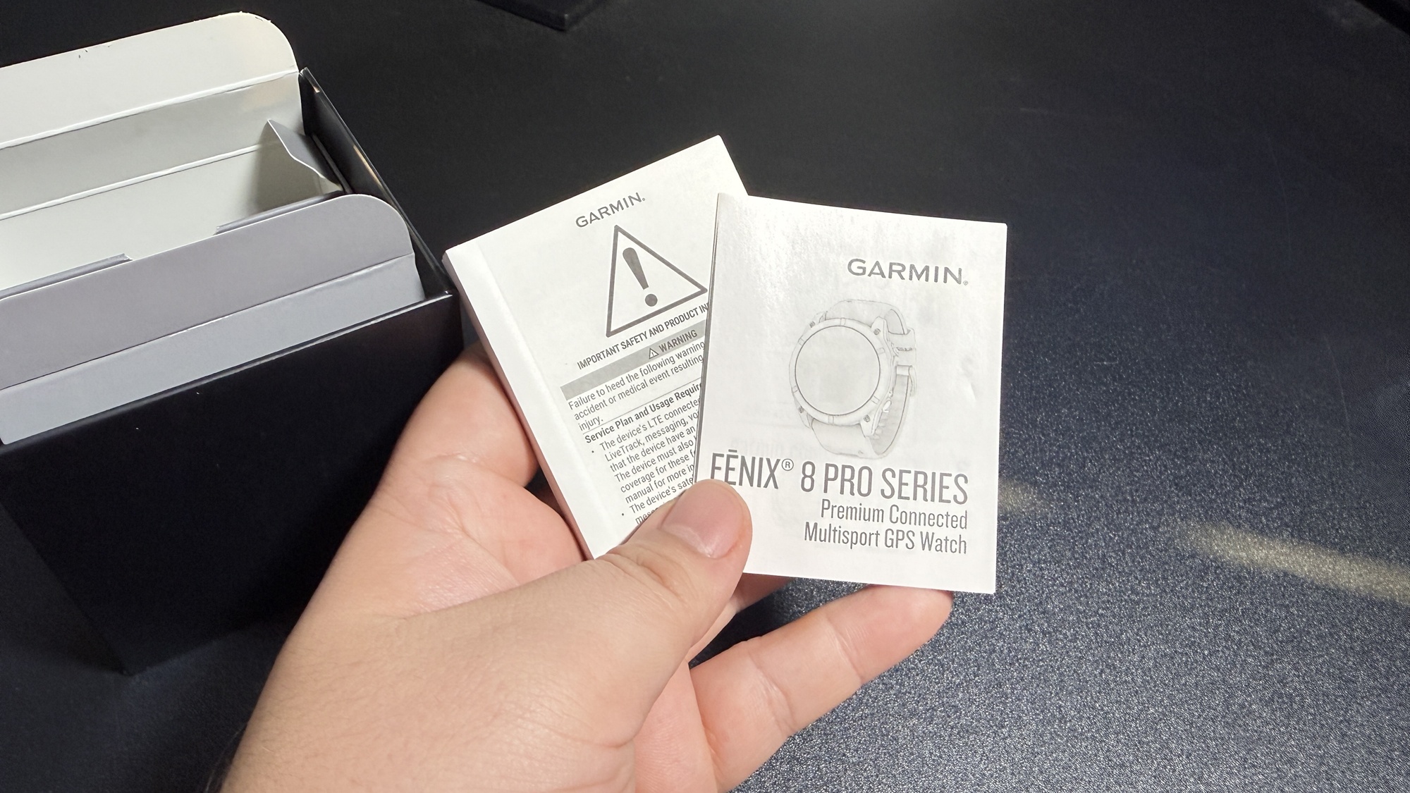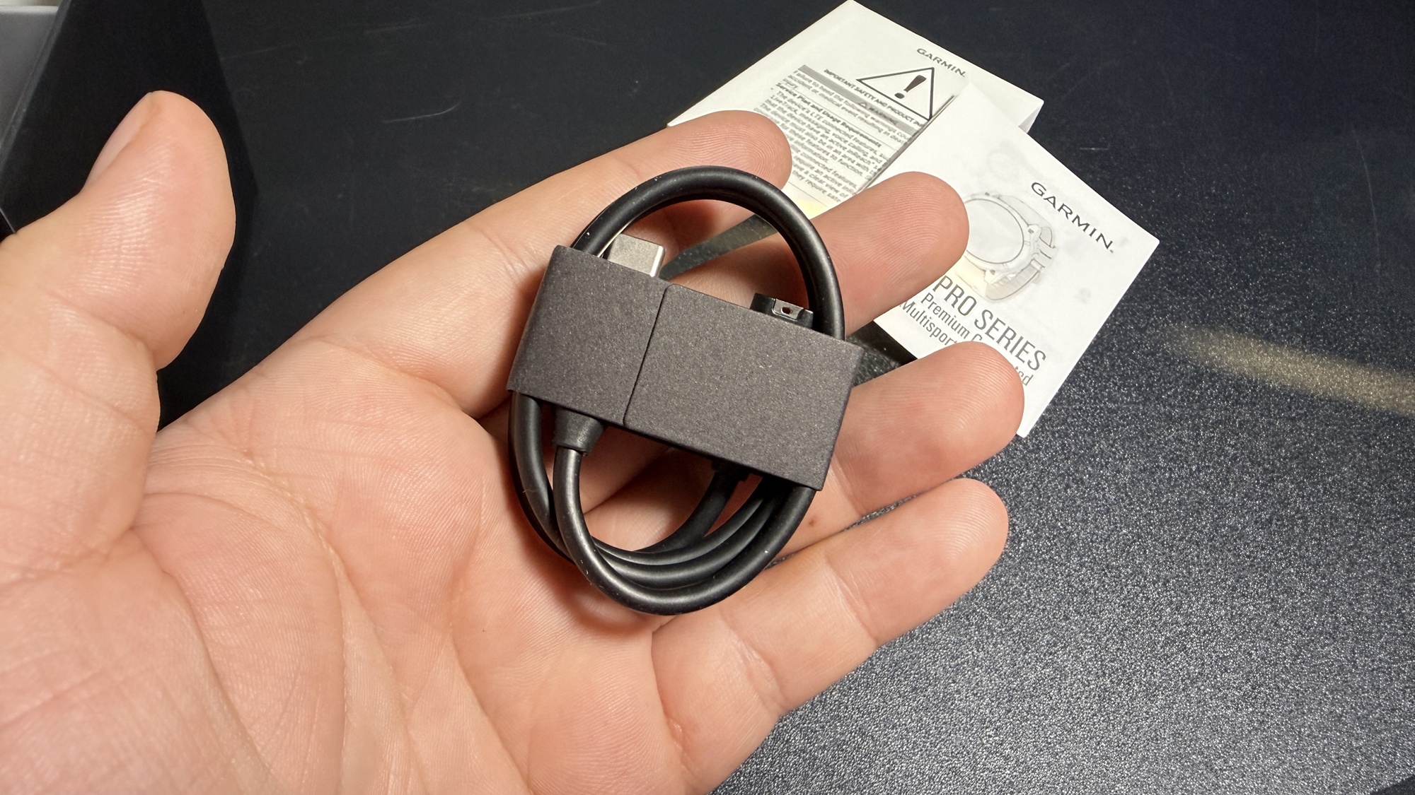 Chiar dacă în teorie discutăm despre o „mostră de viitor” în ceea ce privește smartwatch-urile de generație nouă, experiența de unboxing e tare familiară. Nu e nici de mirare, întrucât smartwatch-ul în variantă MicroLED are multe în comun cu varianta AMOLED, inclusiv designul fiind aproape identic. În cutie există manual de utilizare, ghid de pornire rapidă, un cablu cu conector proprietar Garmin și USB-C la celălalt capăt pe care îl folosim la încărcare.