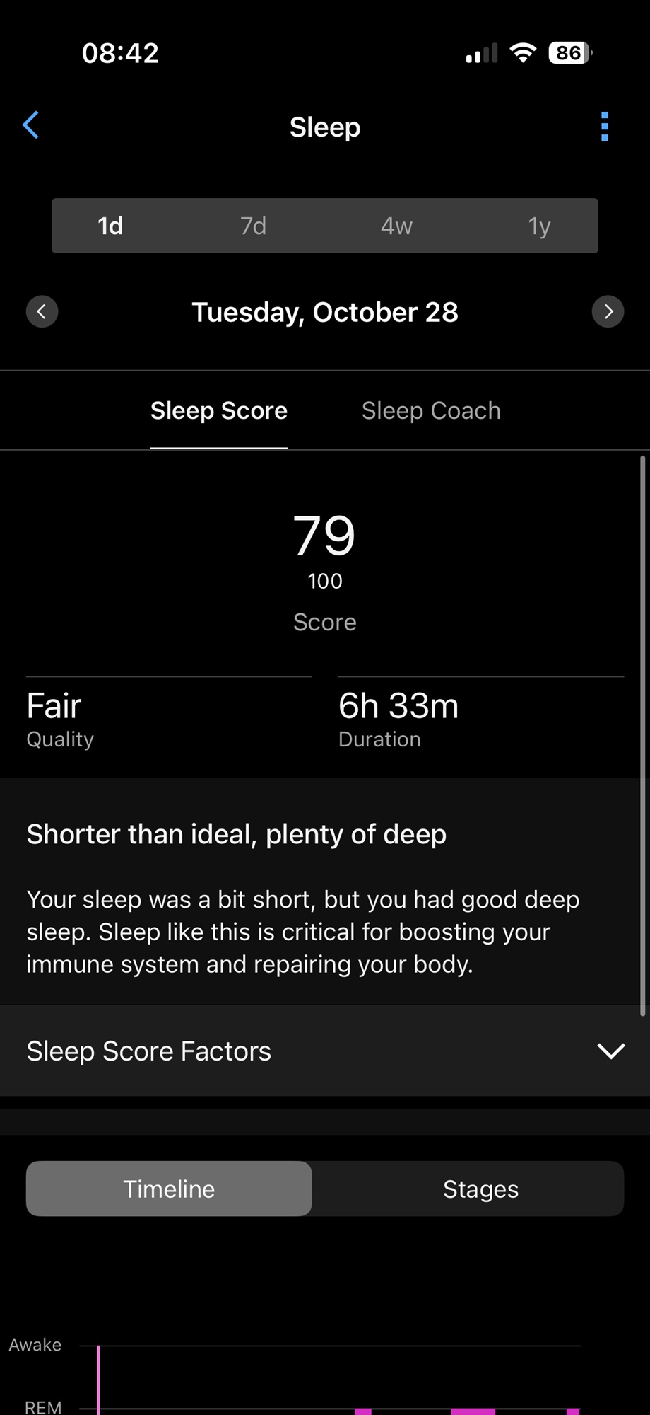 Somnul este analizat automat, inclusiv perioadele scurte de odihnă (nap tracking). Primim rapoarte zilnic și săptămânal, detaliate, ușor de interpretat. Pentru sportivi, ceasul aduce o serie de analize exclusive Garmin: