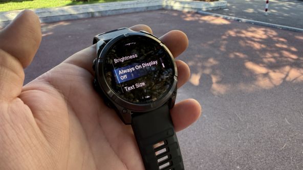 Rezoluția e de 454 x 454 pixeli, iar densitatea mare de puncte face ca fiecare detaliu să arate impecabil. Ecranul este acoperit de un strat oleofobic, ceea ce reduce urmele de degete și reflexiile. Interfața e familiară pentru oricine a folosit un ceas Garmin recent. Sistemul de meniuri e aproape identic cu cel de pe modelele AMOLED, iar navigarea combină atingeri și apăsări fizice de butoane. Butoanele sunt principalele instrumente de control în timpul antrenamentelor, pentru a evita atingerile accidentale.