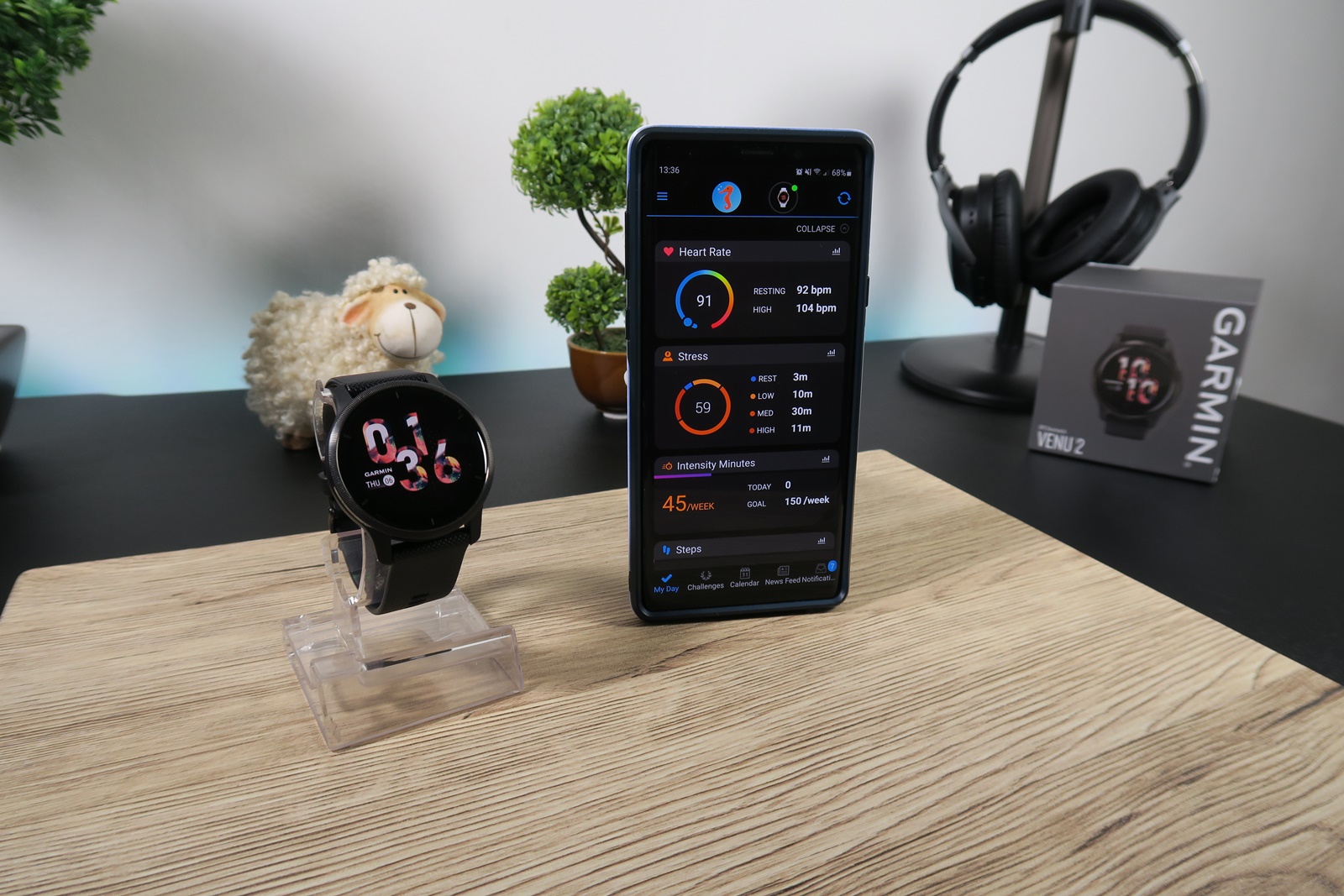 Tot din aplicație putem conecta ceasul la o rețea WiFi și să ne personalizăm interfața de utilizare. Avem și “antrenor personal” care funcționează pe principiul de challenge progresiv. Acesta apare ca widget pe ceas în fiecare zi și ne propune diferite target-uri pe care trebuie să le atingem. O altă aplicație utilă este Garmin Connect IQ Store prin care putem instala aplicații și o multitudine de Watch Faces. Avem chiar și jocuri care pot fi adăugate pe Venu 2, dar și aplicații prin care putem salva cu ajutorul GPS-ului locația mașinii, de exemplu.