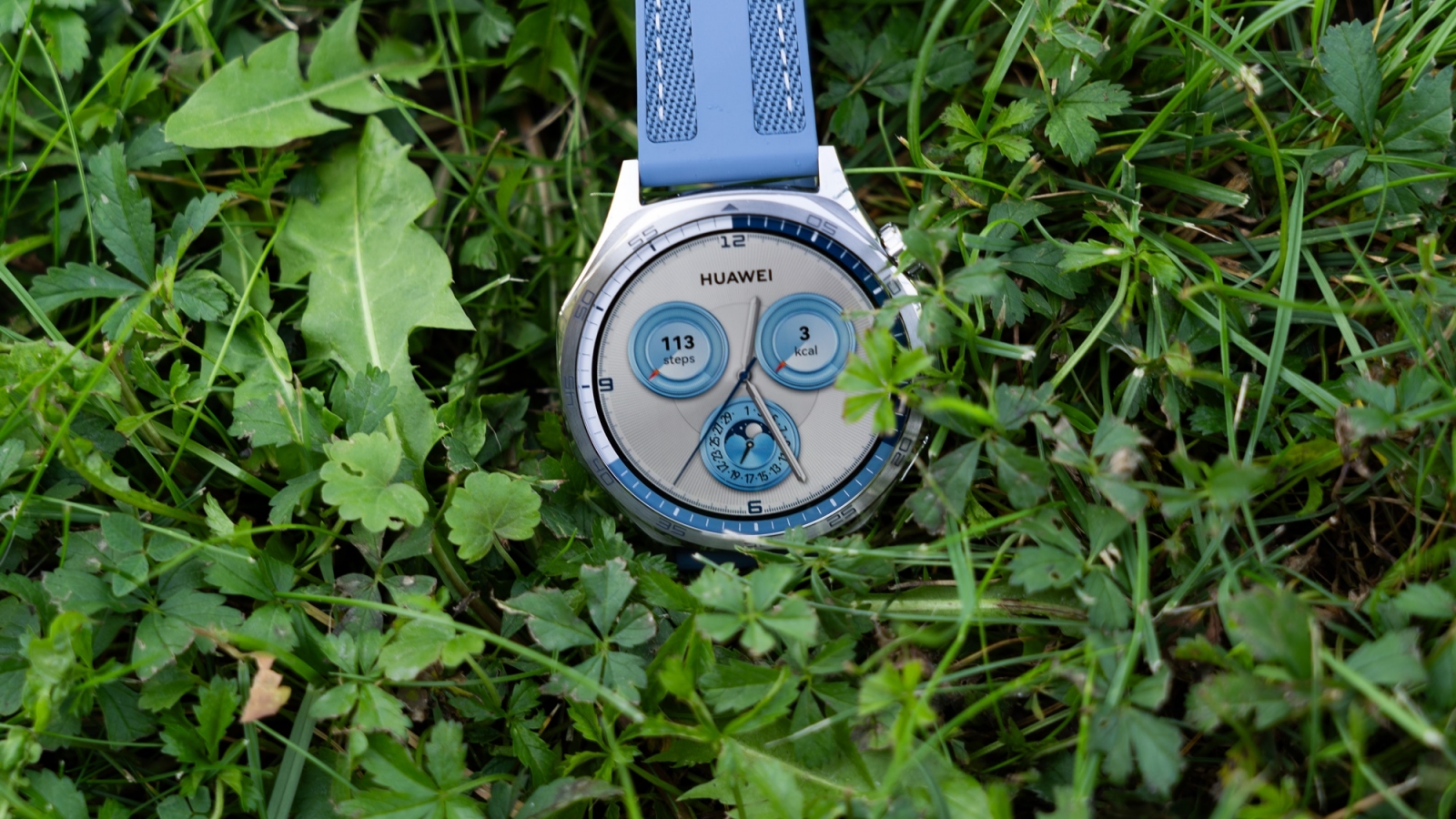 Avem o carcasă din oțel inoxidabil, inel metalic frontal și material din compozit de polimer în spate. HUAWEI Watch GT 5 46mm este un smartwatch cu look robust și impunător, iar opțiunile de curea sunt fluoroleastomer, piele compozit sau acest material tip țesătură precum cel văzut pe modelul sosit la mine în teste. Se numește Blue Woven apropo și combină ideea de cusături pe curea din piele cu o curea care e de fapt din TPU.