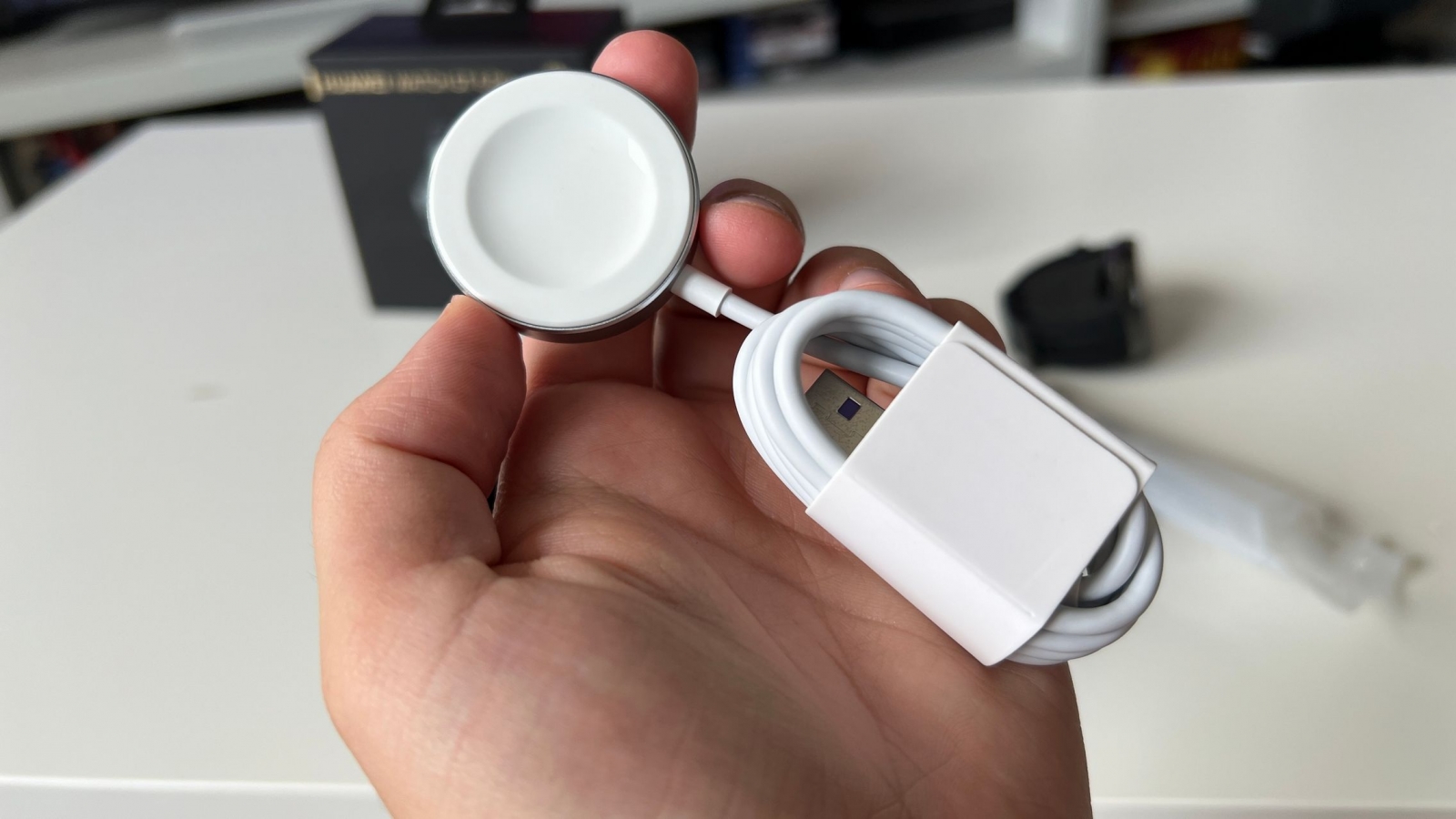 În cutie accesoriile sunt limitate și avem doar un micuț ghid rapid de utilizare și pucul de încărcare wireless magnetică, plus ceasul desigur. La mine a ajuns versiunea pe negru, echipată cu o curea din fluoroelastomer. Există și variantele Silver (curea din titaniu), respectiv Brown (curea compozit woven).
