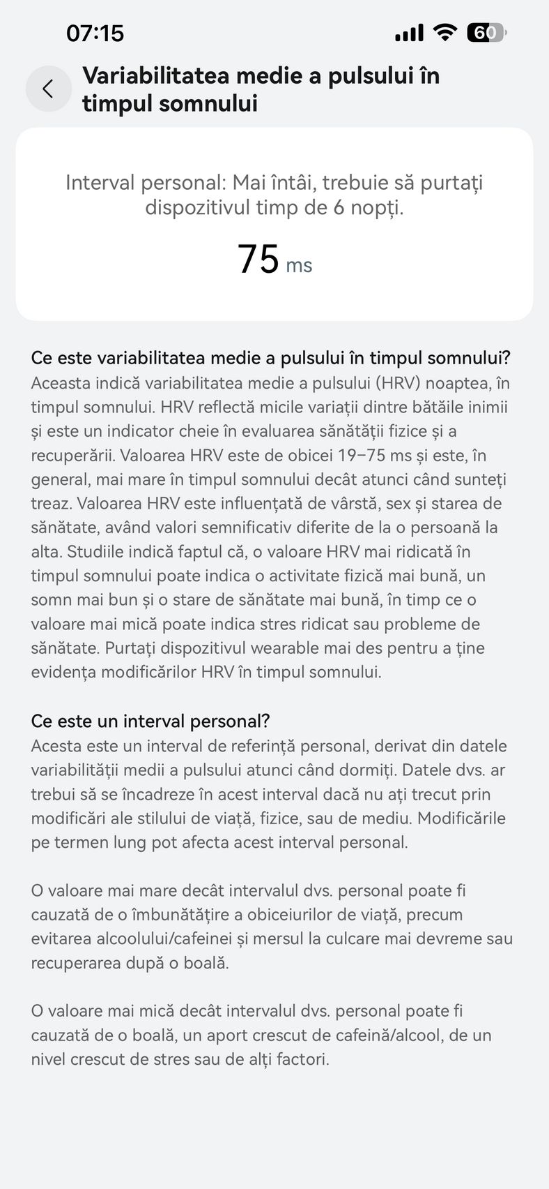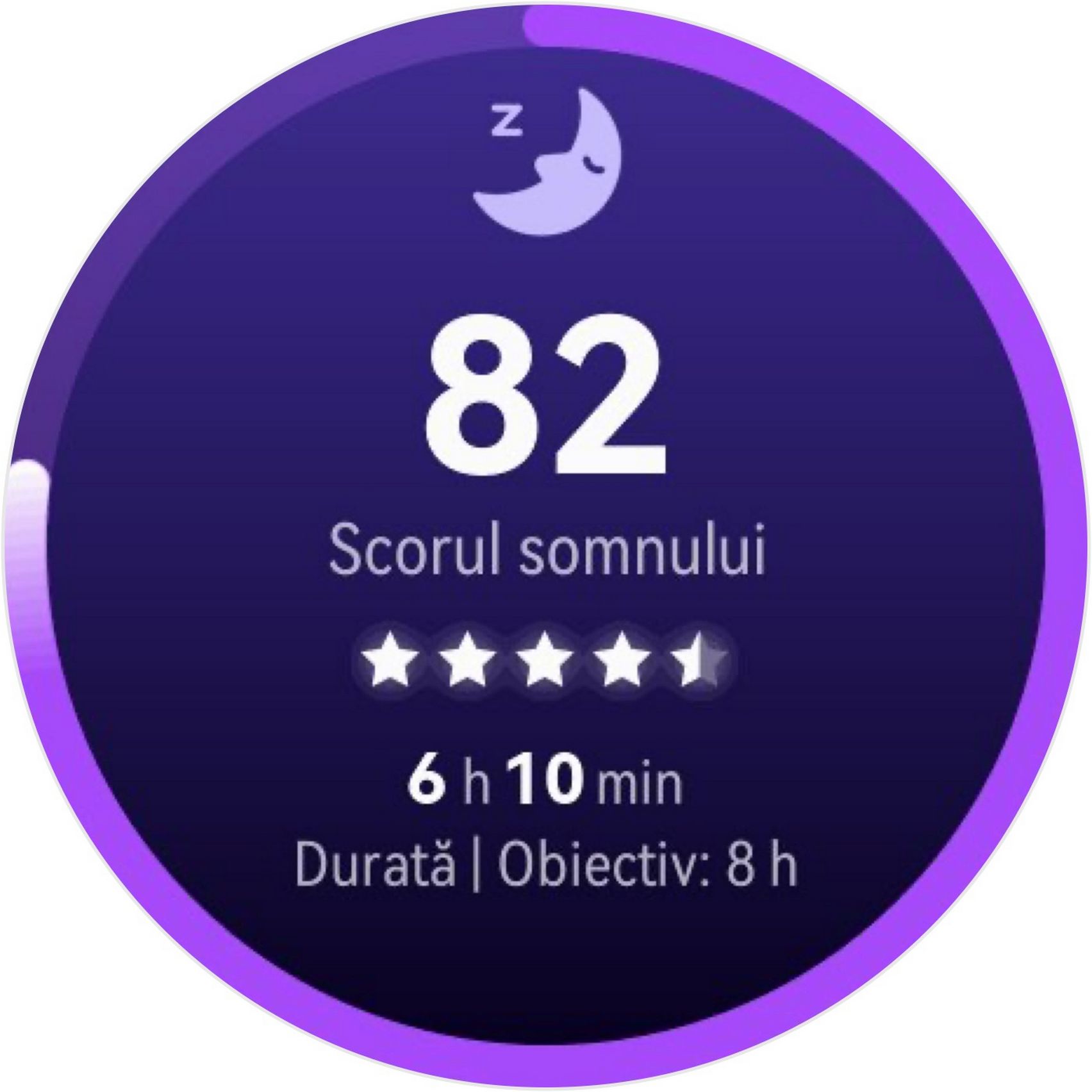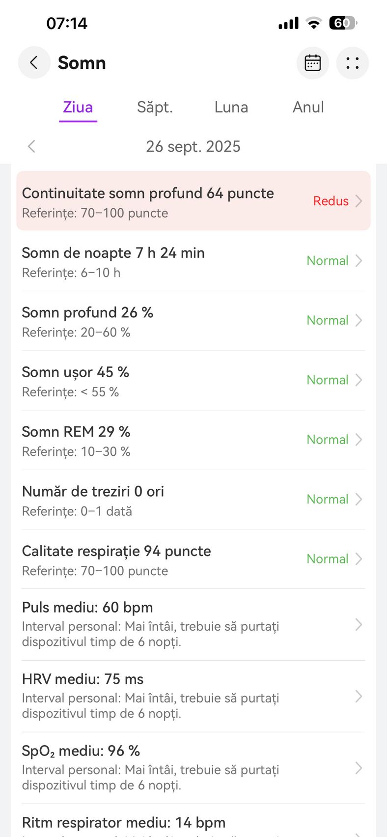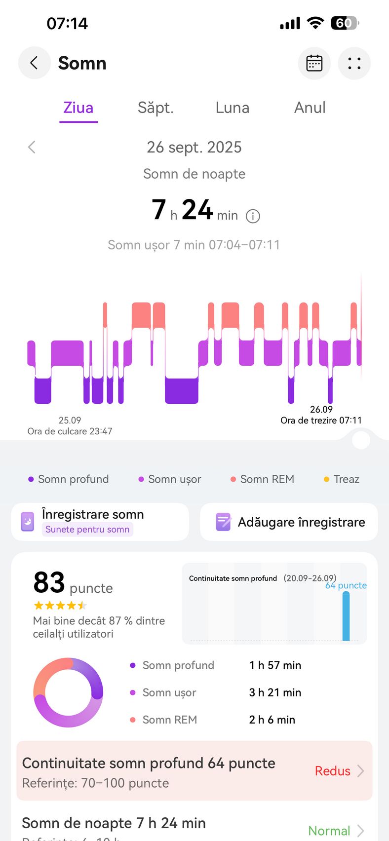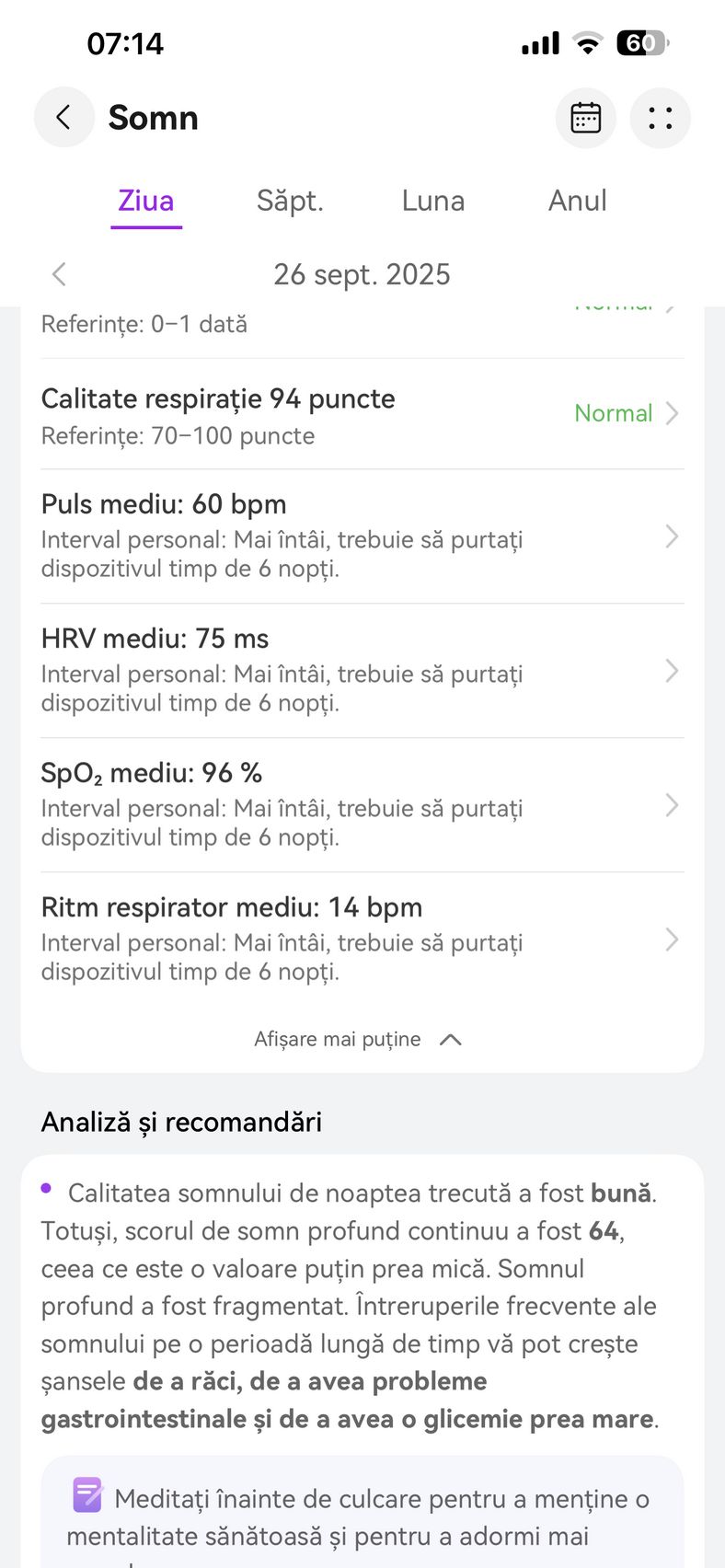 Nu am uitat nici de somn și am prins cam 6h 10m la ultima monitorizare, cu un scor de 82 de puncte. În timpul somnului mi s-a măsurat și pulsul mediu, HRV-ul mediu, somnul profund, somnul ușor, somnul REM și cât timp am fost treaz.