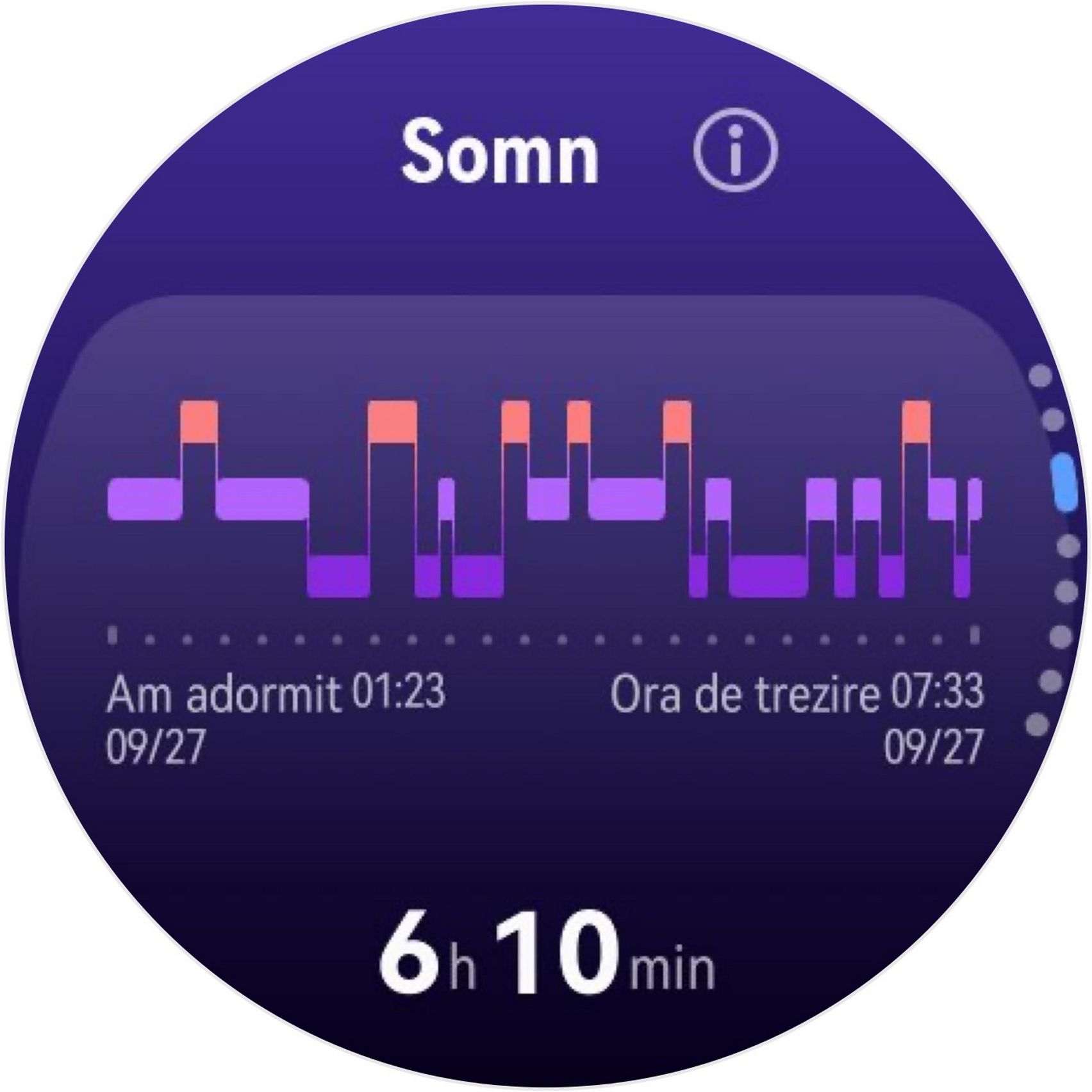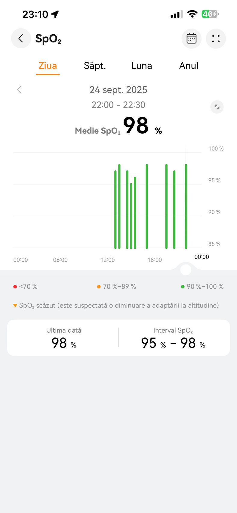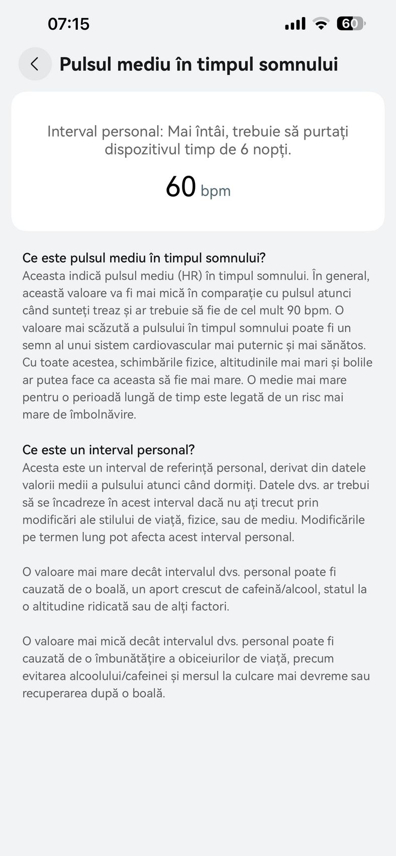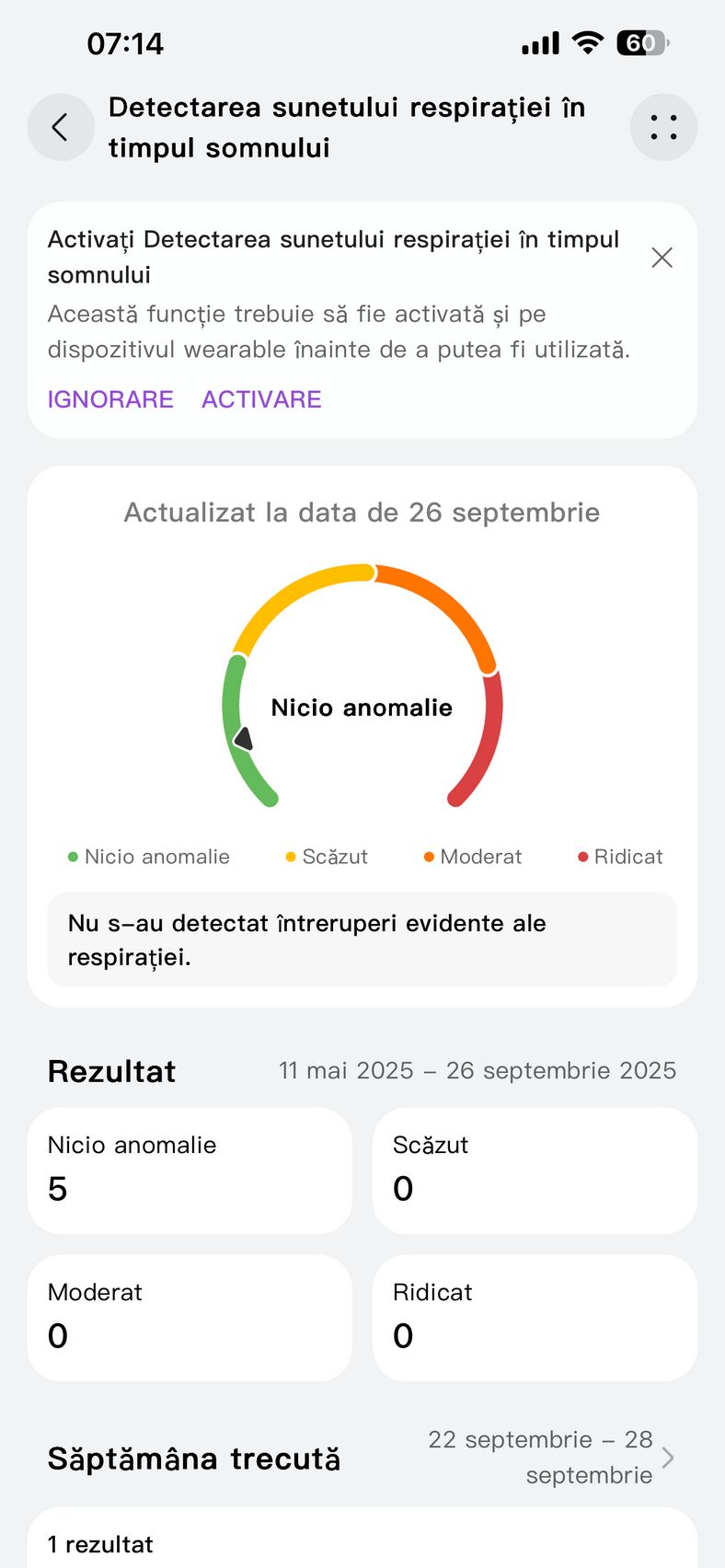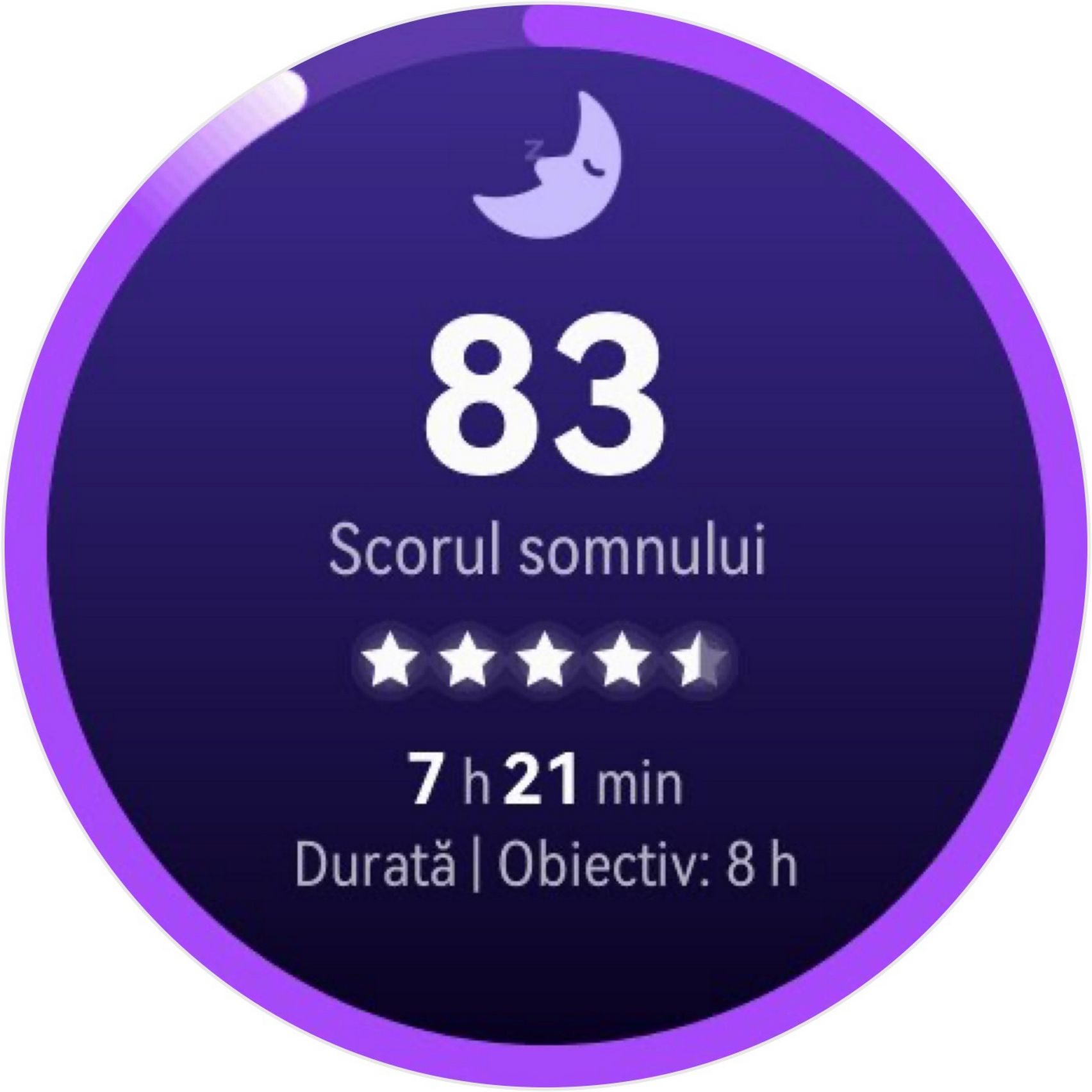 Nu am uitat nici de somn și am prins cam 6h 10m la ultima monitorizare, cu un scor de 82 de puncte. În timpul somnului mi s-a măsurat și pulsul mediu, HRV-ul mediu, somnul profund, somnul ușor, somnul REM și cât timp am fost treaz.