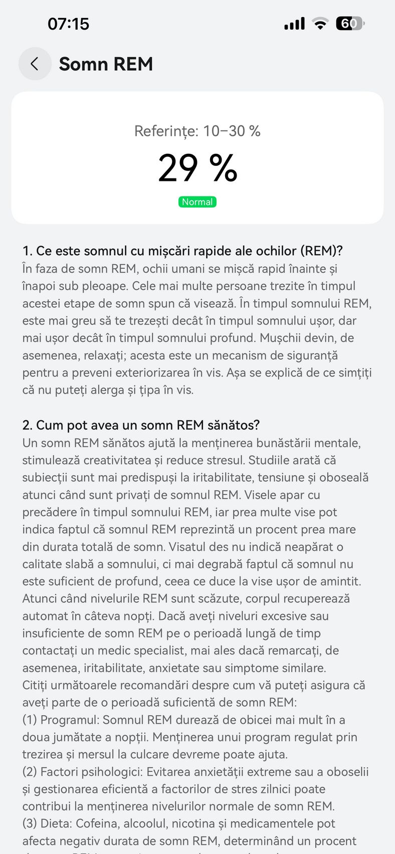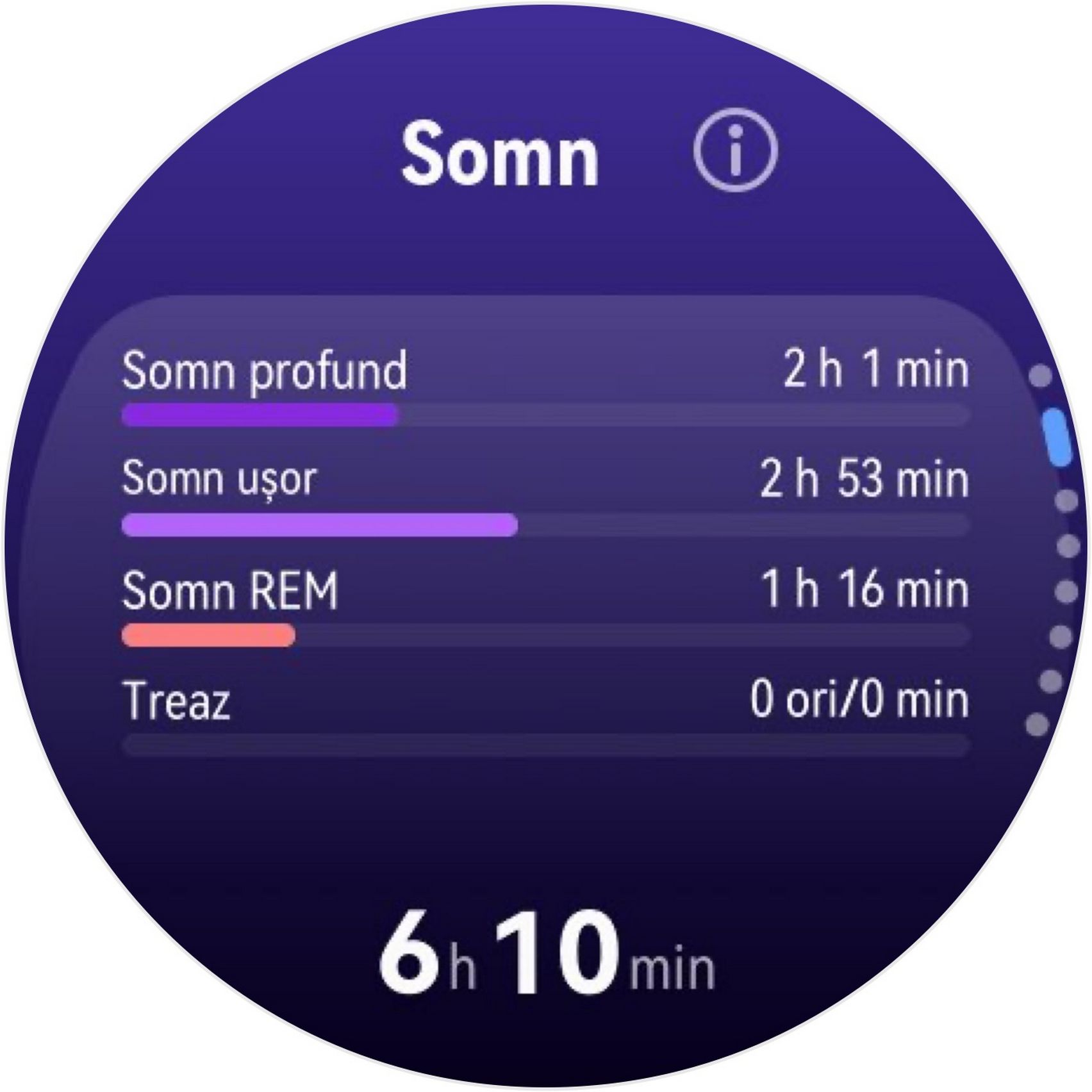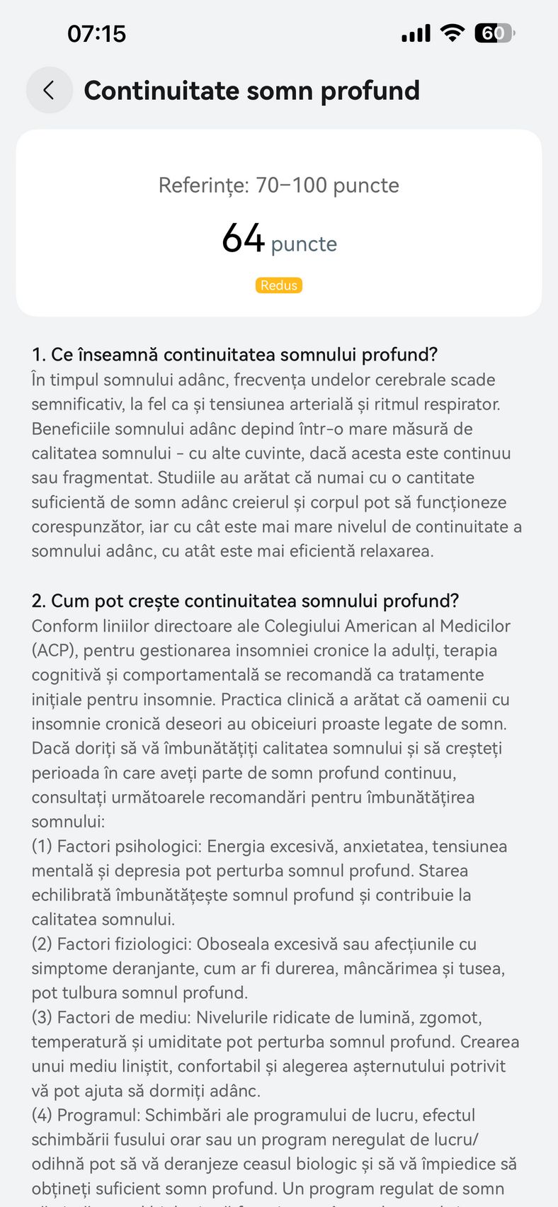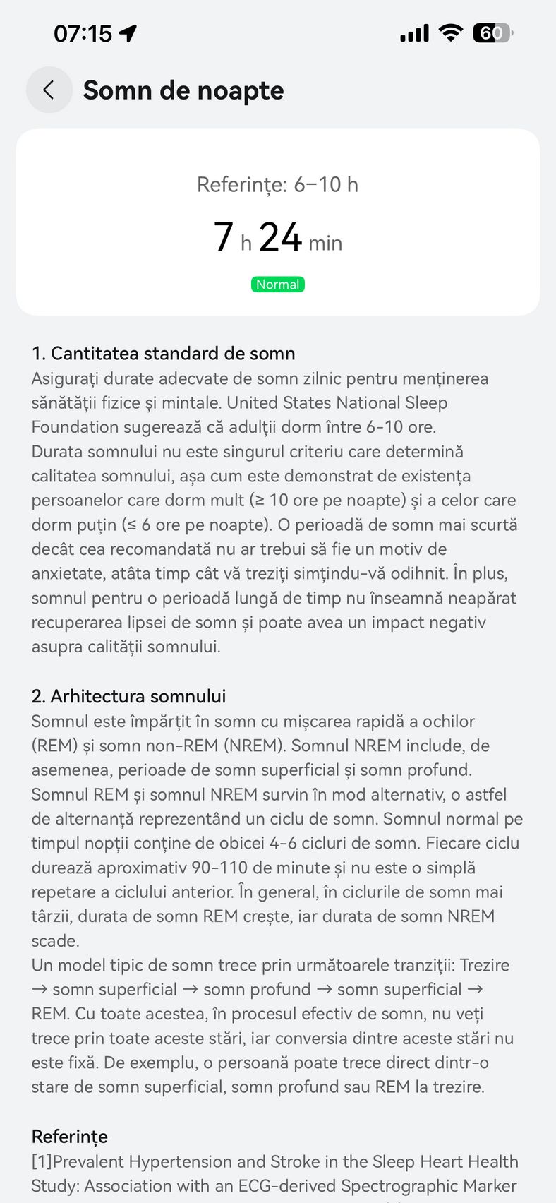 Nu am uitat nici de somn și am prins cam 6h 10m la ultima monitorizare, cu un scor de 82 de puncte. În timpul somnului mi s-a măsurat și pulsul mediu, HRV-ul mediu, somnul profund, somnul ușor, somnul REM și cât timp am fost treaz.