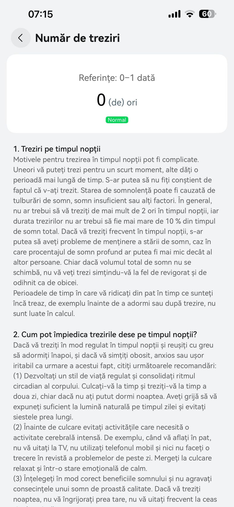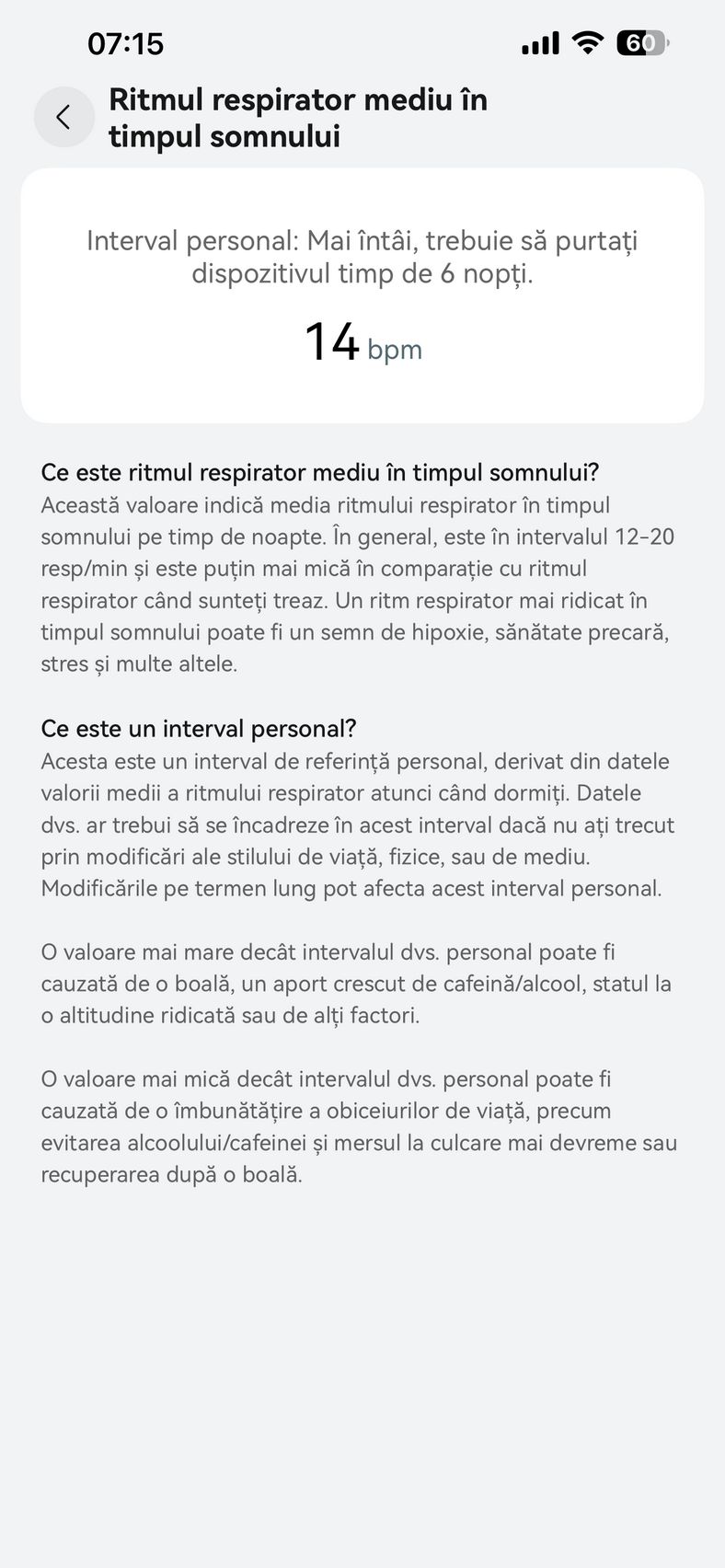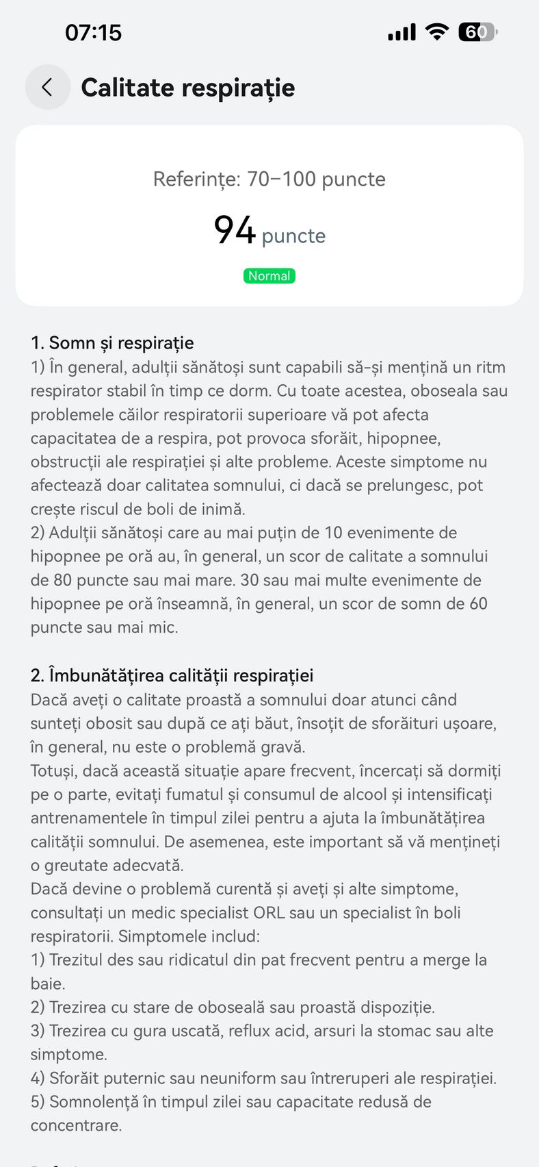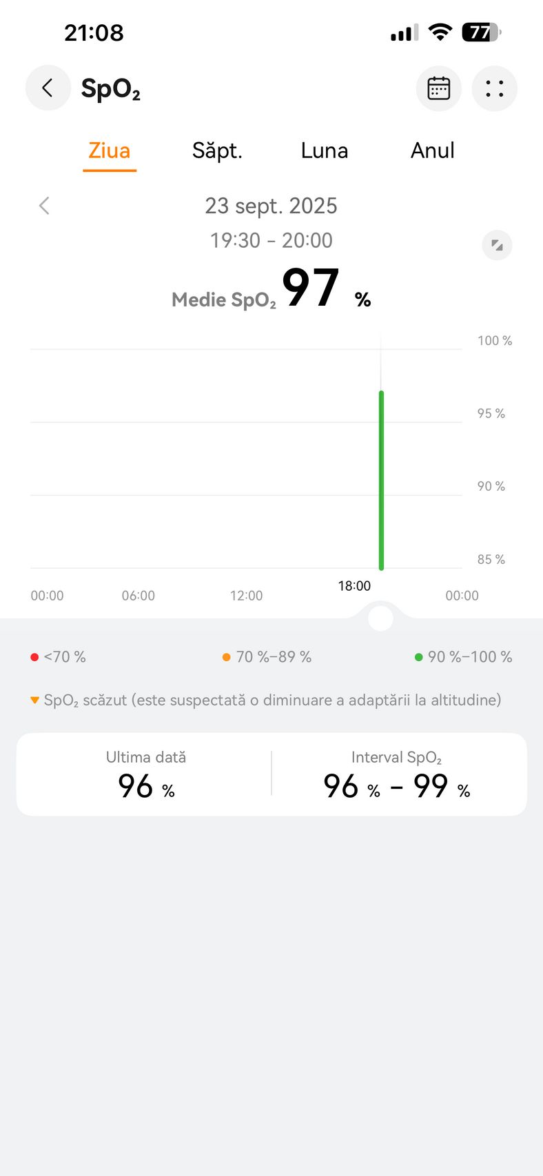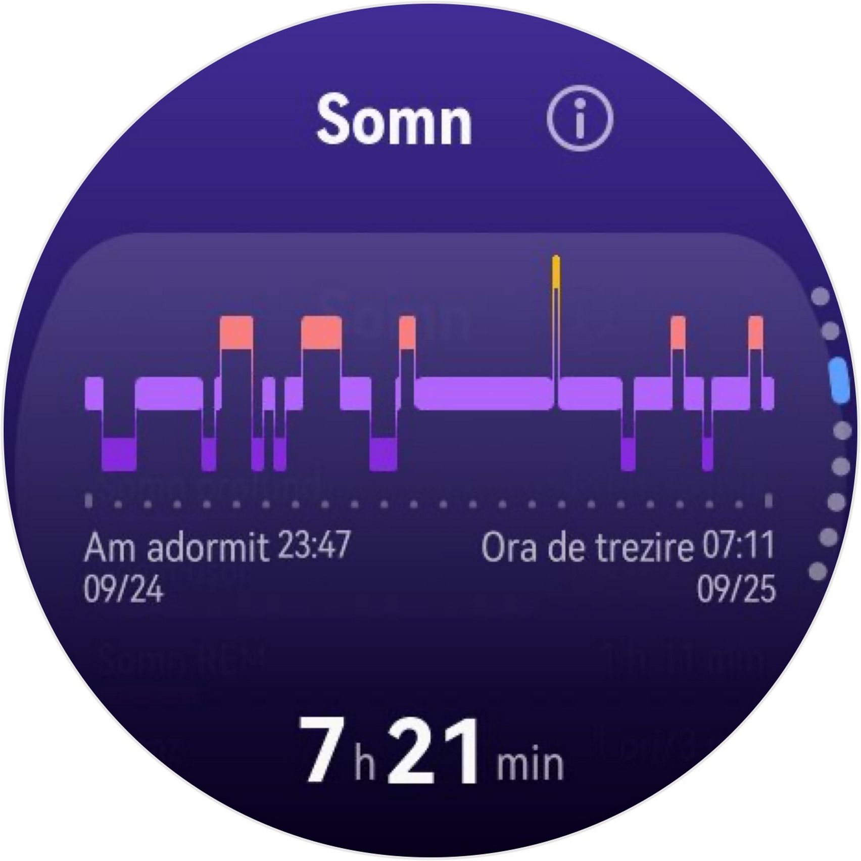 Nu am uitat nici de somn și am prins cam 6h 10m la ultima monitorizare, cu un scor de 82 de puncte. În timpul somnului mi s-a măsurat și pulsul mediu, HRV-ul mediu, somnul profund, somnul ușor, somnul REM și cât timp am fost treaz.