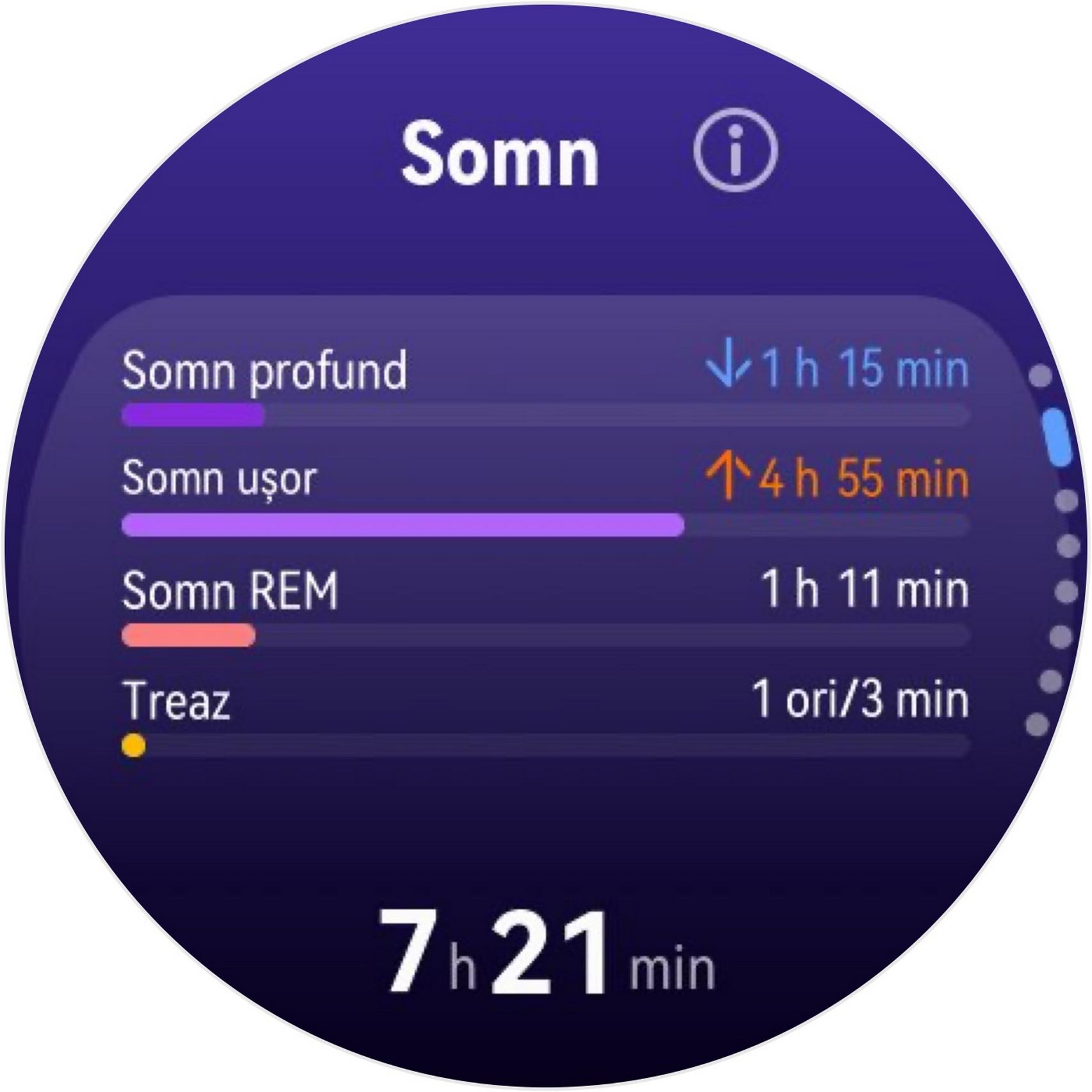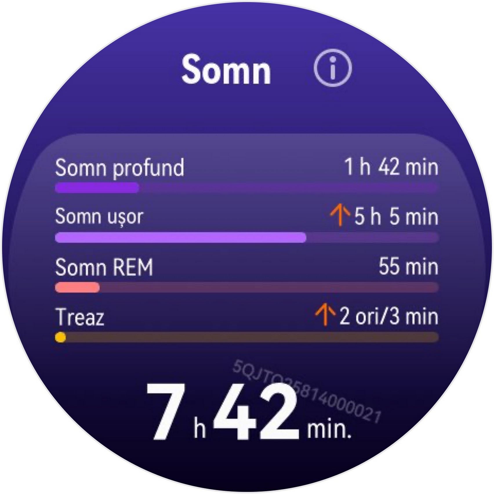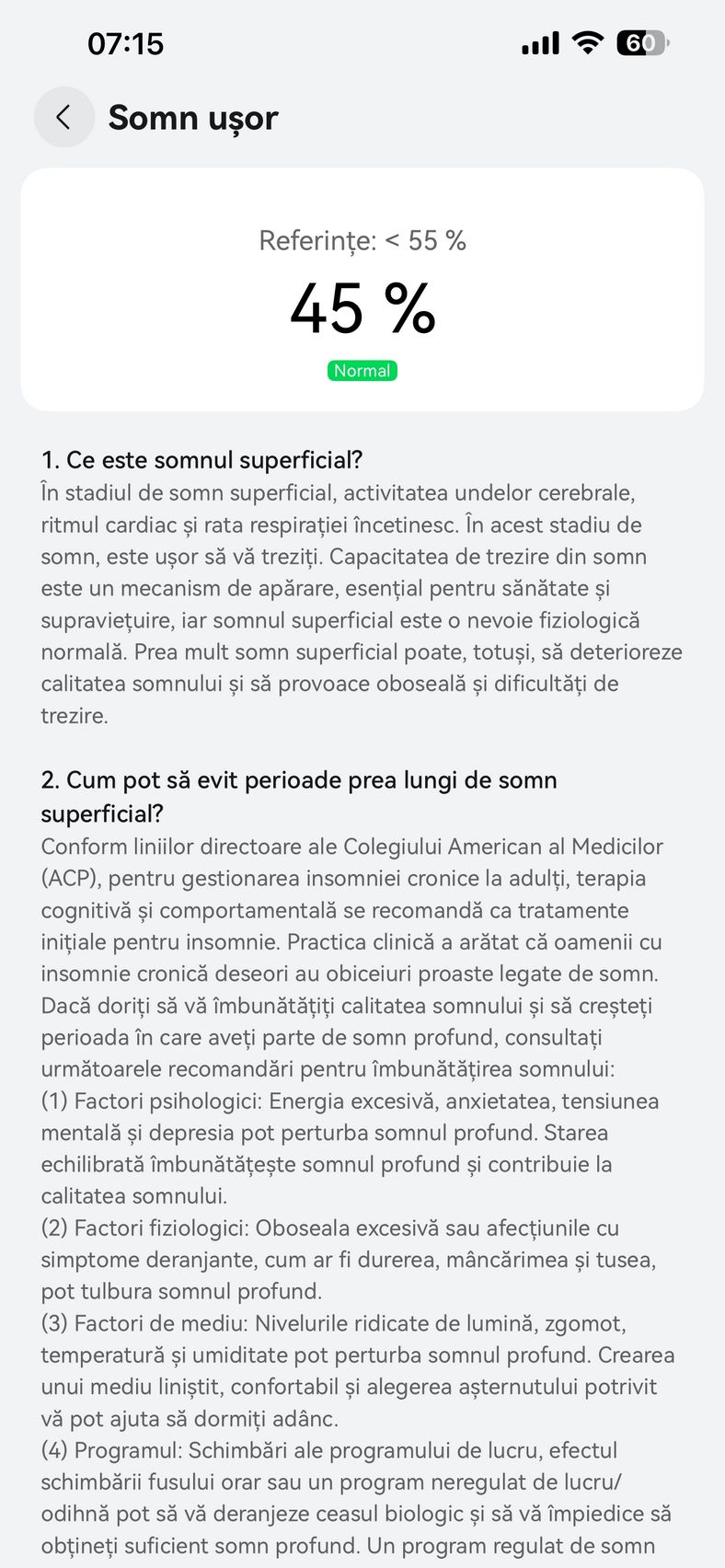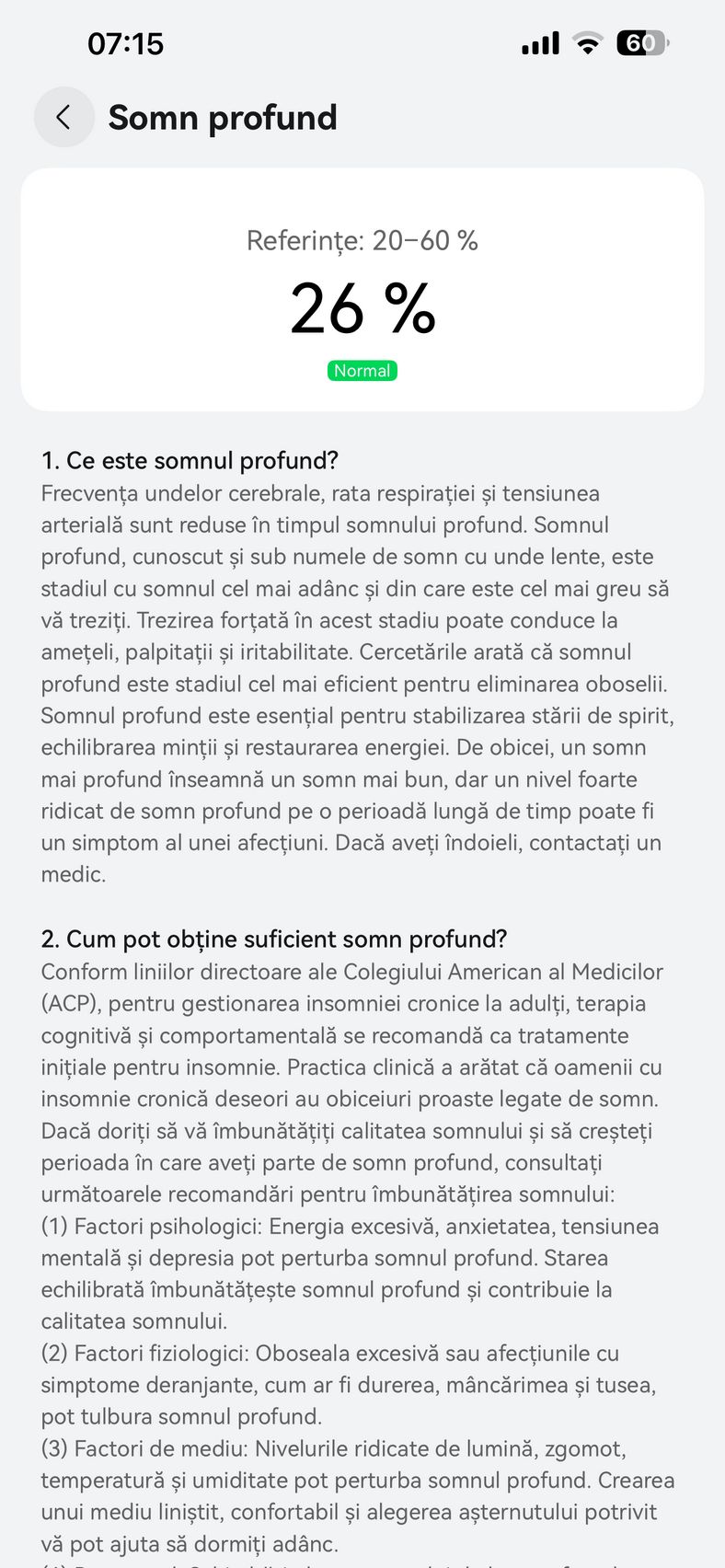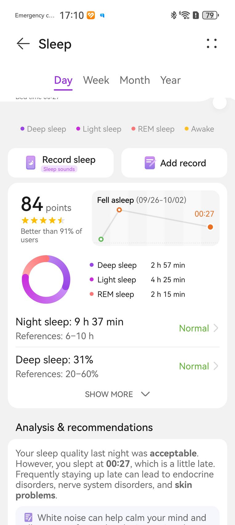 Nu am uitat nici de somn și am prins cam 6h 10m la ultima monitorizare, cu un scor de 82 de puncte. În timpul somnului mi s-a măsurat și pulsul mediu, HRV-ul mediu, somnul profund, somnul ușor, somnul REM și cât timp am fost treaz.
