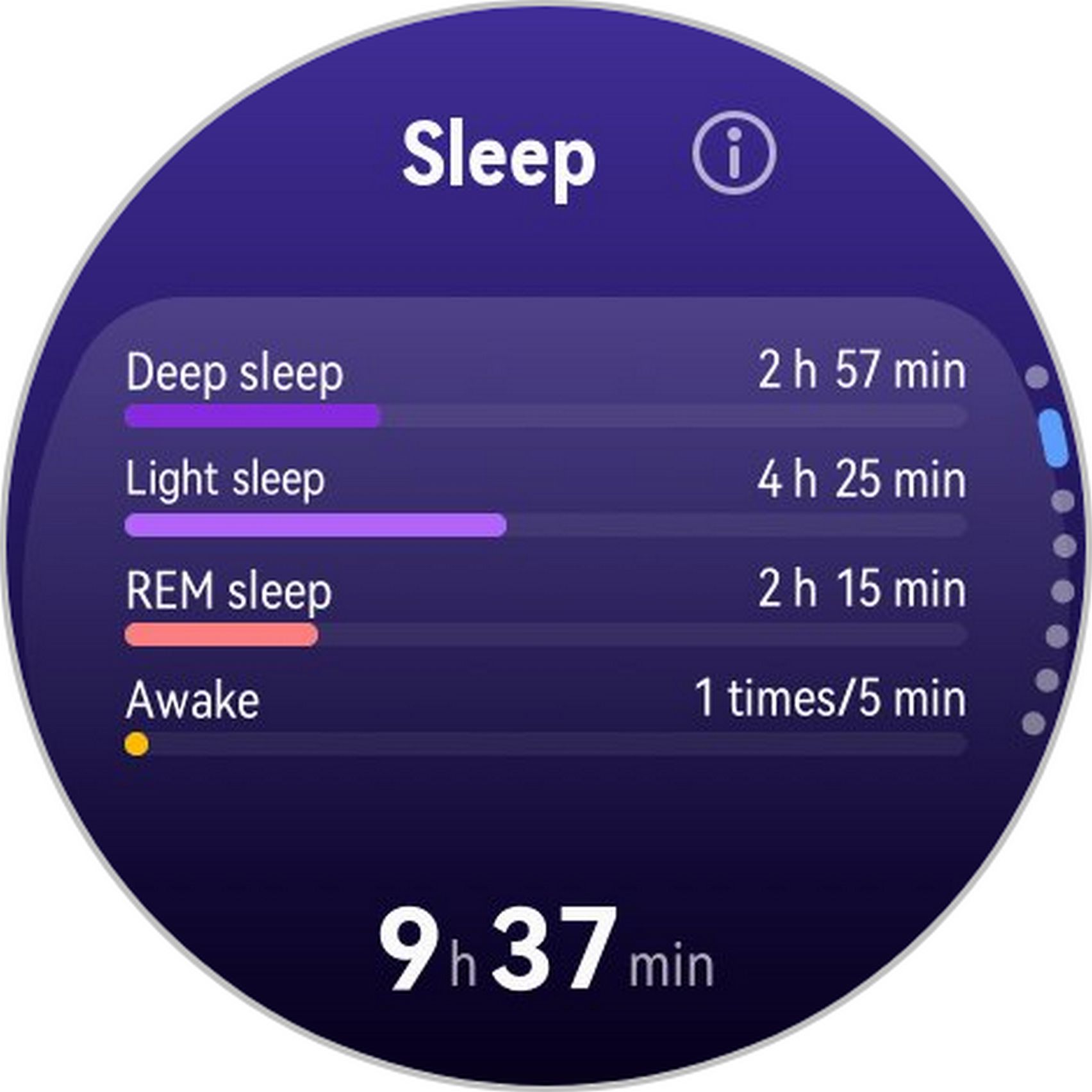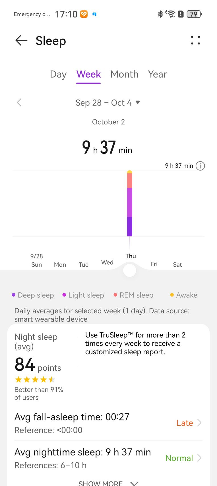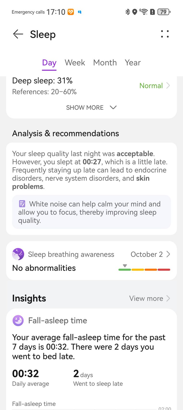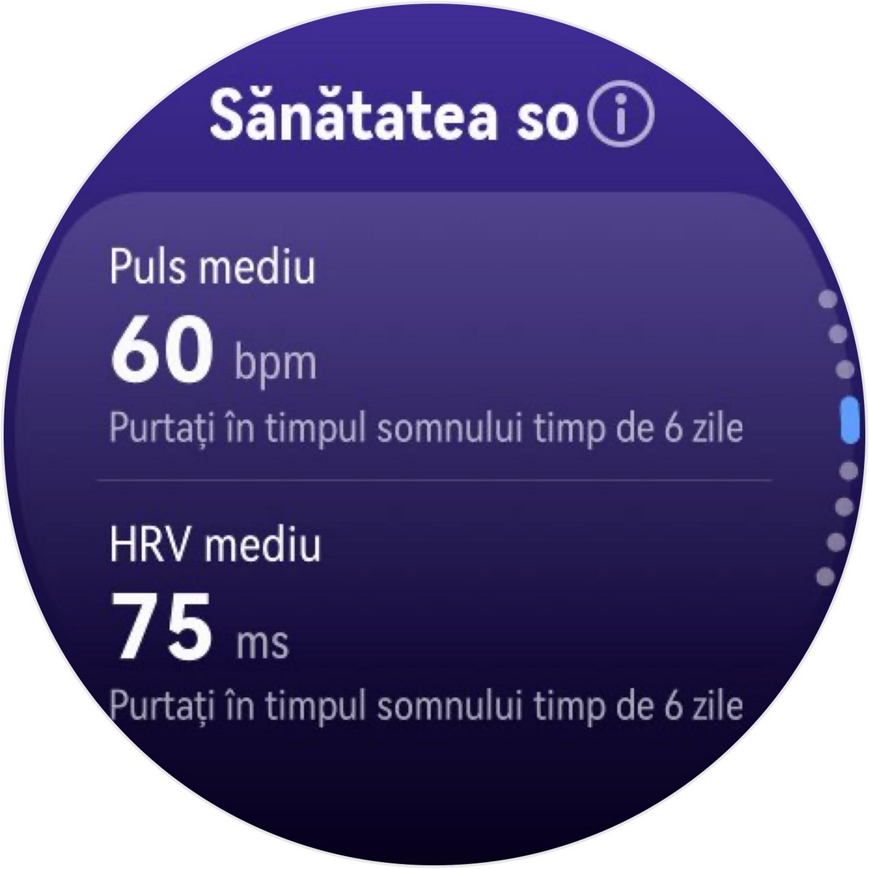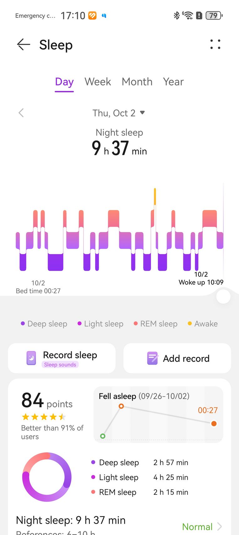 Nu am uitat nici de somn și am prins cam 6h 10m la ultima monitorizare, cu un scor de 82 de puncte. În timpul somnului mi s-a măsurat și pulsul mediu, HRV-ul mediu, somnul profund, somnul ușor, somnul REM și cât timp am fost treaz.