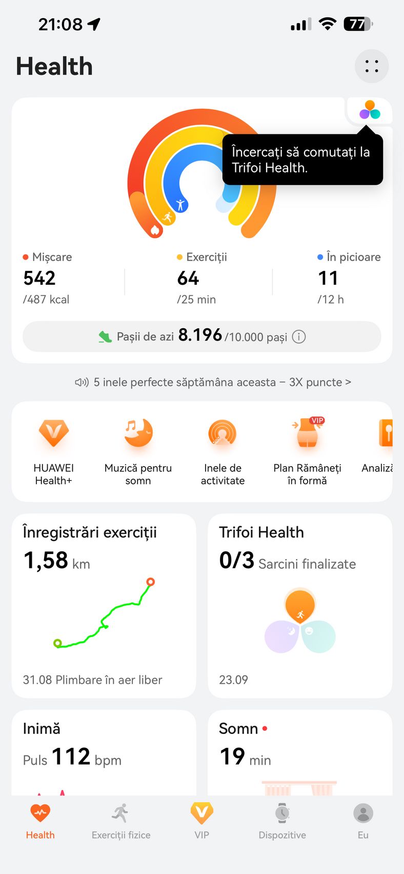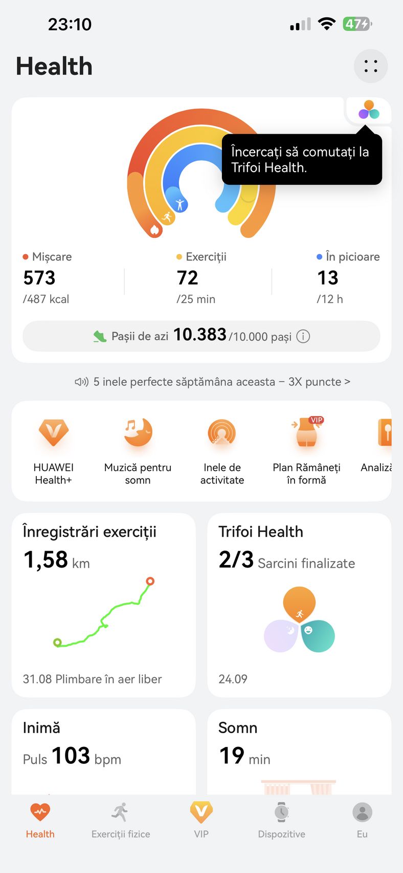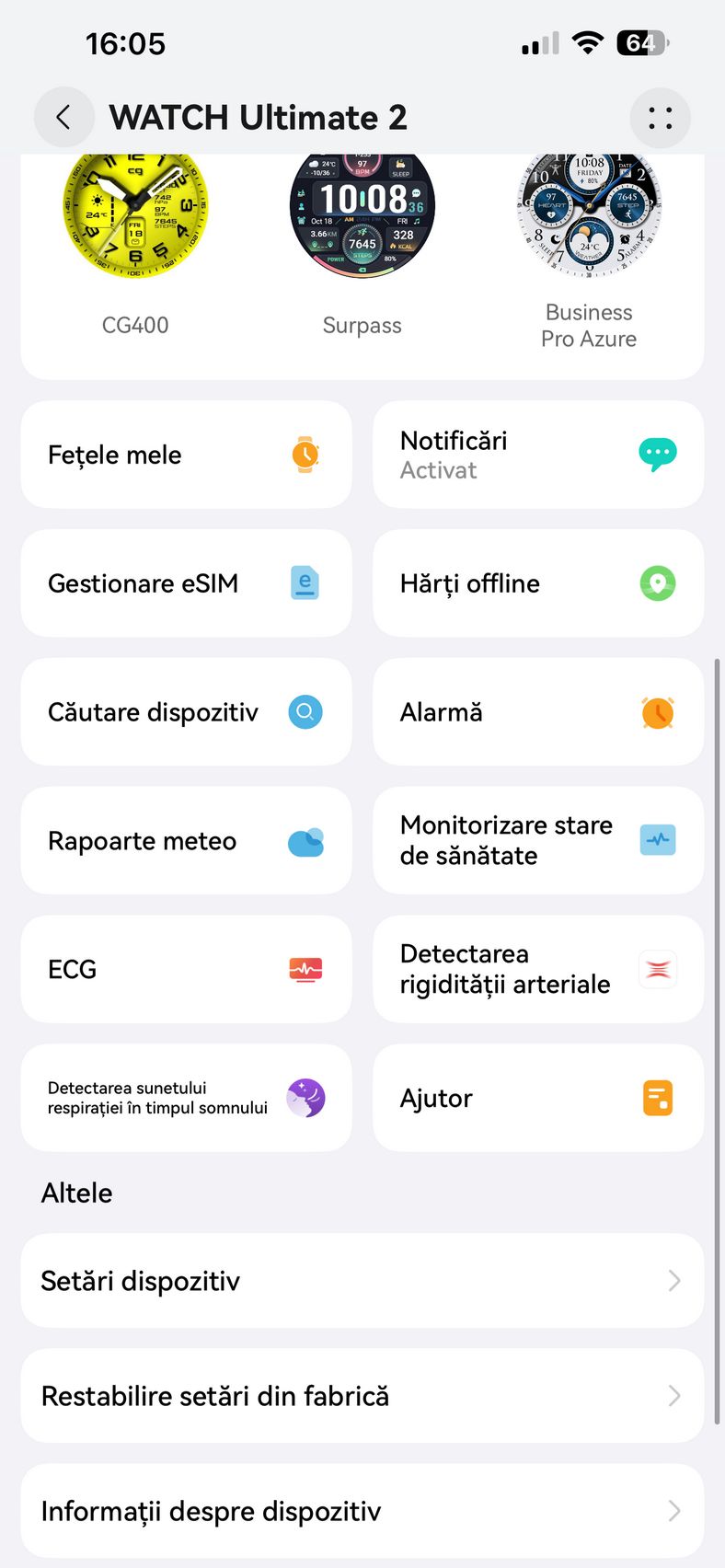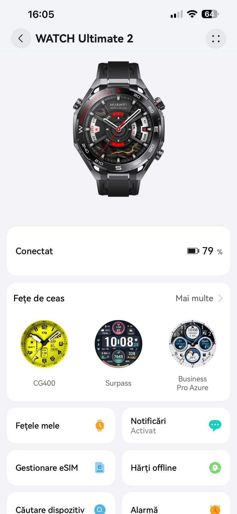 Pe telefon am utilizat aplicația HUAWEI Health, disponibilă pe iOS și Android, care centralizează toate funcțiile esențiale: personalizarea watchface-urilor, monitorizarea parametrilor de sănătate și care prin abonamentul Health+, mai aduce acces la cursuri premium, planuri de fitness, programe de meditație, muzică pentru somn, analiză nutrițională și exerciții de respirație.