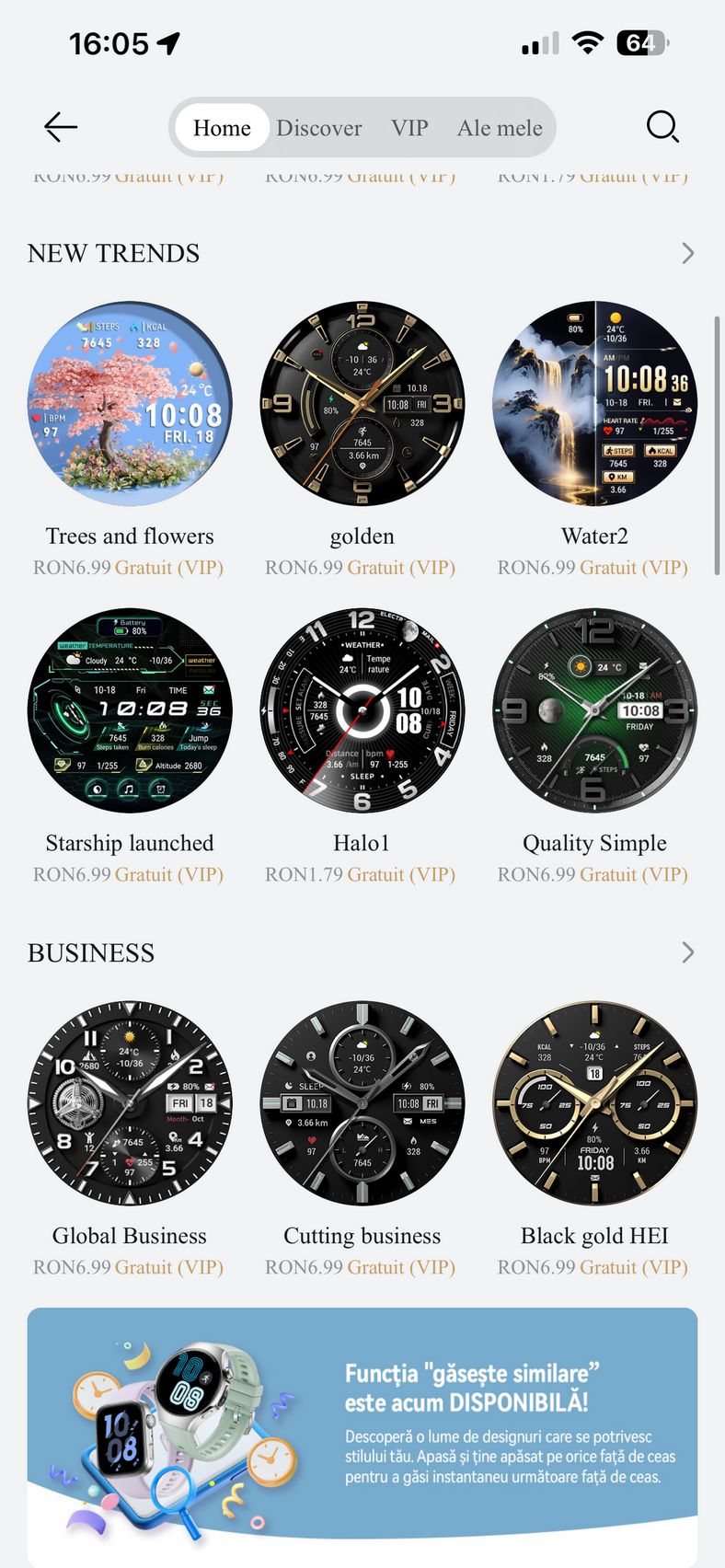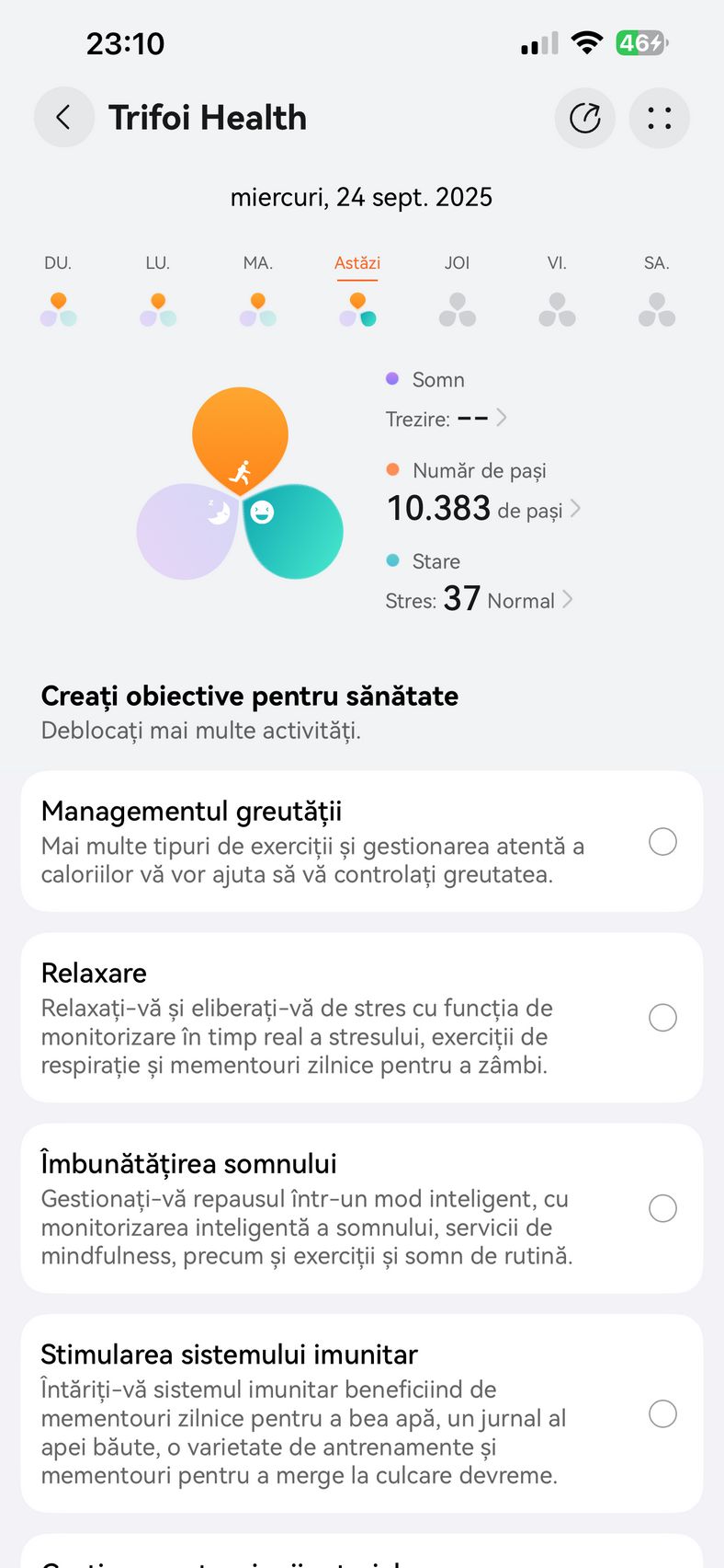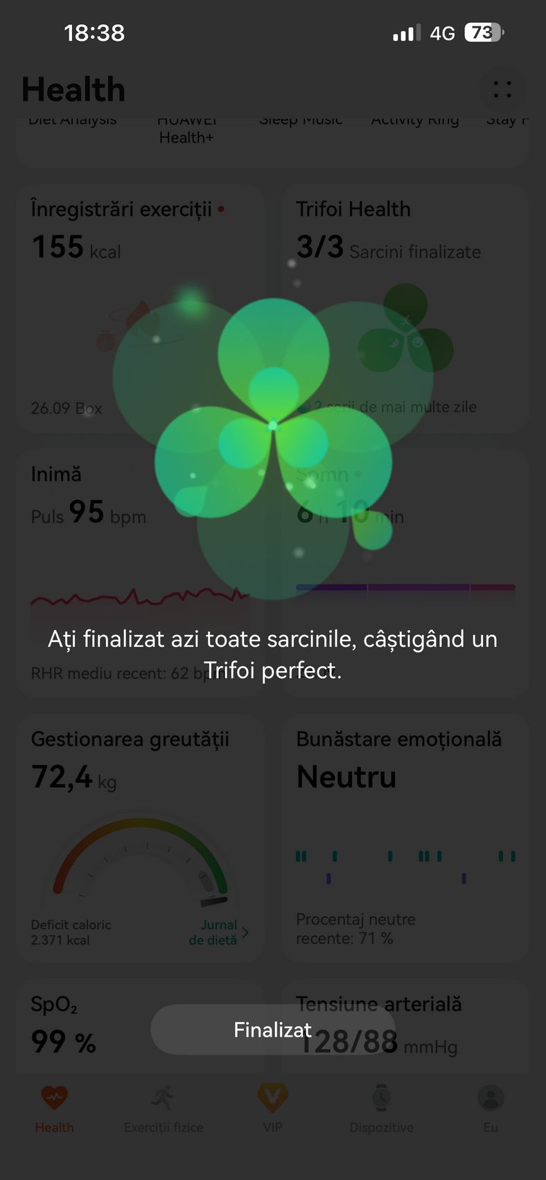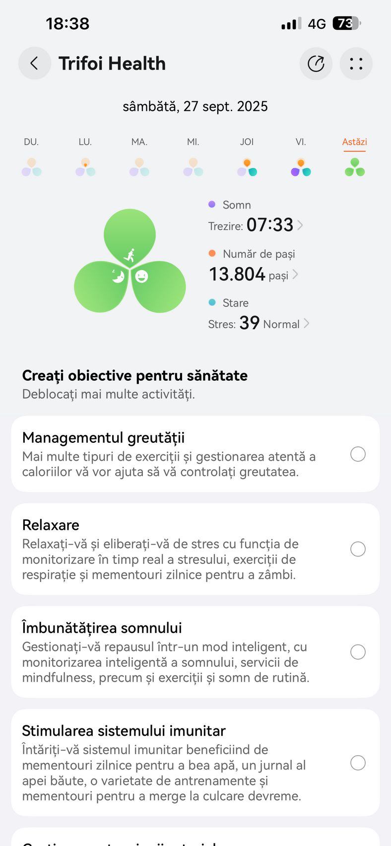 Pe telefon am utilizat aplicația HUAWEI Health, disponibilă pe iOS și Android, care centralizează toate funcțiile esențiale: personalizarea watchface-urilor, monitorizarea parametrilor de sănătate și care prin abonamentul Health+, mai aduce acces la cursuri premium, planuri de fitness, programe de meditație, muzică pentru somn, analiză nutrițională și exerciții de respirație.