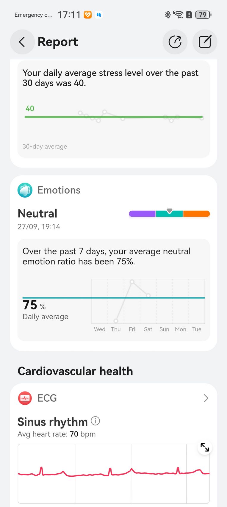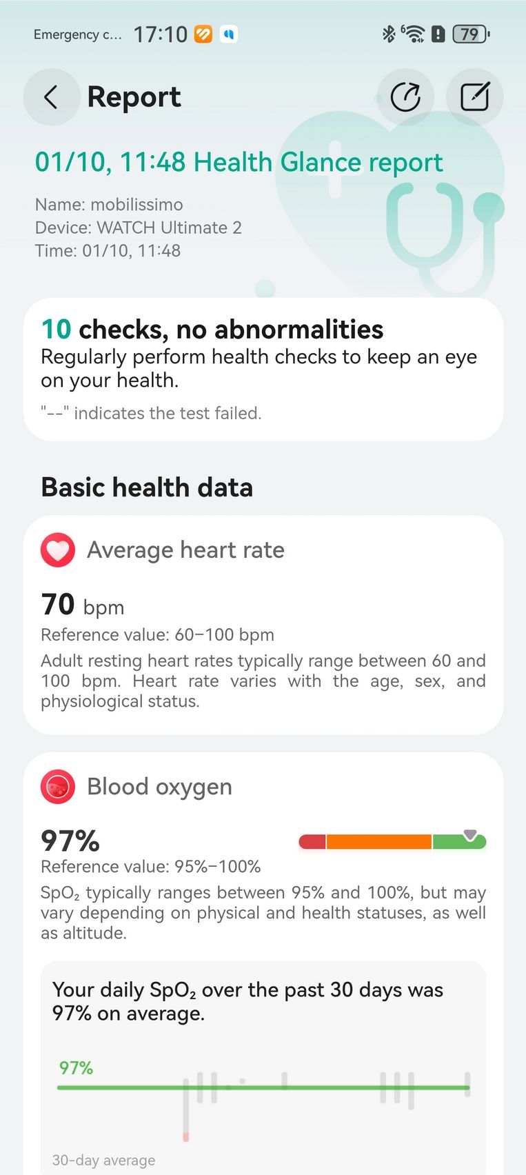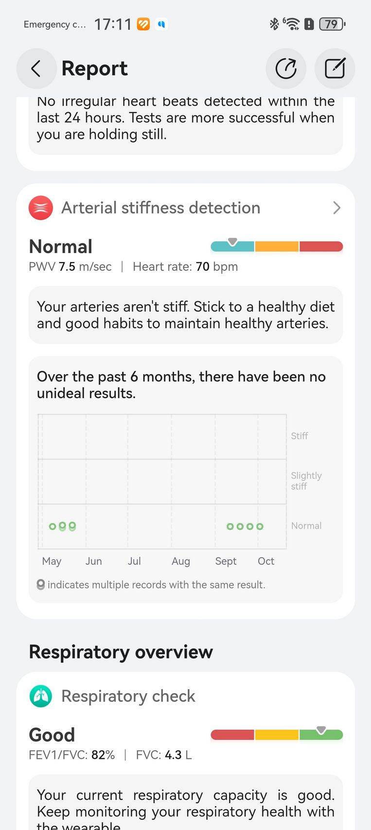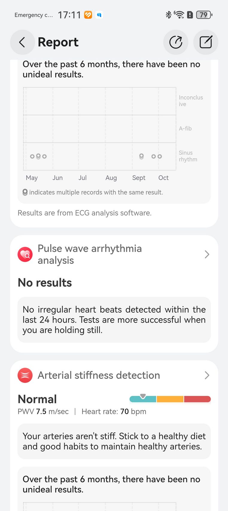 Am aflat pe lângă cum stau cu pulsul, EKG-ul, SpO2-ul și care este starea mea emoțională, care e în strictă legătură cu nivelul de stres. Bunăstarea mea emoțională a fost plăcută, emoții relativ stabile și nivel de stres moderat. Mi-am monitorizat și temperatura la nivelul pielii, HRV-ul și spre final de testare, a venit și aplicația Pulse Wave Arrhytmia Analysis prin care mi-am analizat semnele de fibrilație atrială prin unda pulsului. La măsurătorile care sunt făcute automat nu au fost găsite anomalii.