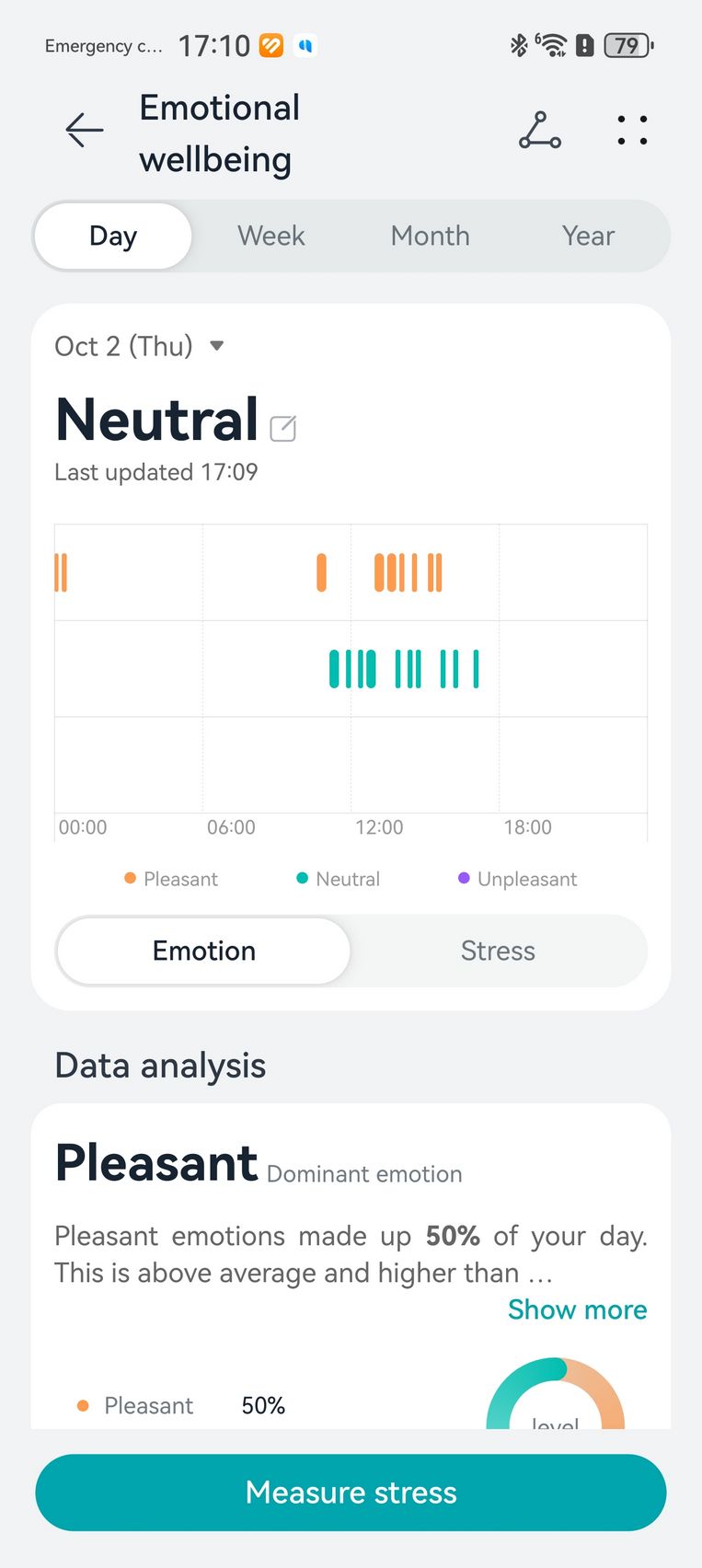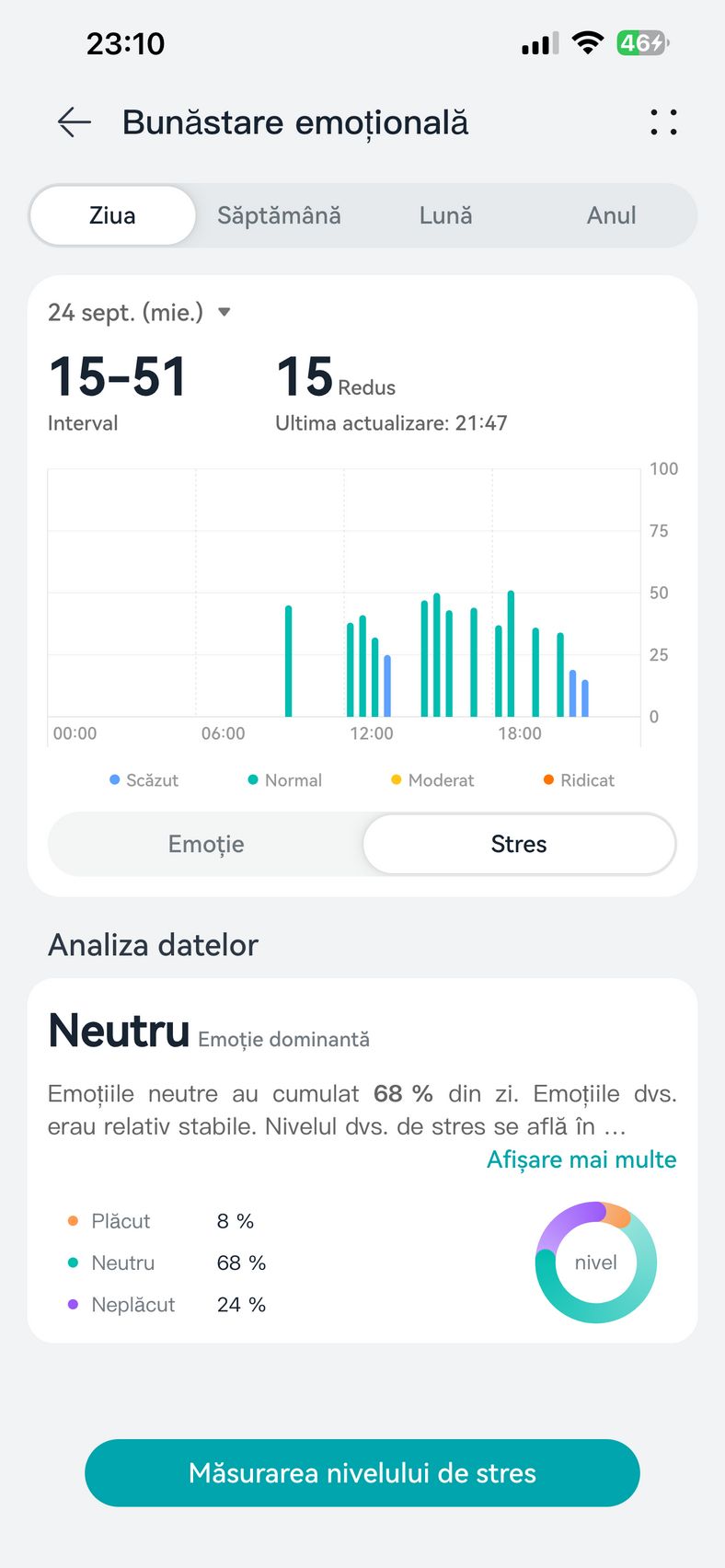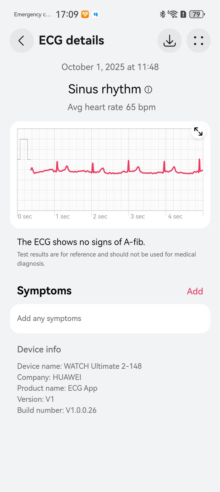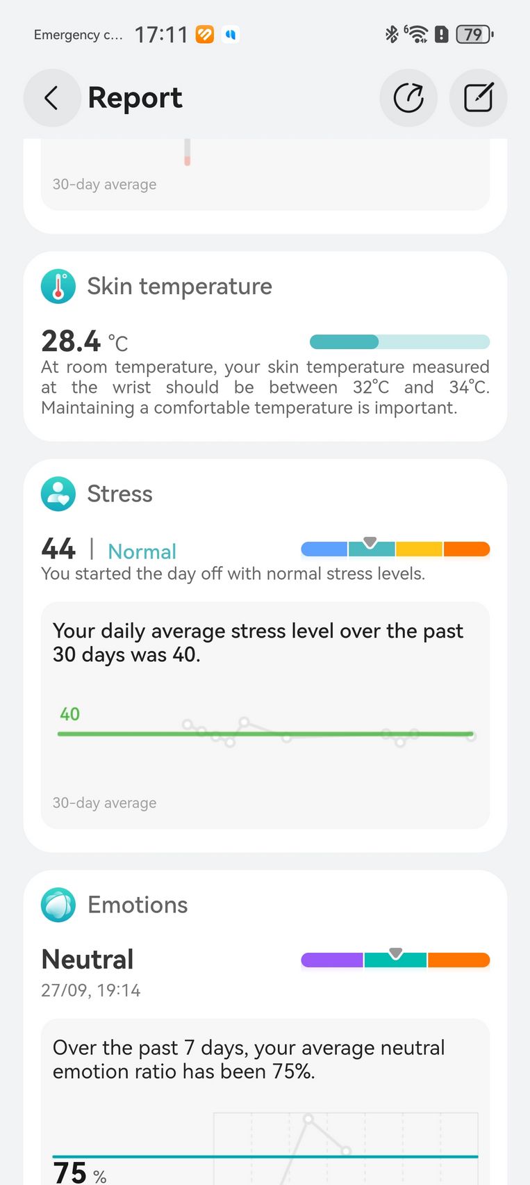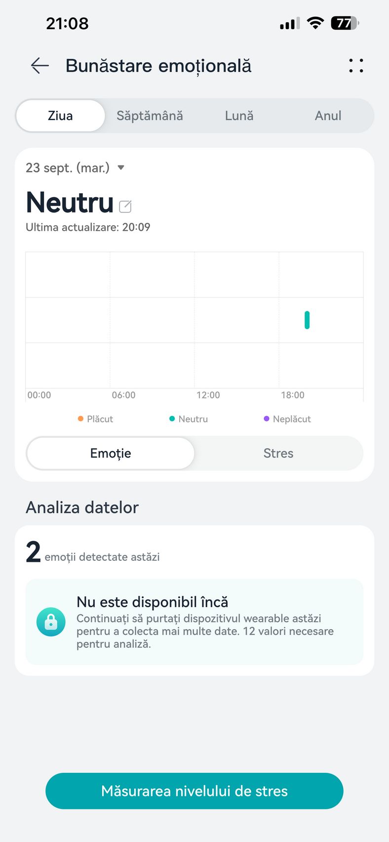 Am aflat pe lângă cum stau cu pulsul, EKG-ul, SpO2-ul și care este starea mea emoțională, care e în strictă legătură cu nivelul de stres. Bunăstarea mea emoțională a fost plăcută, emoții relativ stabile și nivel de stres moderat. Mi-am monitorizat și temperatura la nivelul pielii, HRV-ul și spre final de testare, a venit și aplicația Pulse Wave Arrhytmia Analysis prin care mi-am analizat semnele de fibrilație atrială prin unda pulsului. La măsurătorile care sunt făcute automat nu au fost găsite anomalii.