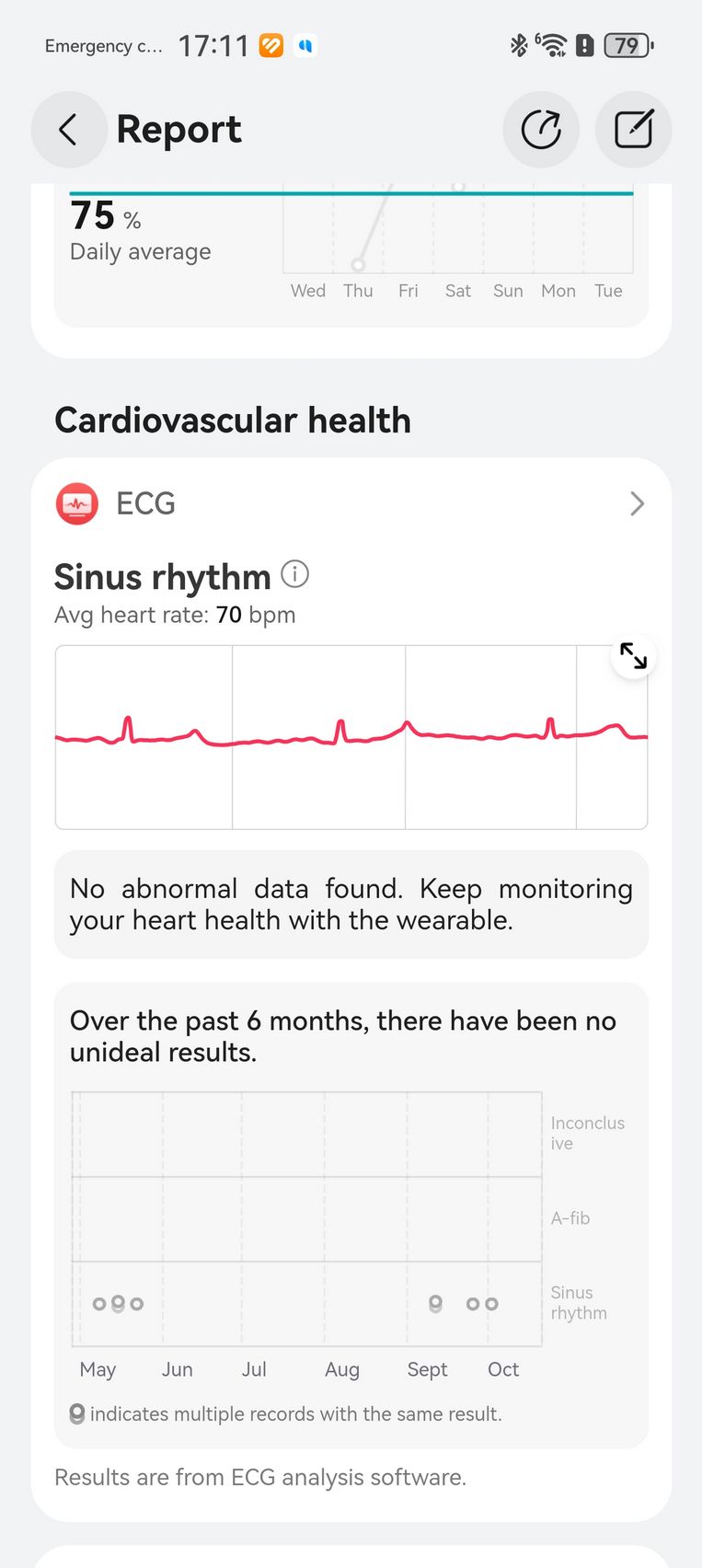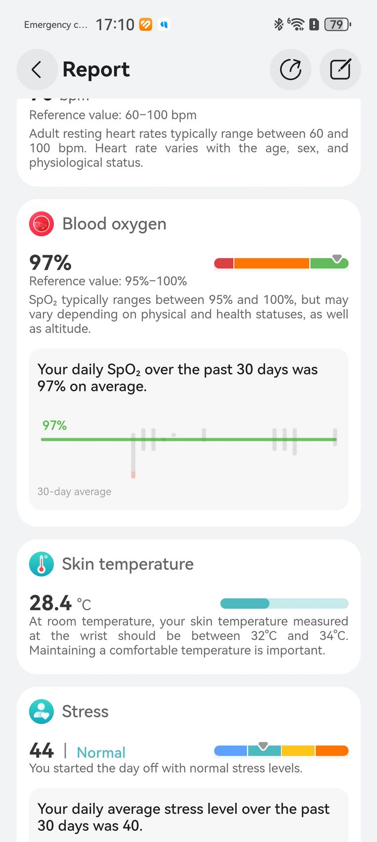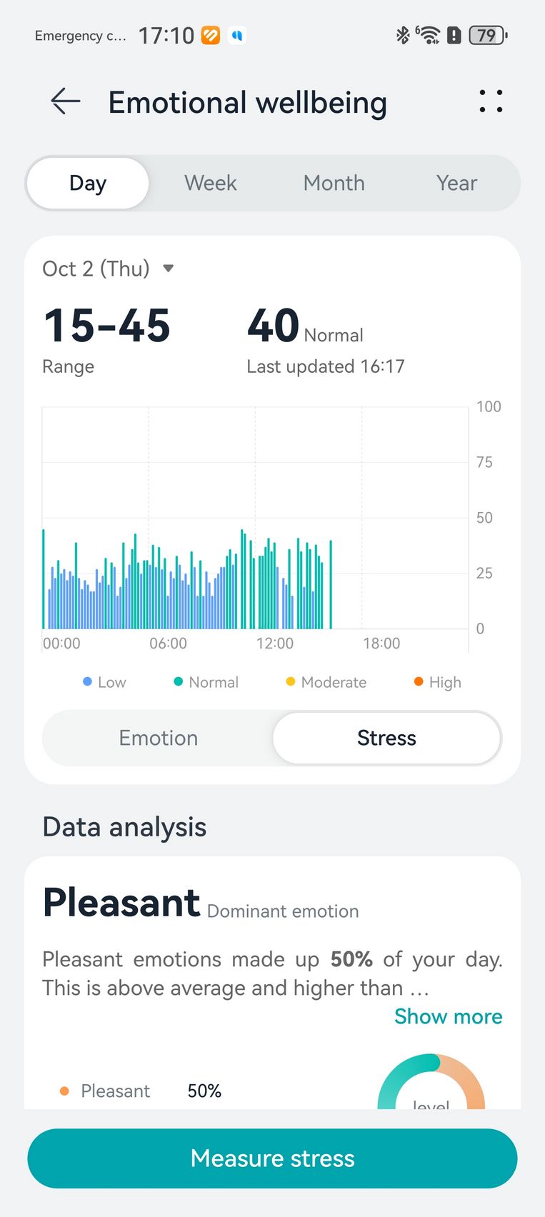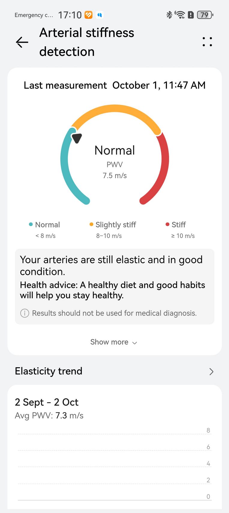 Am aflat pe lângă cum stau cu pulsul, EKG-ul, SpO2-ul și care este starea mea emoțională, care e în strictă legătură cu nivelul de stres. Bunăstarea mea emoțională a fost plăcută, emoții relativ stabile și nivel de stres moderat. Mi-am monitorizat și temperatura la nivelul pielii, HRV-ul și spre final de testare, a venit și aplicația Pulse Wave Arrhytmia Analysis prin care mi-am analizat semnele de fibrilație atrială prin unda pulsului. La măsurătorile care sunt făcute automat nu au fost găsite anomalii.
