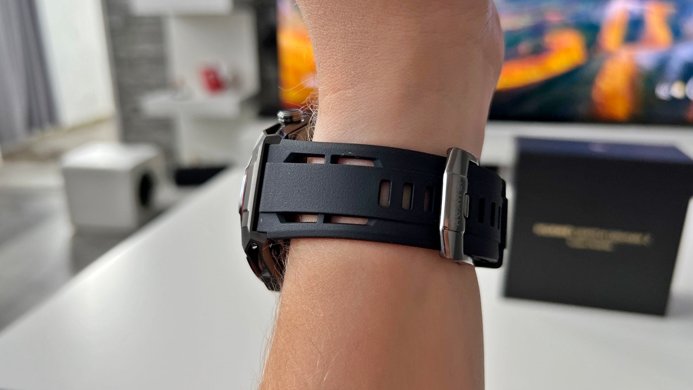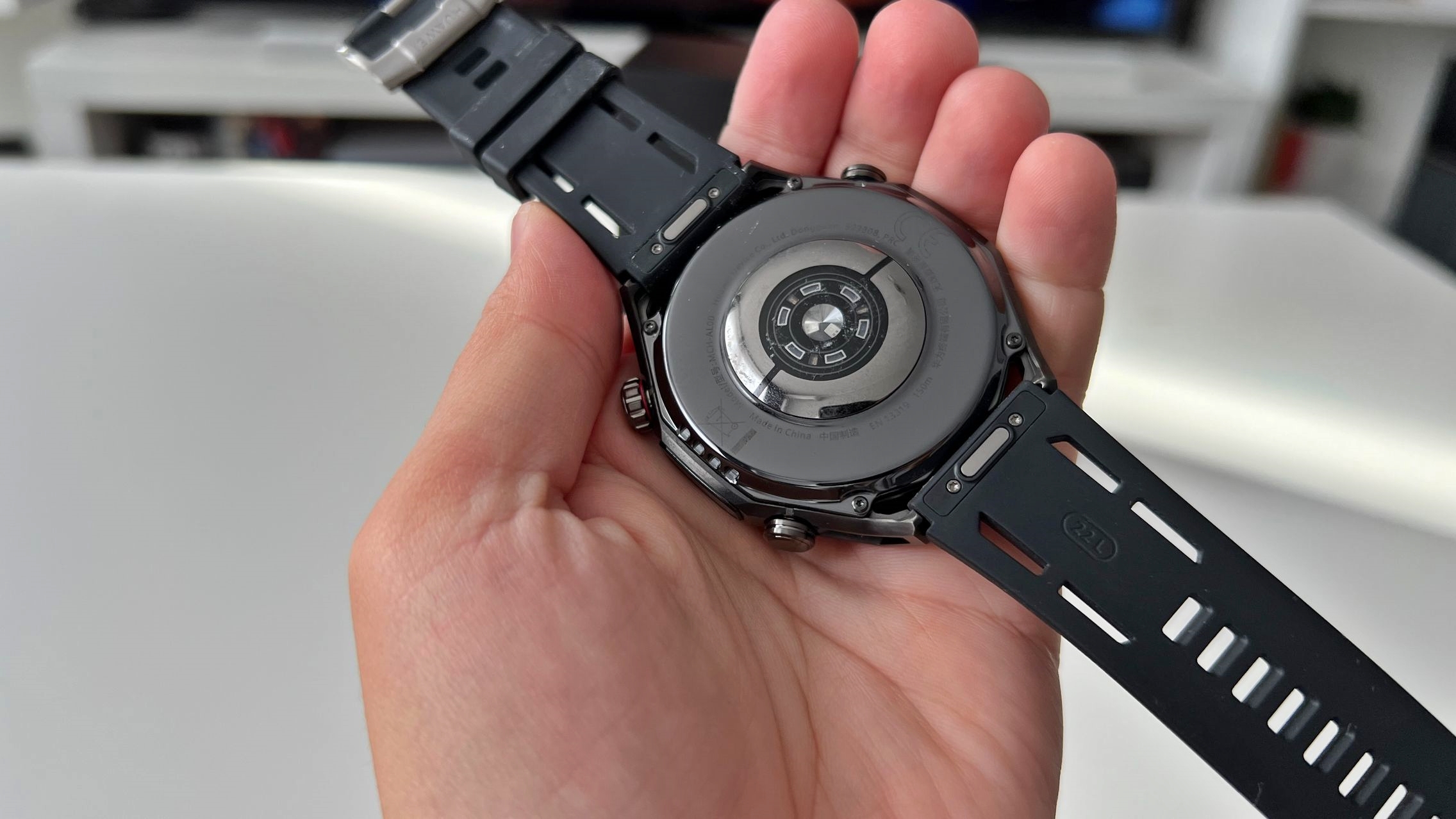 Are 80,5 grame, acolo unde predecesorul avea 76 grame. Măsoară 48.5 x 48.5 x 12.9mm vs. 48.5 x 48.5 x 13mm. Dacă alegi varianta pe albastru, aceea are 47.8 x 47.8 x 12.9 mm, mai compactă. Ca materiale HUAWEI nu face sacrificii aici și m-am bucurat să văd că s-a păstrat carcasa din zirconium. Este de fapt un aliaj de Liquid Metal Amorpous Zirconium și un strat de protecție ultra-rigid la mijloc.