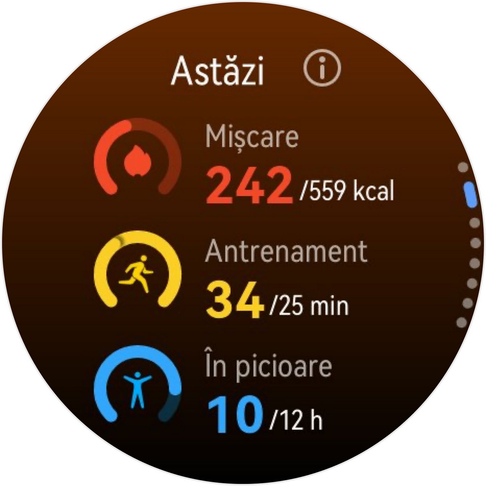 Gesturile swipe le-am folosit cel mai mult și astfel am trecut printre secțiuni precum AI Voice, Calendar, Meteo sau Music, iar de la dreapta spre stânga am găsit secțiunile dedicate activității fizice, stării emoționale și antrenamentelor. Ordinea cardurilor poate fi schimbată.