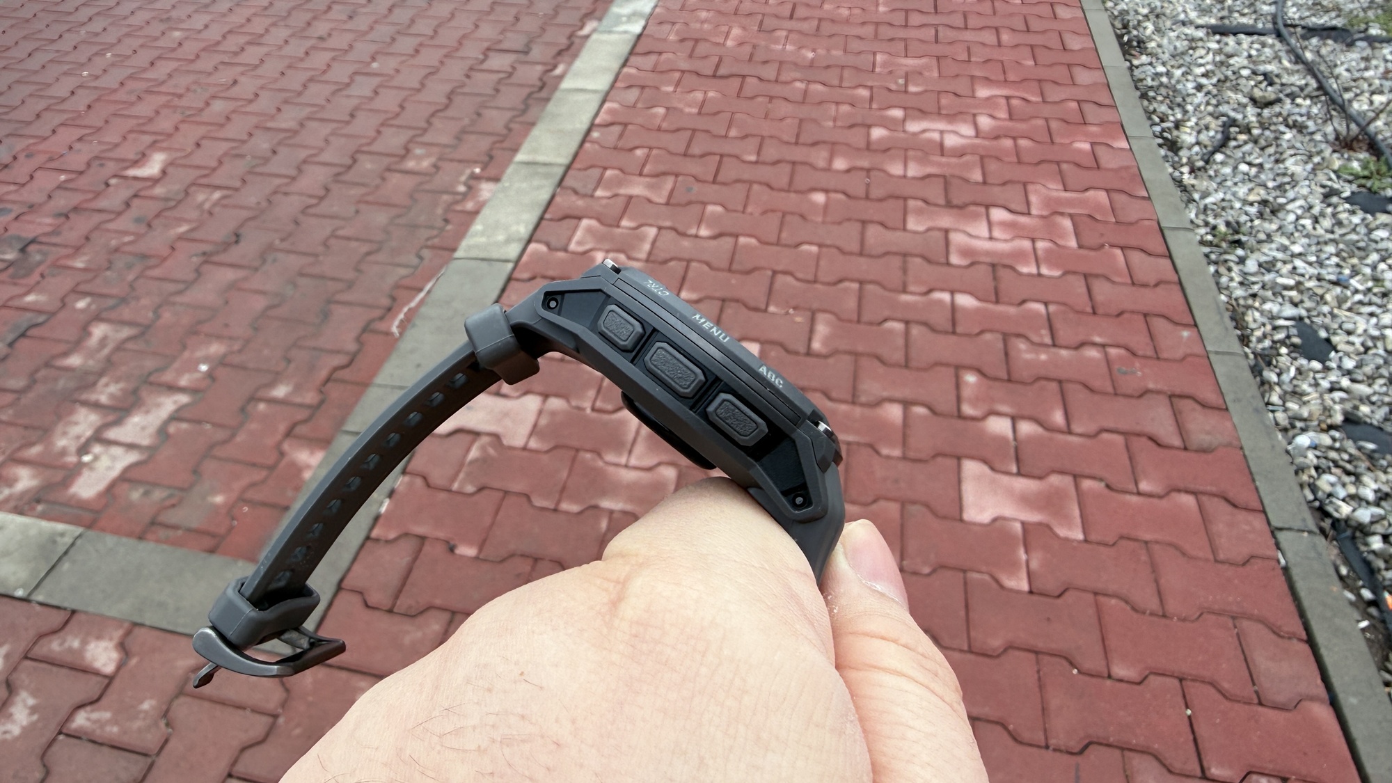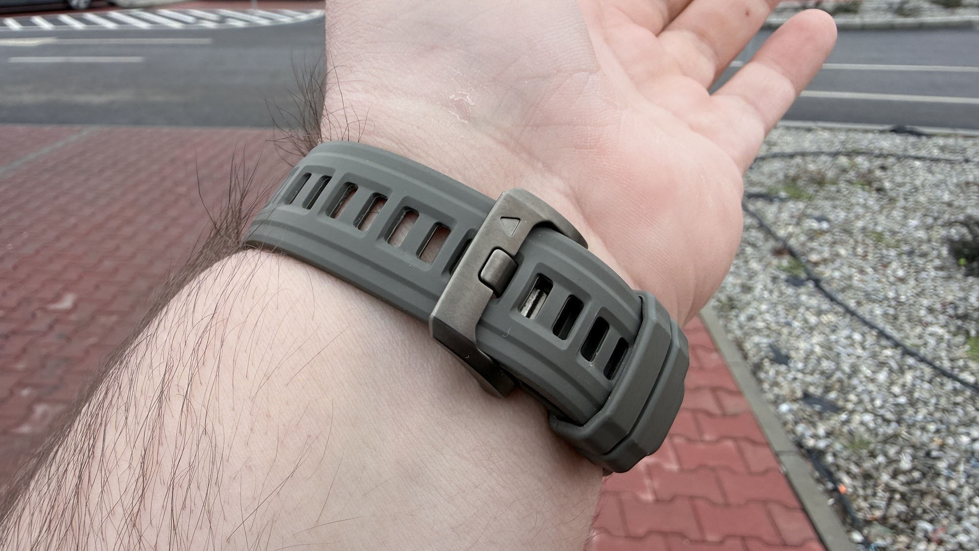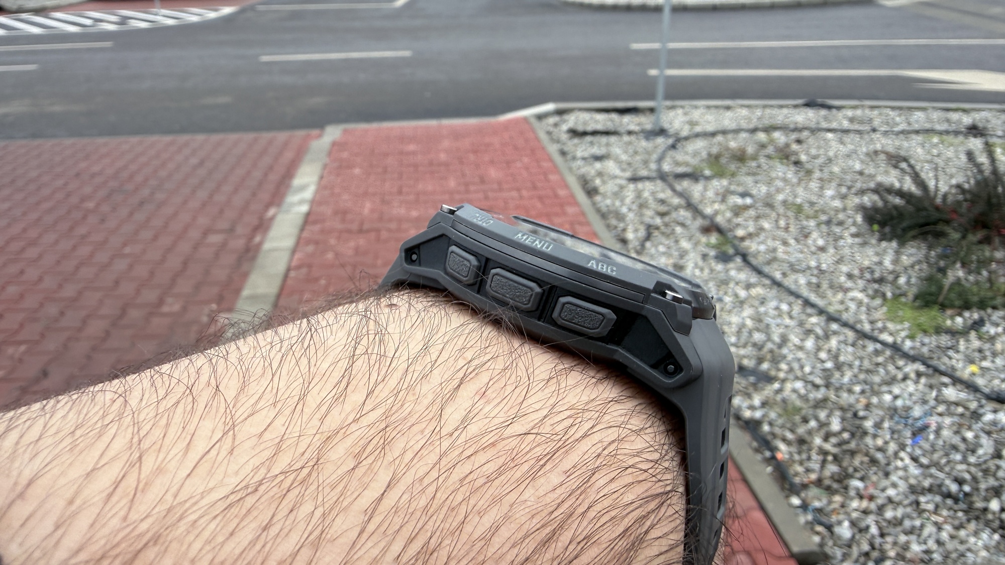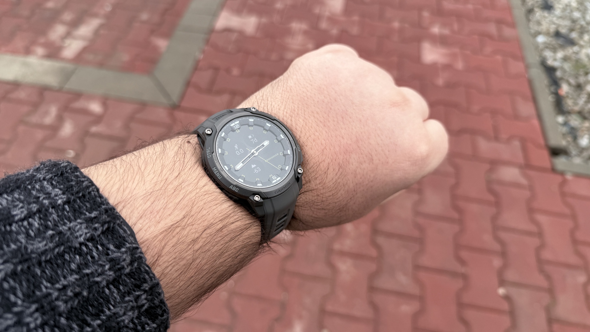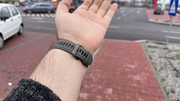 În partea laterală regăsim cele cinci butoane clasice Garmin, pe care voi reveni mai jos, iar carcasa în sine păstrează estetică robustă, specifică seriei. Apare și o lanternă LED în partea de sus, ce poate fi ușor de accesat printr-o dublă-apăsare pe butonul din stânga sus. Cureaua din silicon inclusă e confortabilă, suficient de flexibilă și oferă o prindere bună.