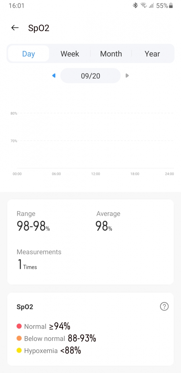 Marele bonus este clar senzorul SpO2 care este capabil să măsoare oxigenarea sângelui. Pentru acest proces va trebui să aveți cureaua strânsă pe încheietura mâinii și să nu vă mișcați pe timpul măsurării. Dacă rezultatul este egal sau mai mare cu 94%, atunci aveți o oxigenare normală.