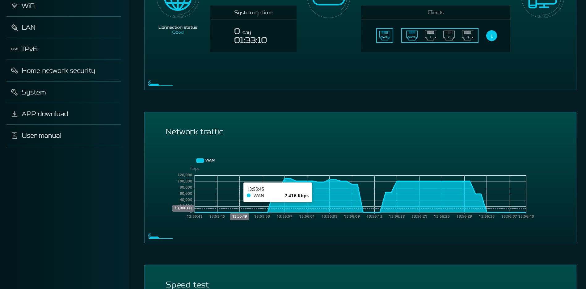 De asemenea, fiind un router flagship, asta înseamnă că are și dotări hardware pe măsură la interior, iar prin asta mă refer la procesorul quad-core ARM Cortex tactat la o frecvență de 2.0 GHz. De asemenea există și stocare 4 GB eMMC. În caz că nu am menționat, routerul funcționează în standardul 802.11 a/b/g/n/ac/ax.