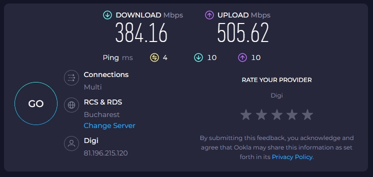 Am folosit router-ul în ultima săptămână conectat la PC, consola PlayStation 5, la televizor și am avut și un laptop Wi-Fi 6 pe mână, pe care am și realizat testele de viteză, fiind impresionat de ce poate mai ales la upload. Am atins 385 Mbps la download și 505 Mbps la upload într-unul din testele realizate, cifre excelente în raport cu abonamentul la internet Fiberlink 500 de la DIGI. Pe smartphone am urcat la 481 Mbps la download, iar pe consolă am avut nevoie de doar 5 minute pentru a descărca un joc demo de 10 GB.