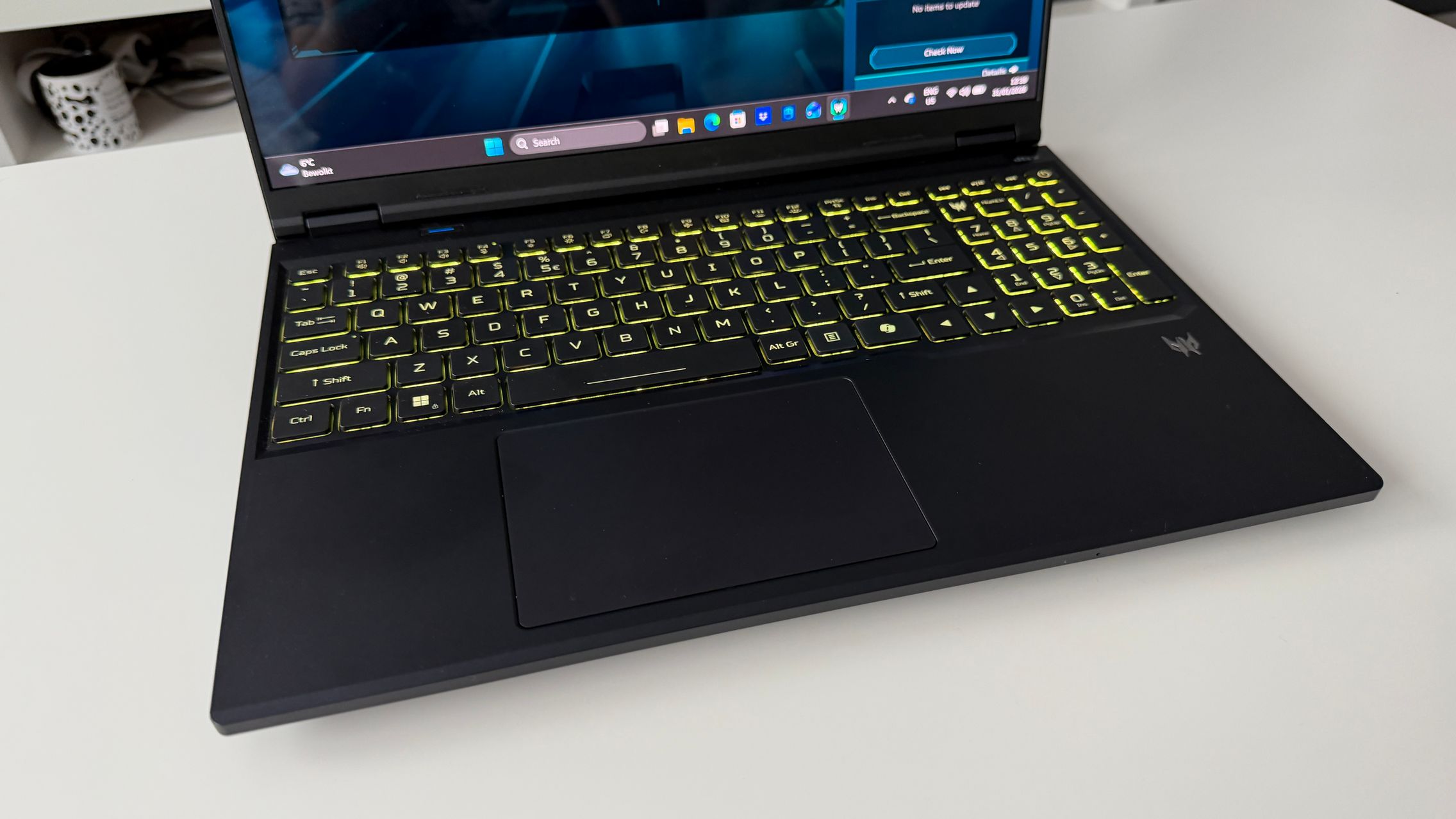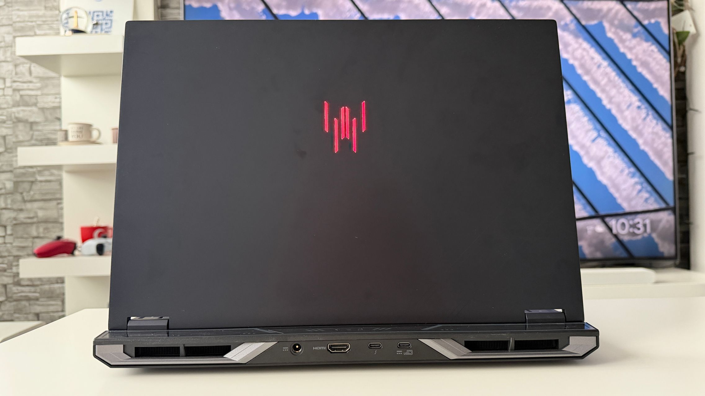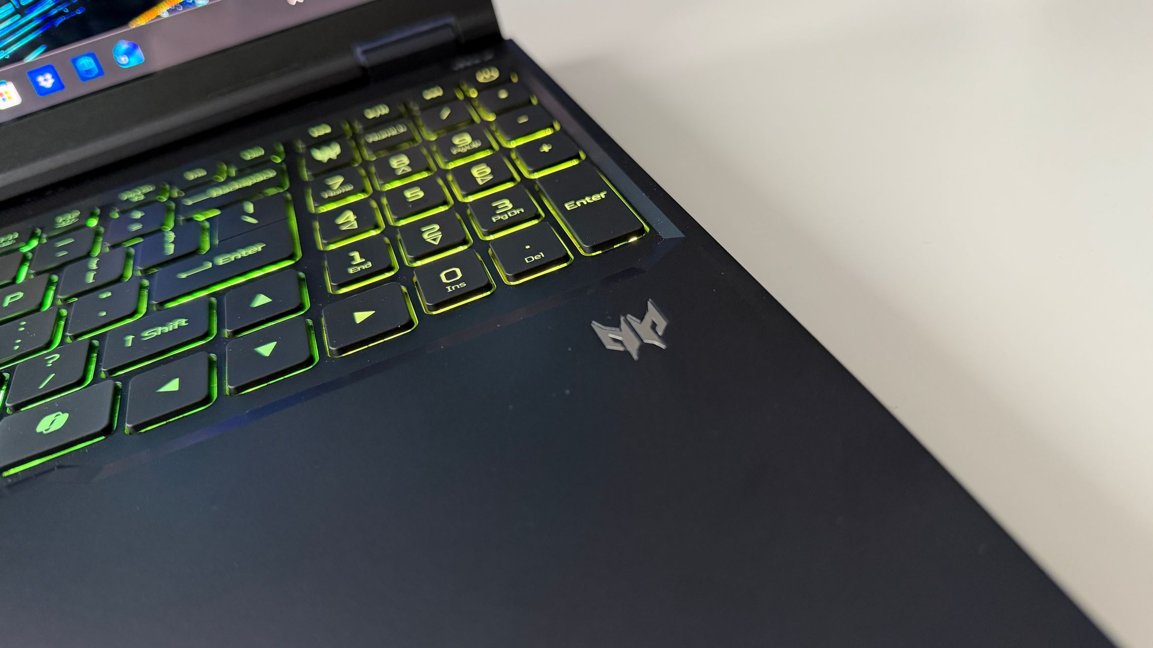 Tastatura este mare, iluminată RGB în 4 zone și include și zona NumPad. Există și butoane de gaming cu shortcut către PredatorSense. Și touchpad-ul este generos, dar nu se duce în extrem, semn că ACER știe că mulți gameri vor conecta un mouse pentru gaming mai flexibil. Ca materiale, capacul este realizat dintr-un aliaj de aluminiu care se curăță ușor de amprente, iar la mijloc tronează logo-ul Predator iluminat. Îmi place și zona spate, cu o margine transparentă și ceva elemente liniare pe care apare logo-ul NEO. Era interesant să vedem și aici iluminare RGB.