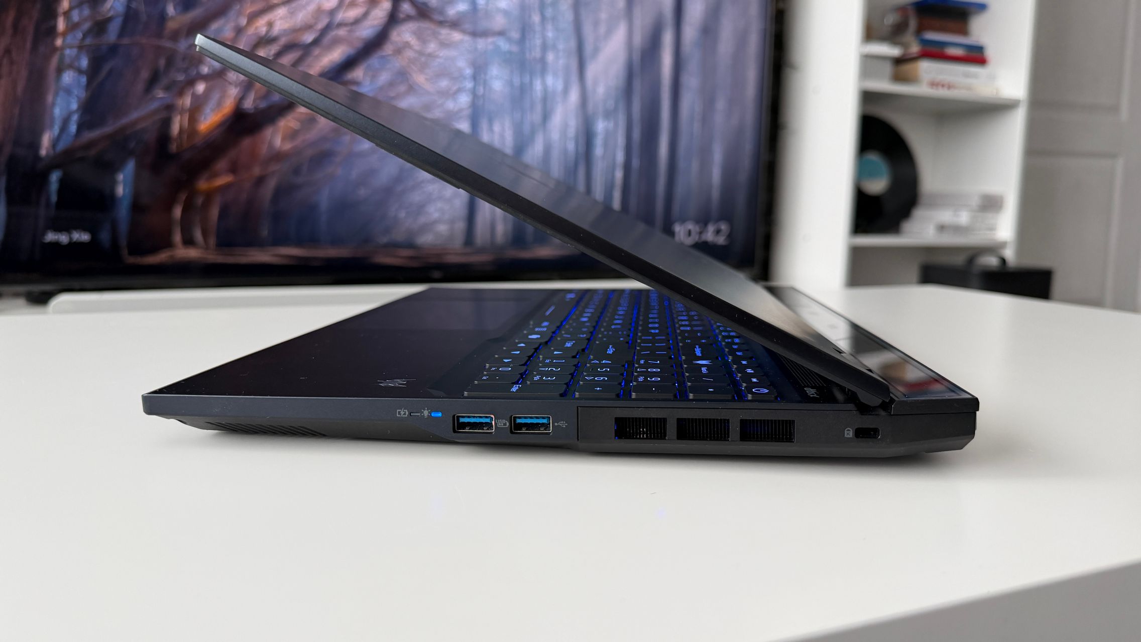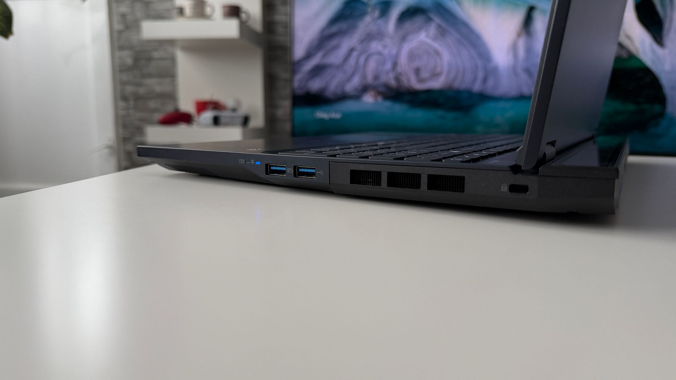 În spate sunt și câteva elemente de conectivitate, inclusiv portul de alimentare, cea mai bună plasare din punctul meu de vedere, mai ales dacă ai un birou mai îngust și nu vrei să atârne cabluri din stânga sau dreapta. Un design arătos, subtil și cu dimensiuni ceva mai generoase, semn că hardware-ul e țiplă. Laptop-ul are grosime de 26.75mm, măsoară 356.8 mm lungime și 275.5 mm lățime, având greutate de 2.7 kg.