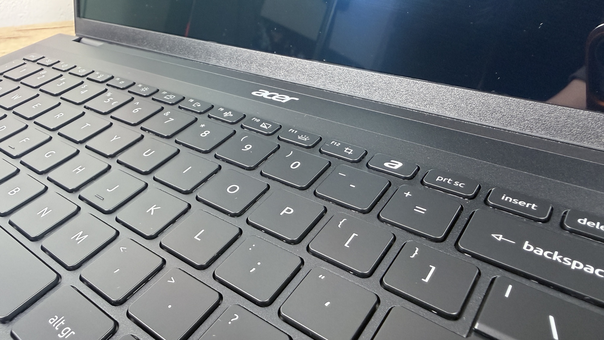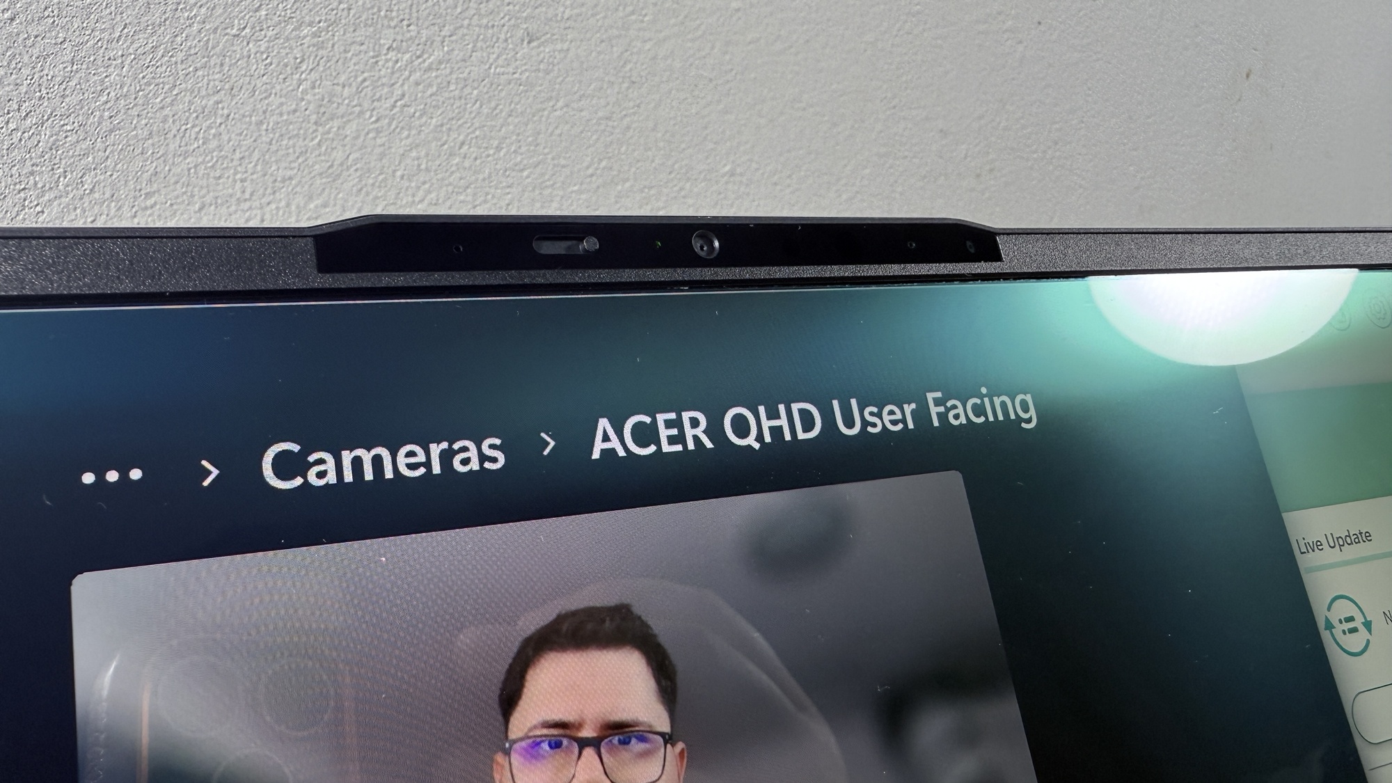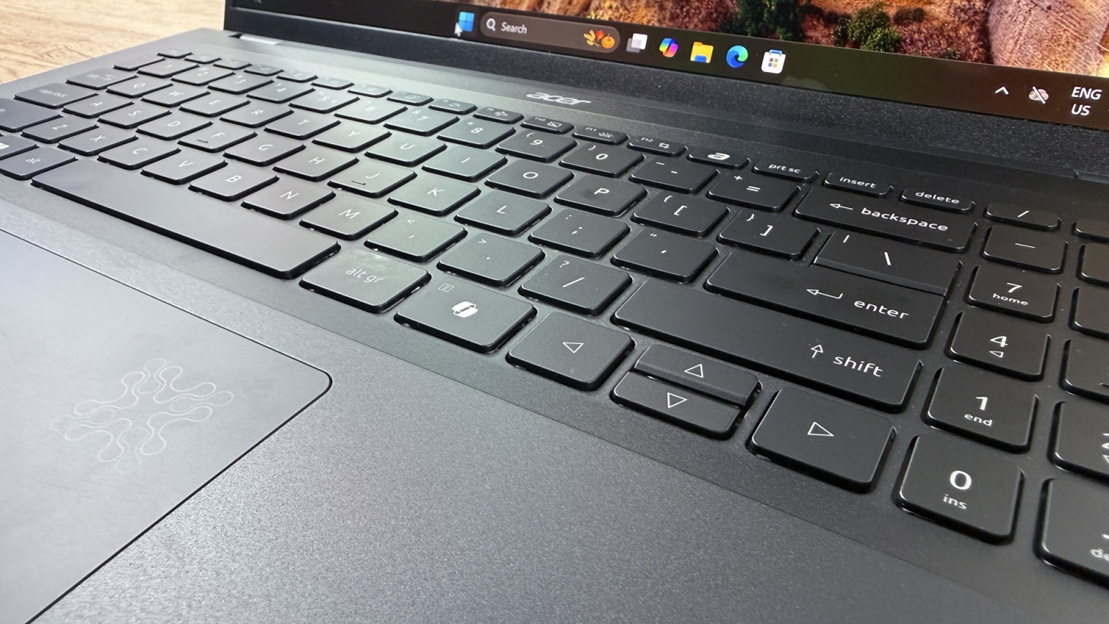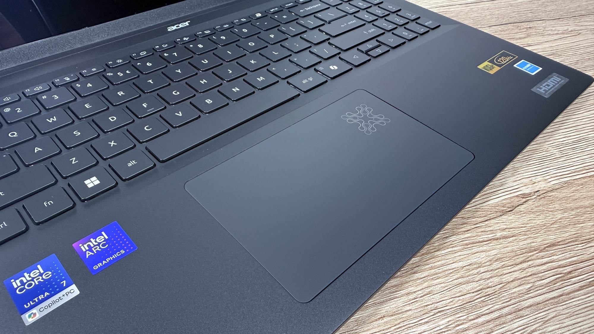 Muchiile ecranului sunt înguste, iar camera web 1440p este integrată discret în zona superioară. Touchpad-ul rămâne un element important, iar aici avem o zonă generoasă pentru controlarea pointerului, ce suportă multiple gesturi pentru control. Există și o funcționalitate dedicată funcțiilor AI. Atunci când folosim aplicații AI (precum Copilot+ sau cele din suita Acer AI) logo-ul din partea dreaptă a touchpad-ului se va ilumina subtil.