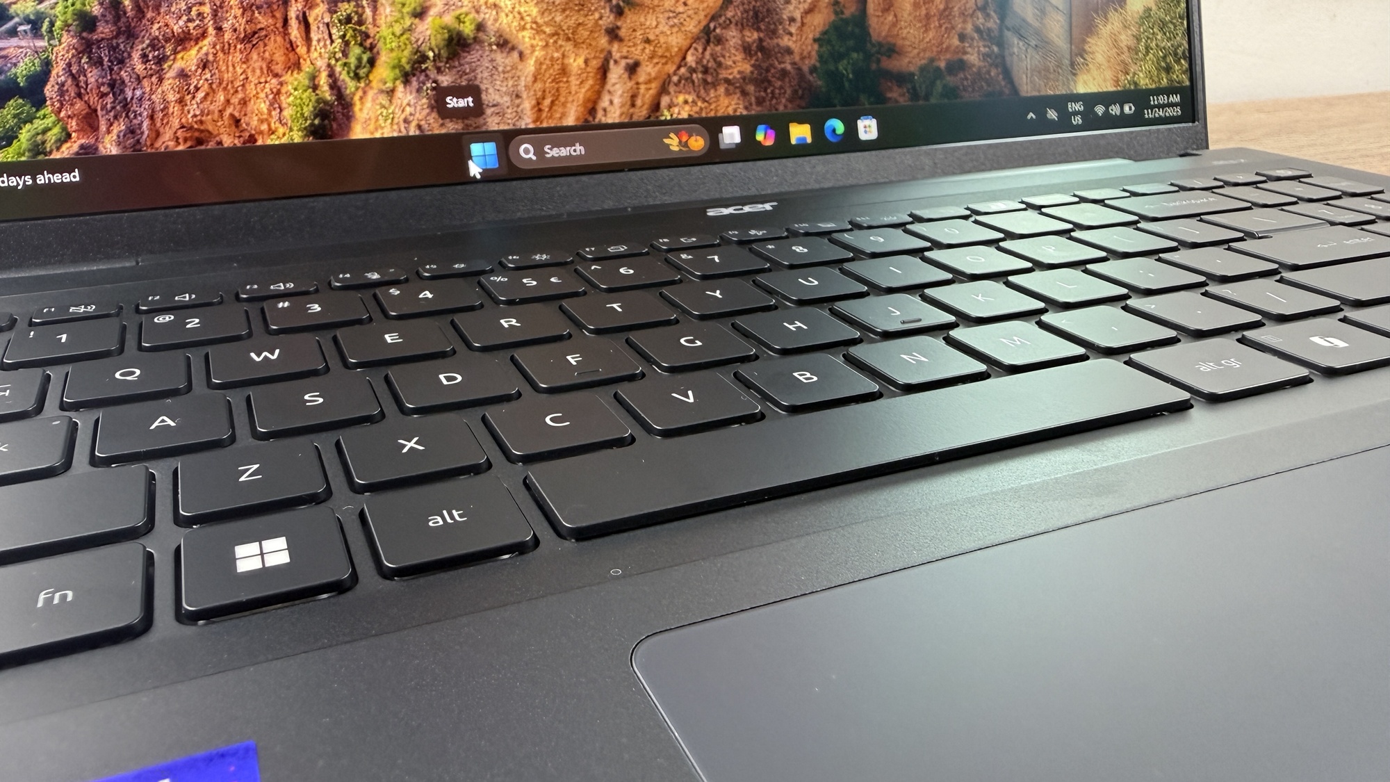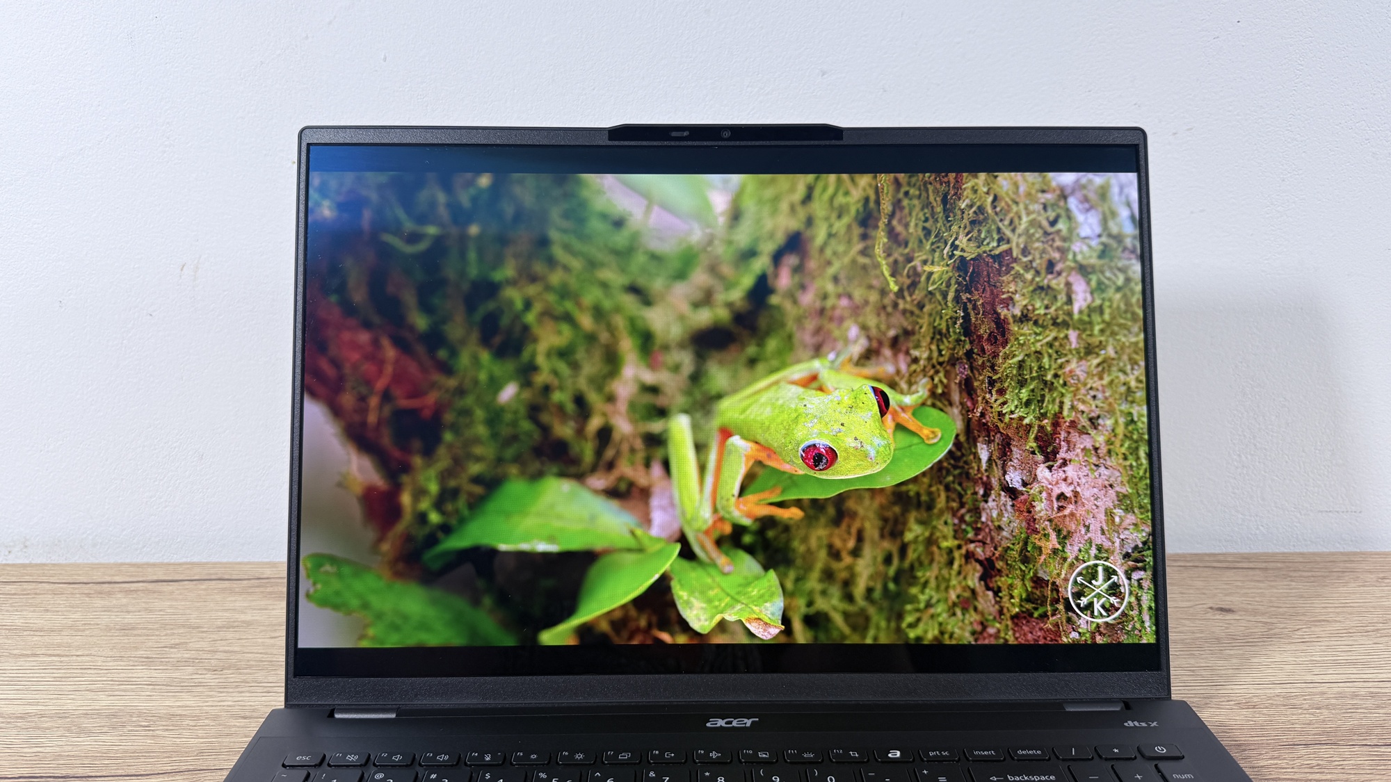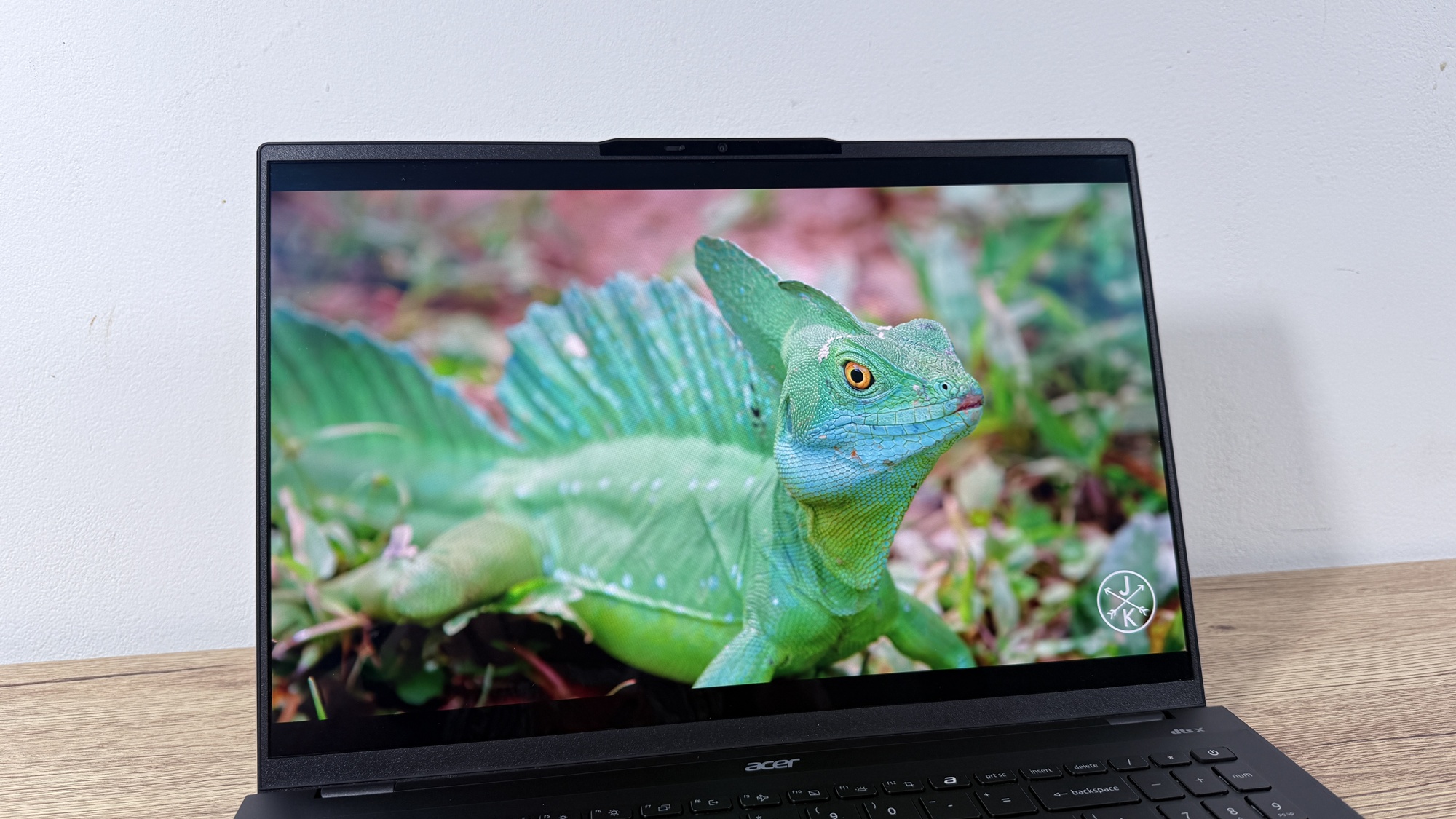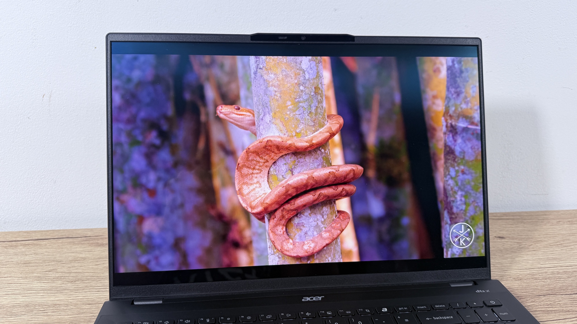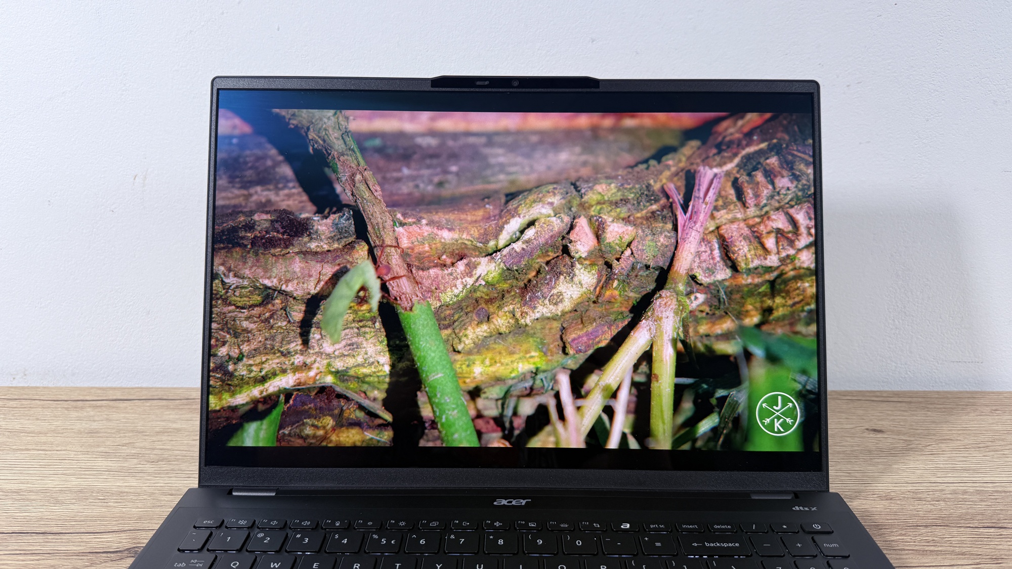 Muchiile ecranului sunt înguste, iar camera web 1440p este integrată discret în zona superioară. Touchpad-ul rămâne un element important, iar aici avem o zonă generoasă pentru controlarea pointerului, ce suportă multiple gesturi pentru control. Există și o funcționalitate dedicată funcțiilor AI. Atunci când folosim aplicații AI (precum Copilot+ sau cele din suita Acer AI) logo-ul din partea dreaptă a touchpad-ului se va ilumina subtil.