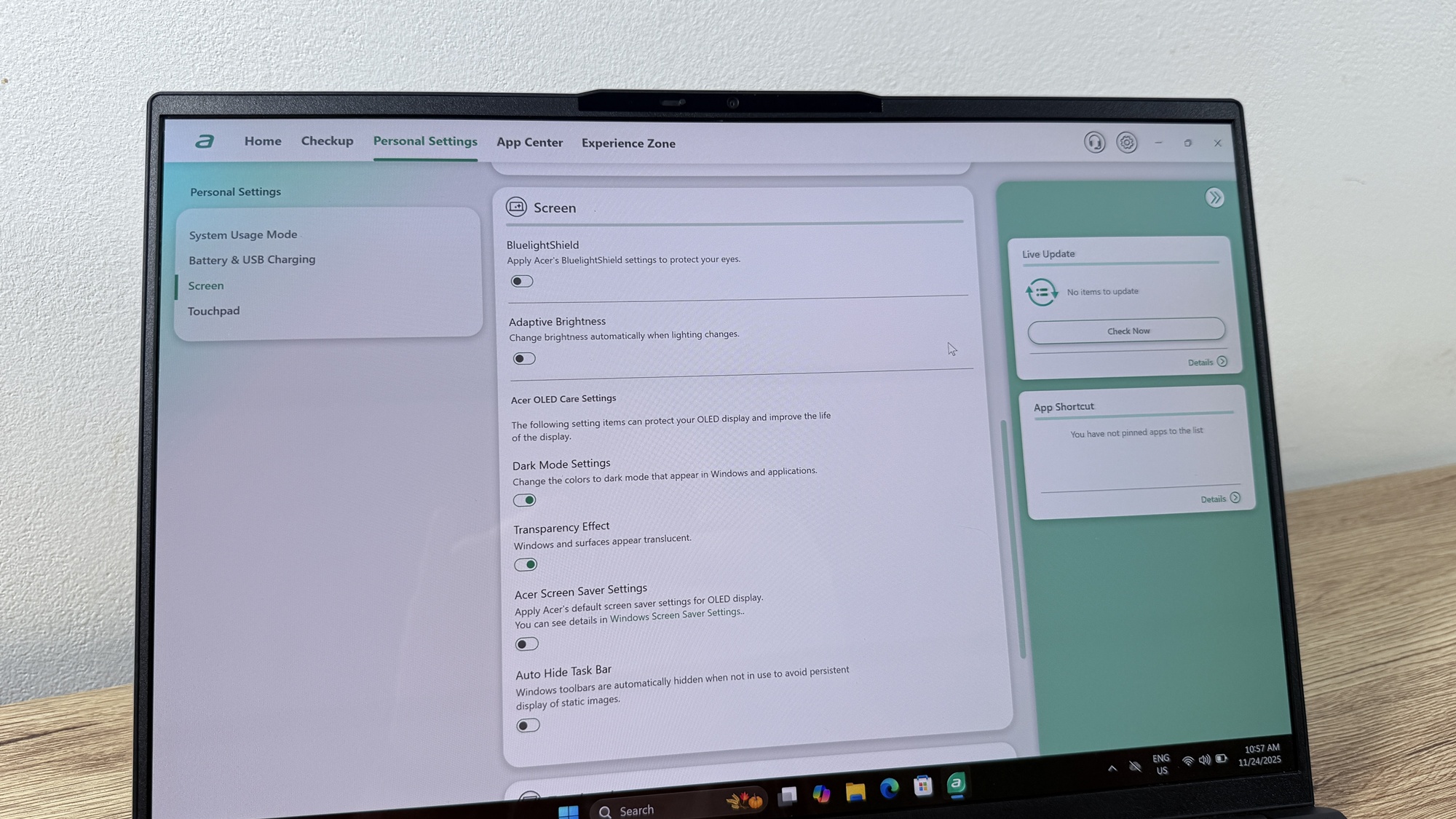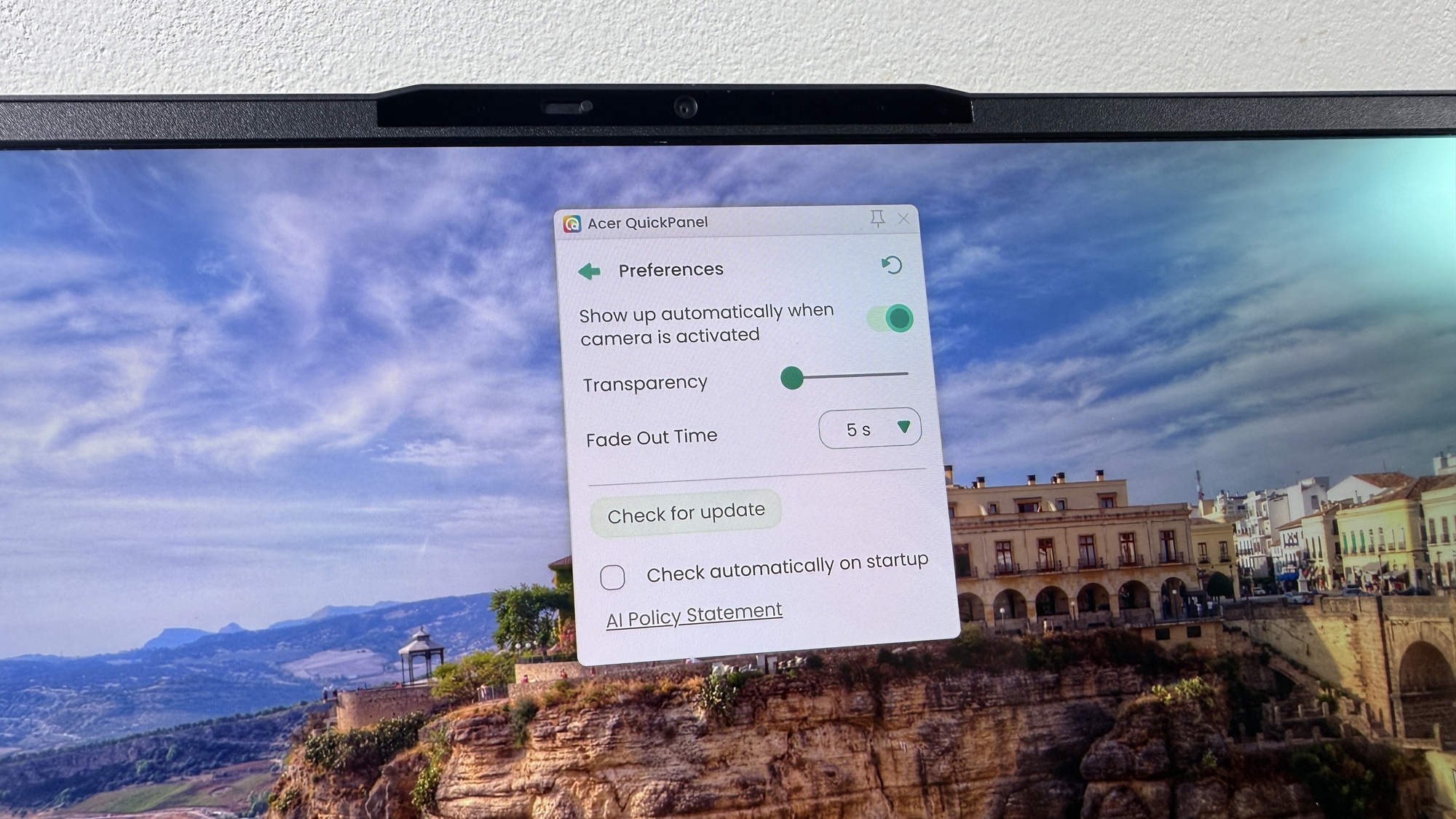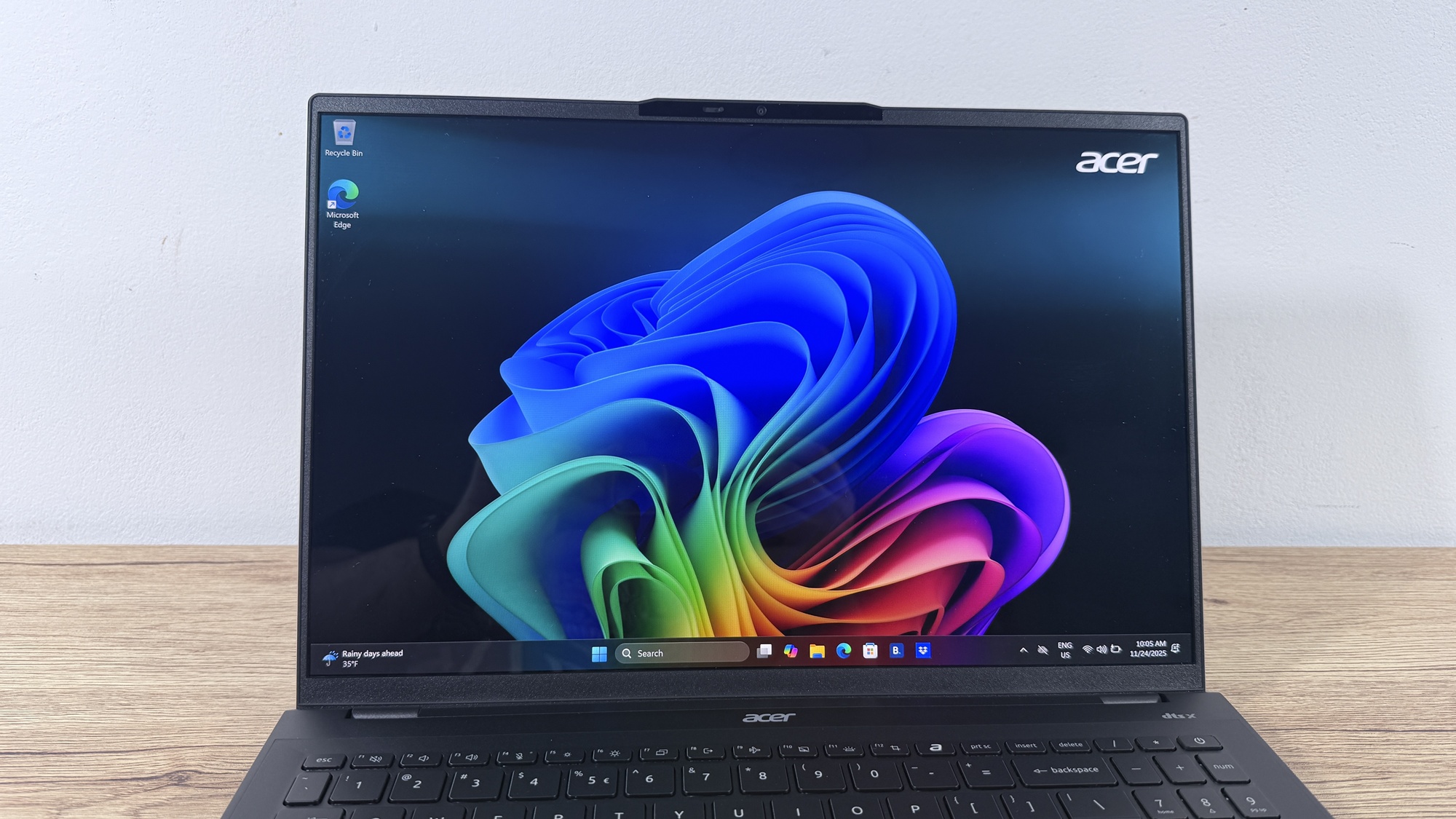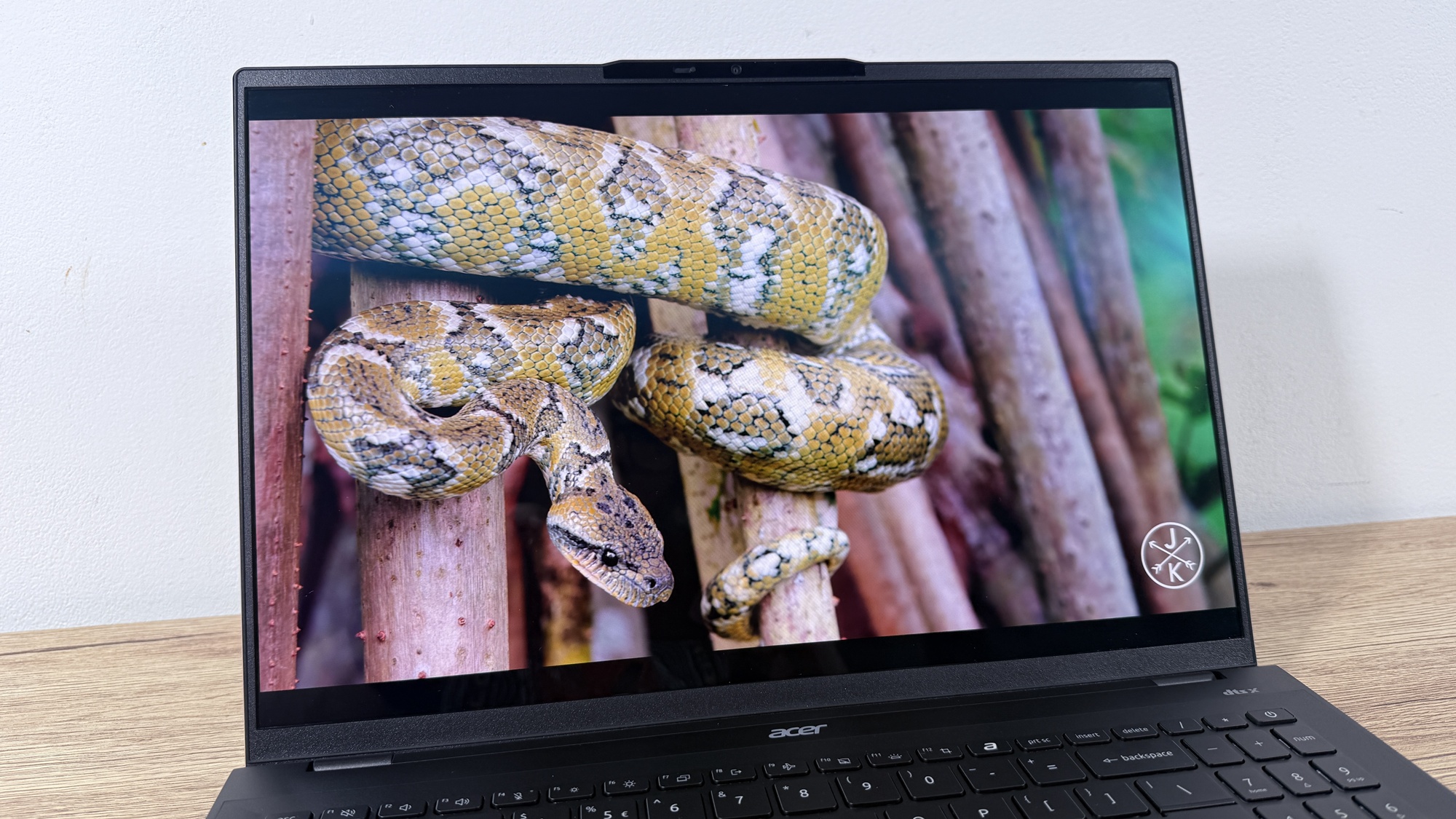 Muchiile ecranului sunt înguste, iar camera web 1440p este integrată discret în zona superioară. Touchpad-ul rămâne un element important, iar aici avem o zonă generoasă pentru controlarea pointerului, ce suportă multiple gesturi pentru control. Există și o funcționalitate dedicată funcțiilor AI. Atunci când folosim aplicații AI (precum Copilot+ sau cele din suita Acer AI) logo-ul din partea dreaptă a touchpad-ului se va ilumina subtil.