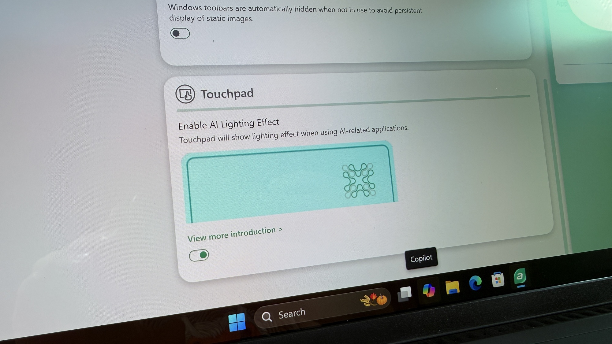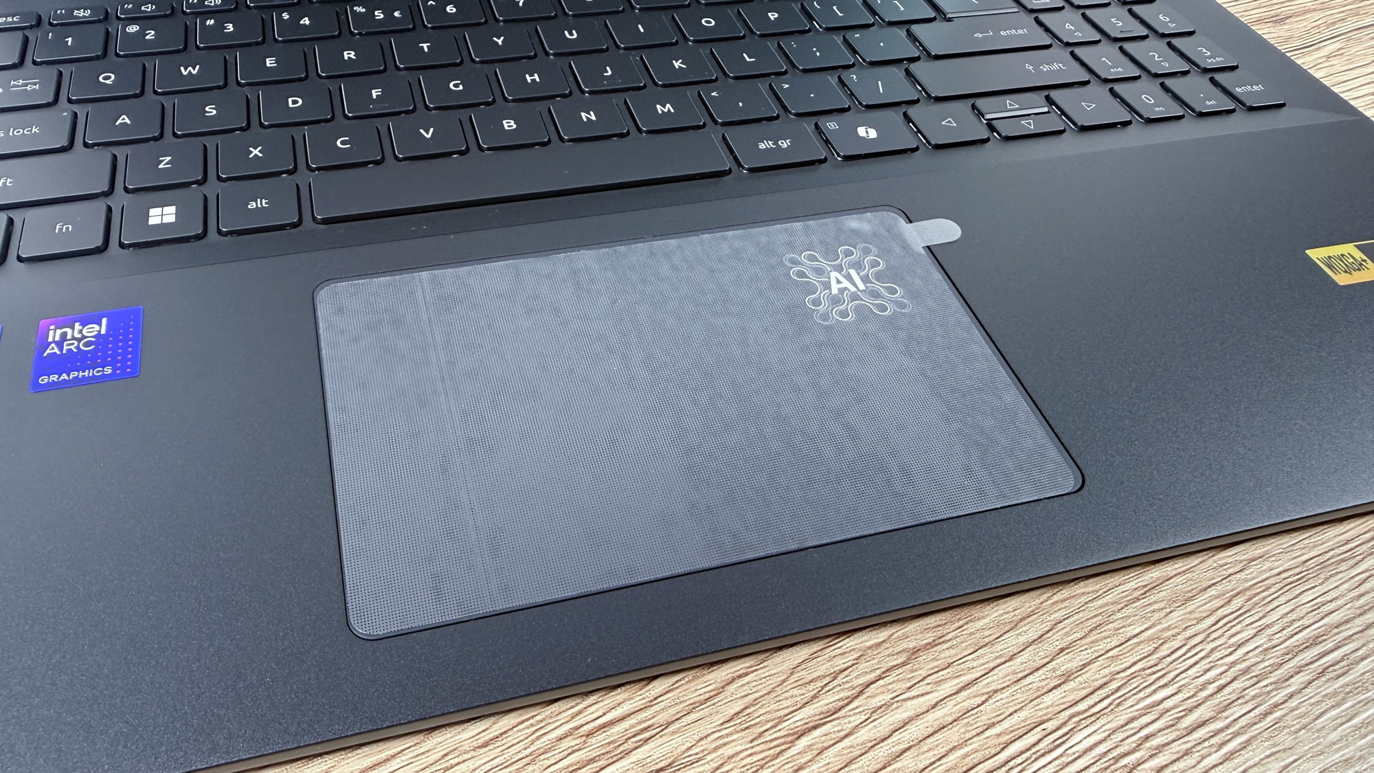 Touchpad-ul este mare, precis, cu suport complet pentru gesturi și o suprafață fină, plăcută la atingere. E foarte plăcut în utilizare, chiar dacă prefer de obicei mouse-ul pentru sarcini „de precizie. O notă interesantă de design este iluminarea logo-ului din partea dreaptă în timpul utilizării de aplicații AI.