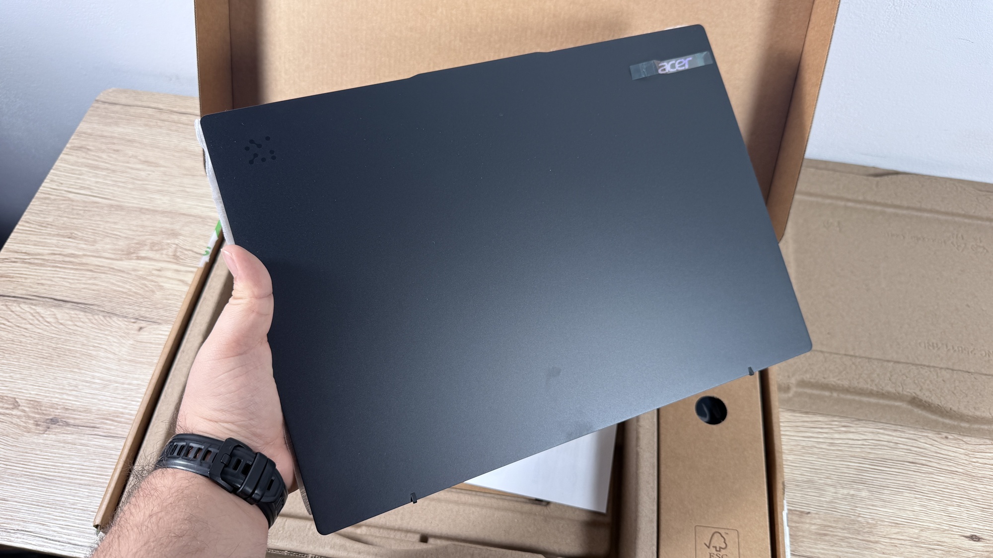 Experiența de unboxing este clasică și rapidă. În cutie vom găsi laptopul Acer Swift 16 AI, dar și un alimentator cu port USB-C la capăt, folosit pentru încărcare. Avem mult carton, ambalajul fiind realizat din material 100% reciclat. O parte din cutie poate fi chiar folosit pentru a crea un stand pentru laptop, promovându-se reciclarea și utilizarea cutiei la maximum. Mulțumiți de experiența de unboxing, trecem direct la utilizarea laptopului, dar nu înainte de a admira construcția.