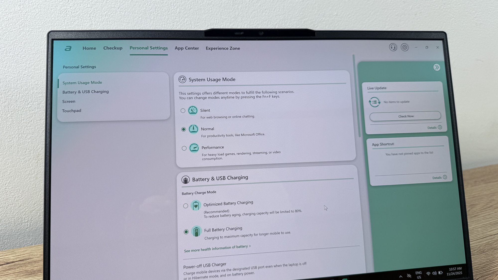 În multe scenarii de utilizare e suficient să utilizăm modul „Silent”, care ne oferă și cea mai bună autonomie. Obținem peste 15-16 ore de playback video continuu și dacă ajustăm luminozitatea, în task-uri Office, în jur de 10-12 ore de utilizare continuă. Ajută mult și ecranul OLED eficient în acest caz, mai ales dacă activăm Dark Mode în interfață.