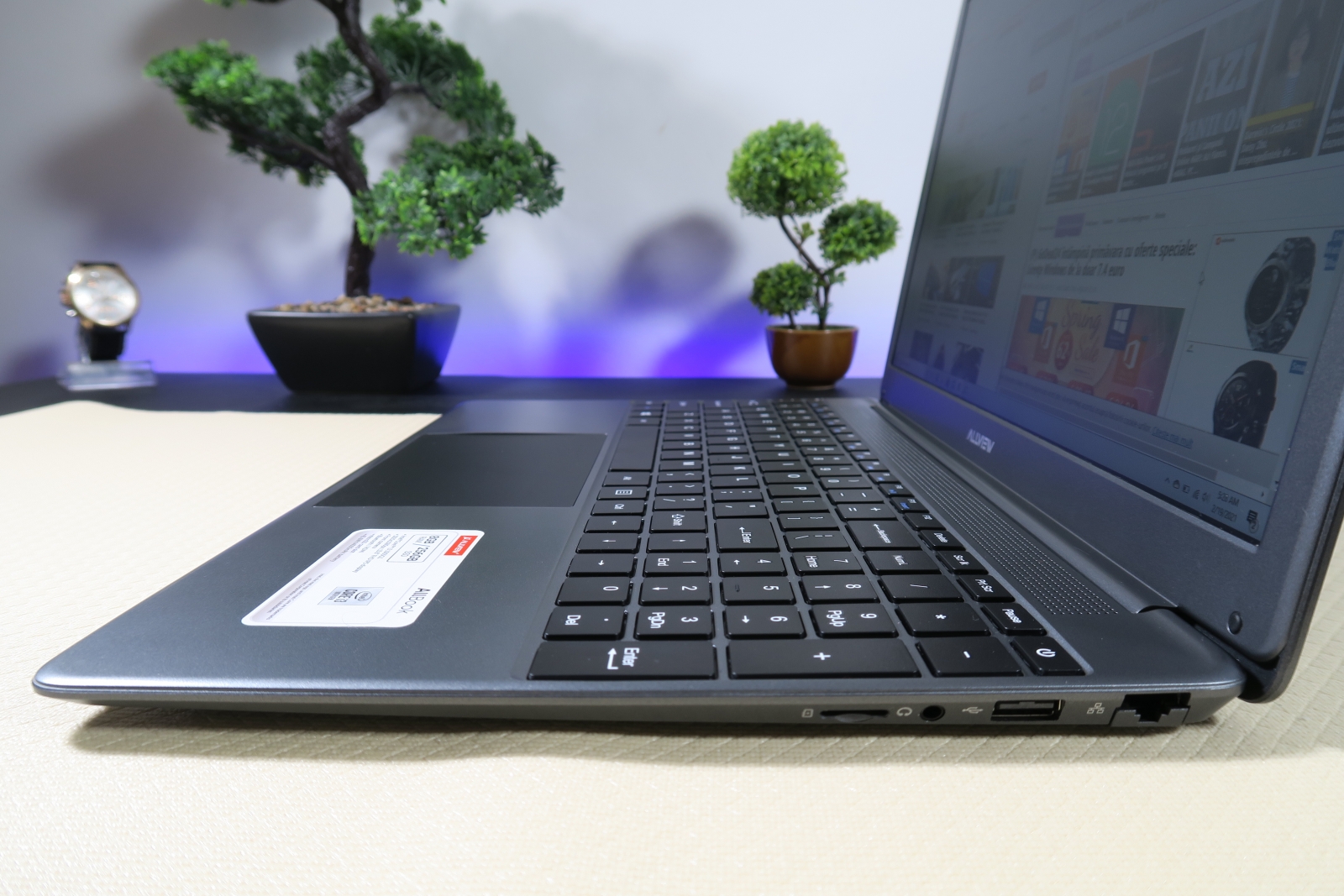 Ajungem și la ecran, unde nu mă așteptam să fiu surprins, însă este unul de calitate. Avem de-a face cu un display cu rezoluție Full HD (1920 x 1080), IPS LCD anti-glare, de 15.6 inch în diagonală. Aspectul este 16:9 ceea ce îl face perfect atât pentru Școala Online, fiind destul spațiu pentru desfășurare, cât și pentru vizionarea de conținut media (Netflix, YouTube) în timpul liber. Unghiurile de vizionare sunt bune, iar culorile sunt redate destul de bine. De asemenea, se vede bine și în timpul utilizării cu lumina aprinsă, fiind un ecran anti-glare.