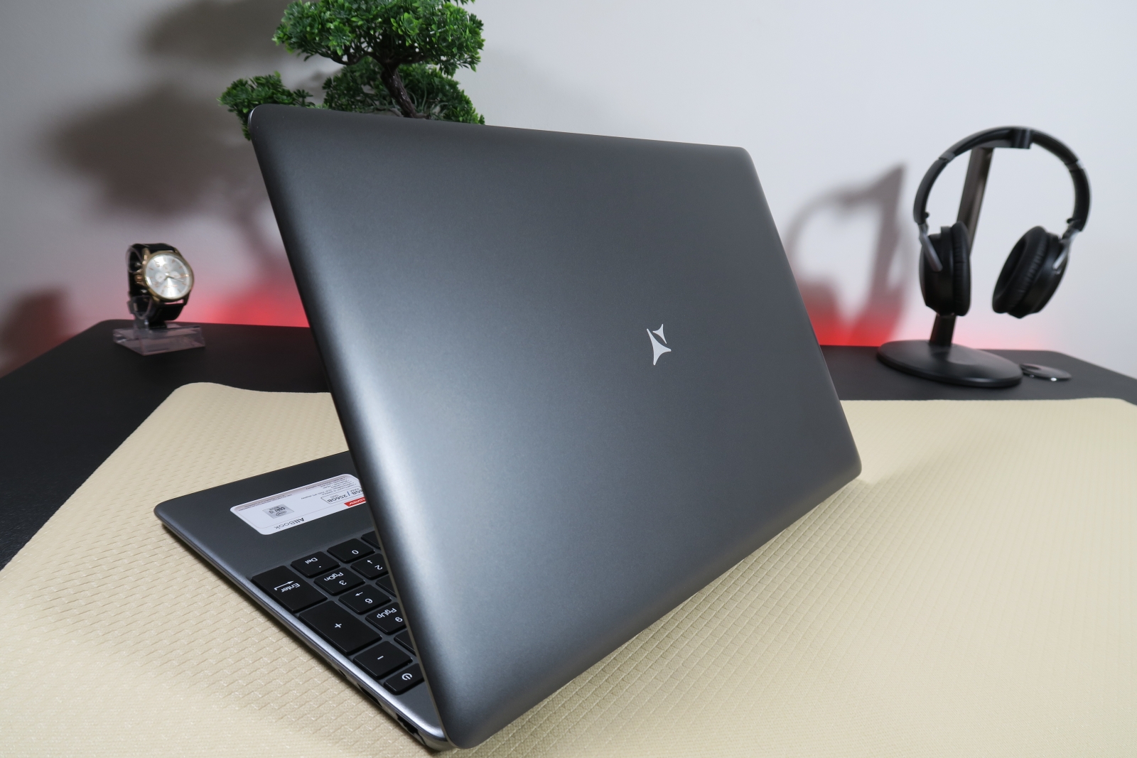 Marginile ecranului sunt destul de generoase, iar în partea superioară regăsim și o cameră web de 2MP care își face treaba destul de bine în condiții de luminozitate optime. Avem incluse și două microfoane și o grilă puțin mai sus de tastatură care integrează 4 difuzoare de 1W cu impedanță de 8 ohmi. În partea stângă avem și 3 leduri de culoare albastră. Acestea indică funcționalitatea Numlock, Capslock sau dacă laptopul este aprins.