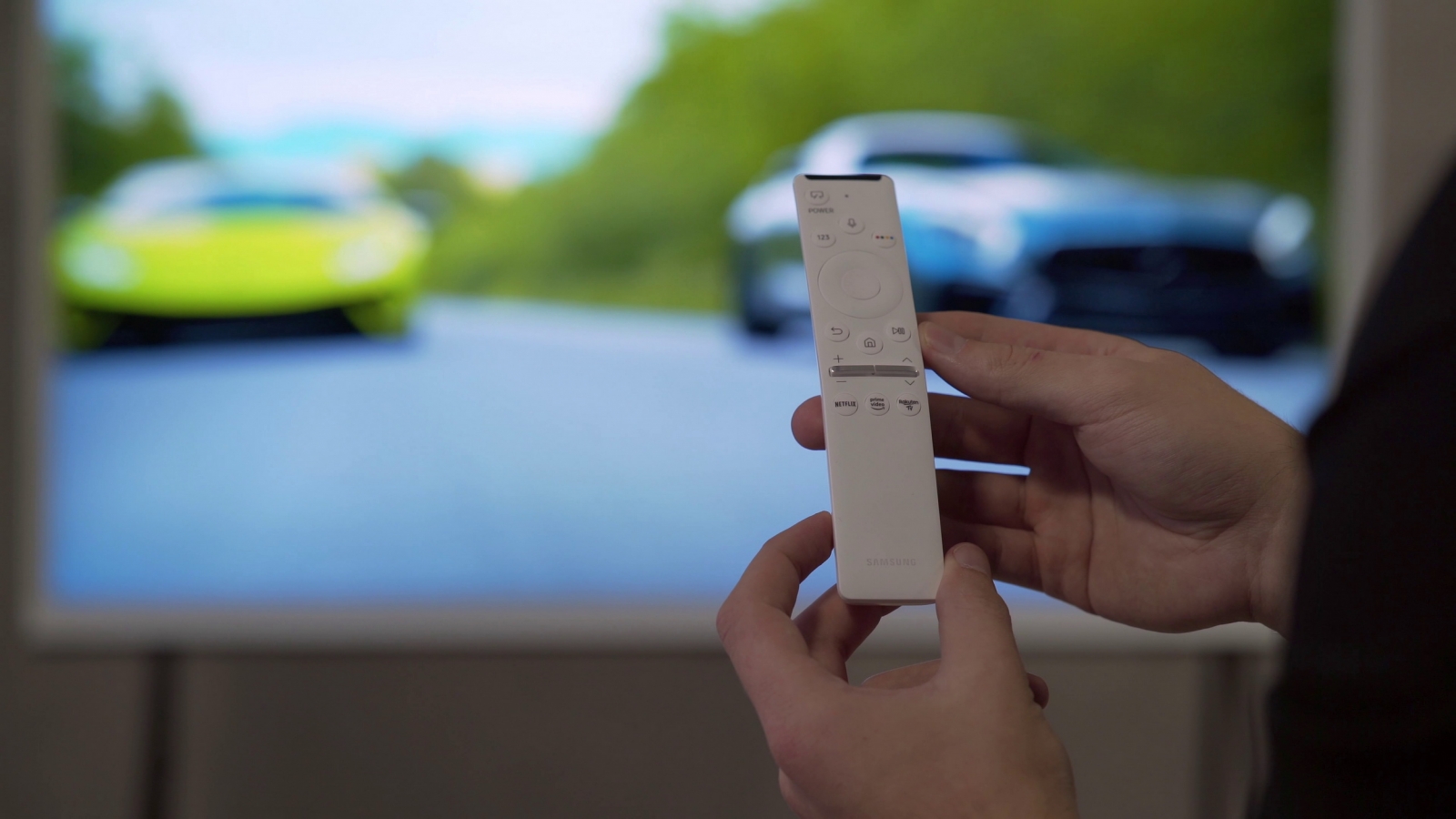 Telecomanda după cum am fost obișnuiți și la alte televizoare Samsung are un design minimalist. Aceasta vine cu buton dedicat pentru comenzi vocale, Netflix, Amazon Prime și RakutenTV. Are o construcție compactă și deși nu este împânzită doar de butoane, îți oferă un control total asupra televizorului tău.