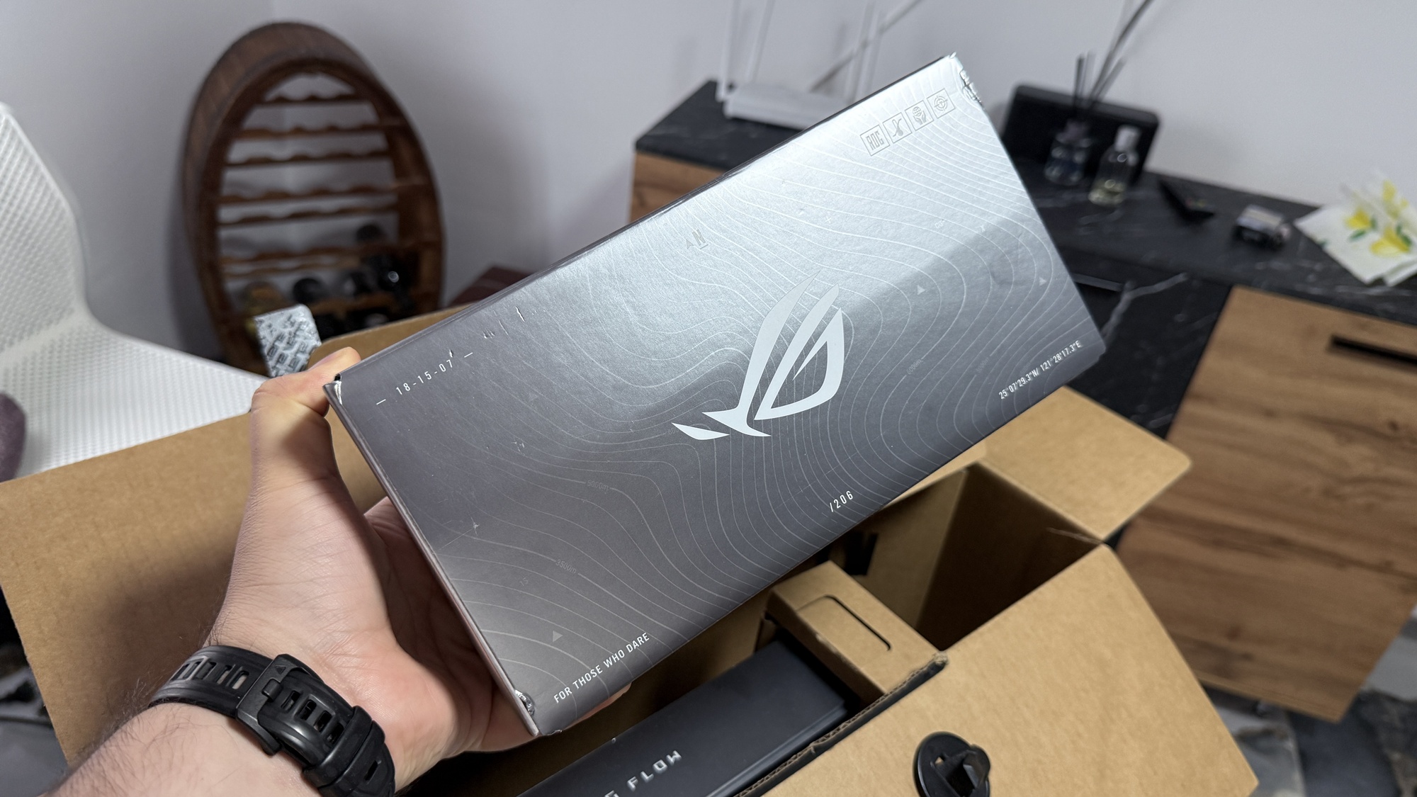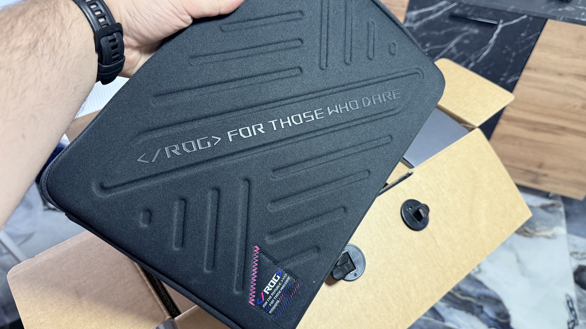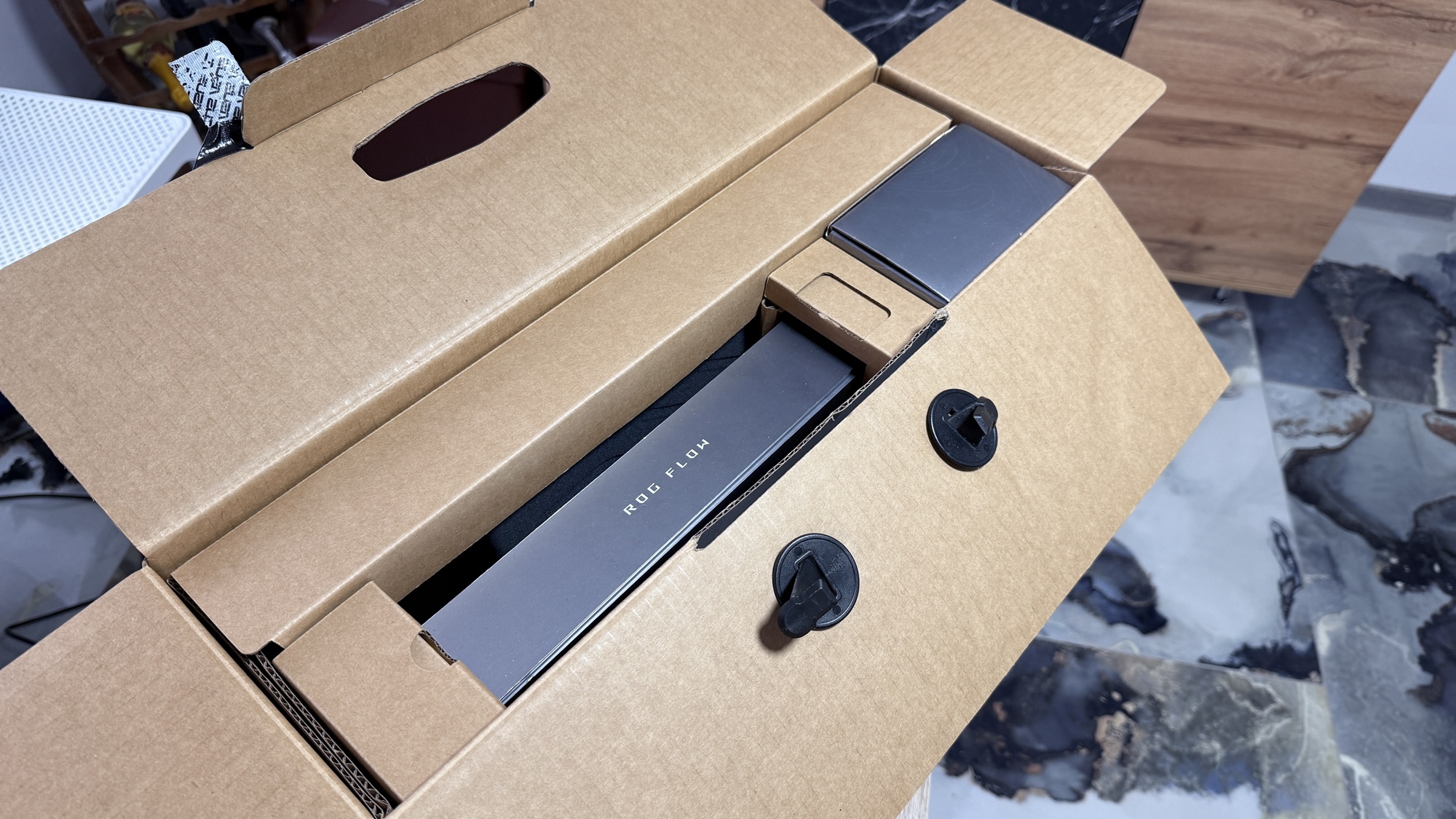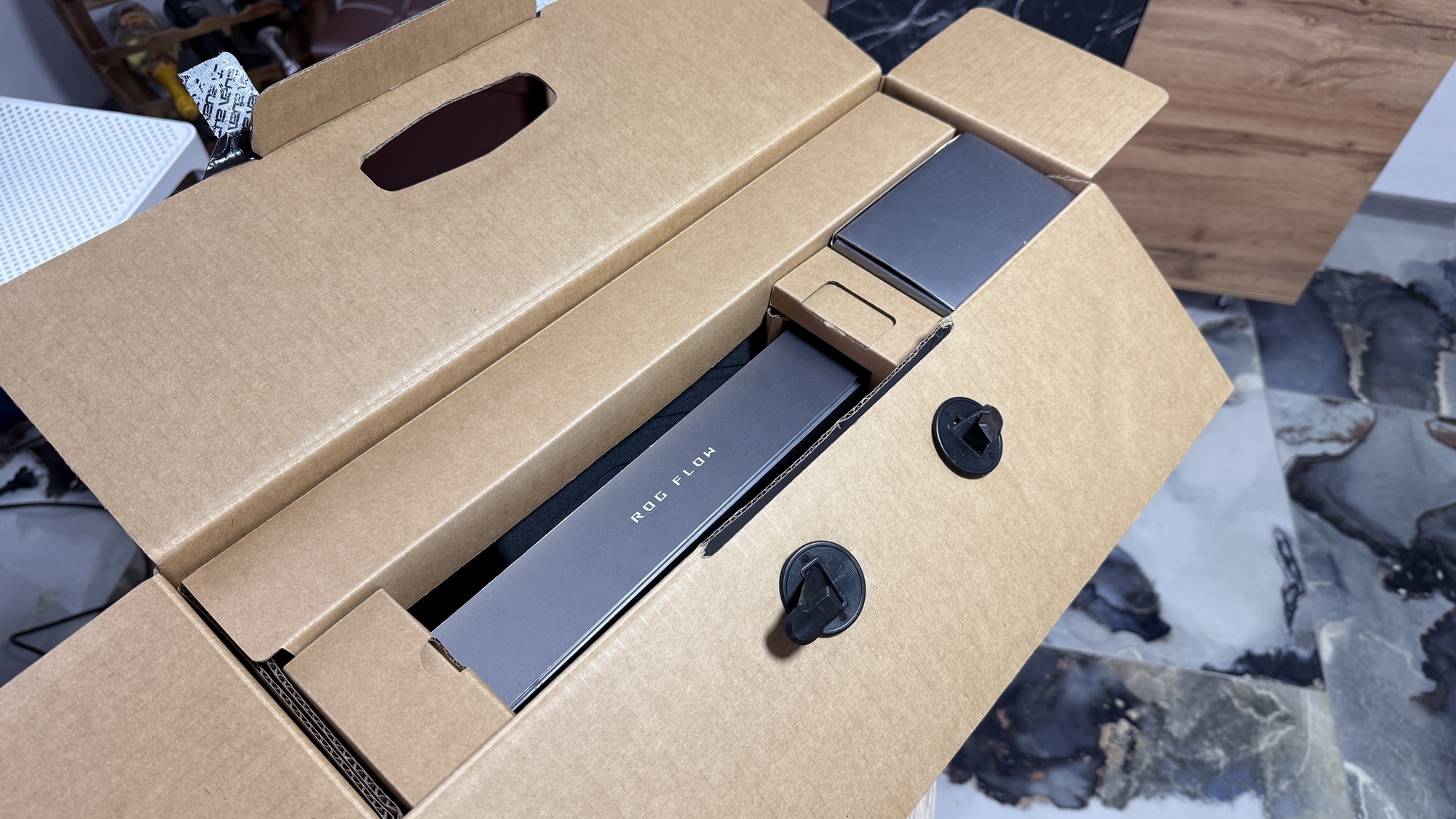 ASUS ROG Flow Z13 (2025) sosește într-o cutie de dimensiuni mari. Aici avem o cutie dedicată exclusiv device-ului în sine și una extra unde vom găsi alimentatorul de dimensiuni mari, cu port proprietar pentru încărcare. Experiența de unboxing e destul de simplă și rapidă în esență, iar pe lângă device și încărcător, găsim aici și o husă dedicată pentru „tabletă”, cât și un stylus ASUS, întrucât avem parte de un panou tactil ce suportă inclusiv interacțiunea cu acest pen.