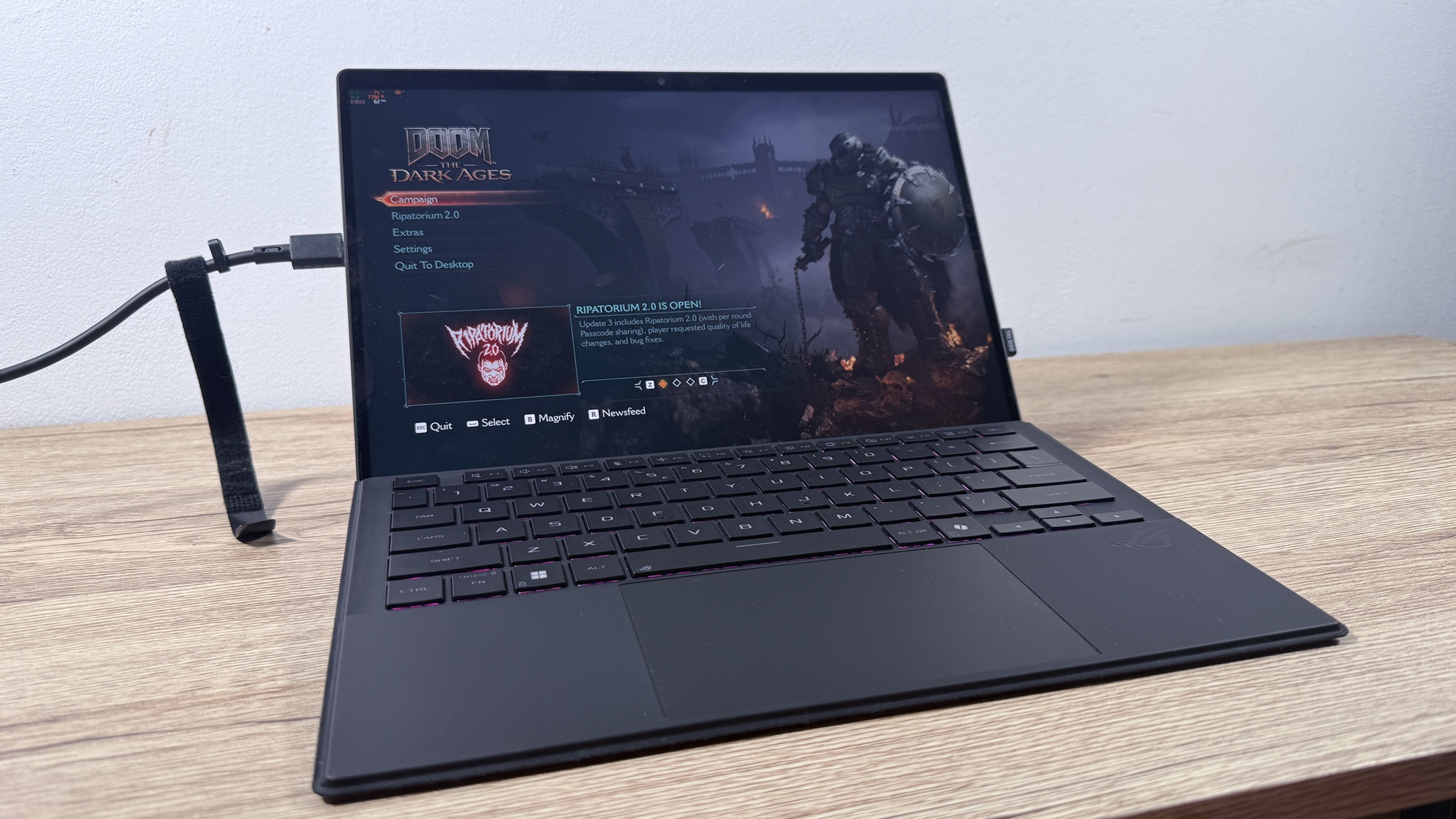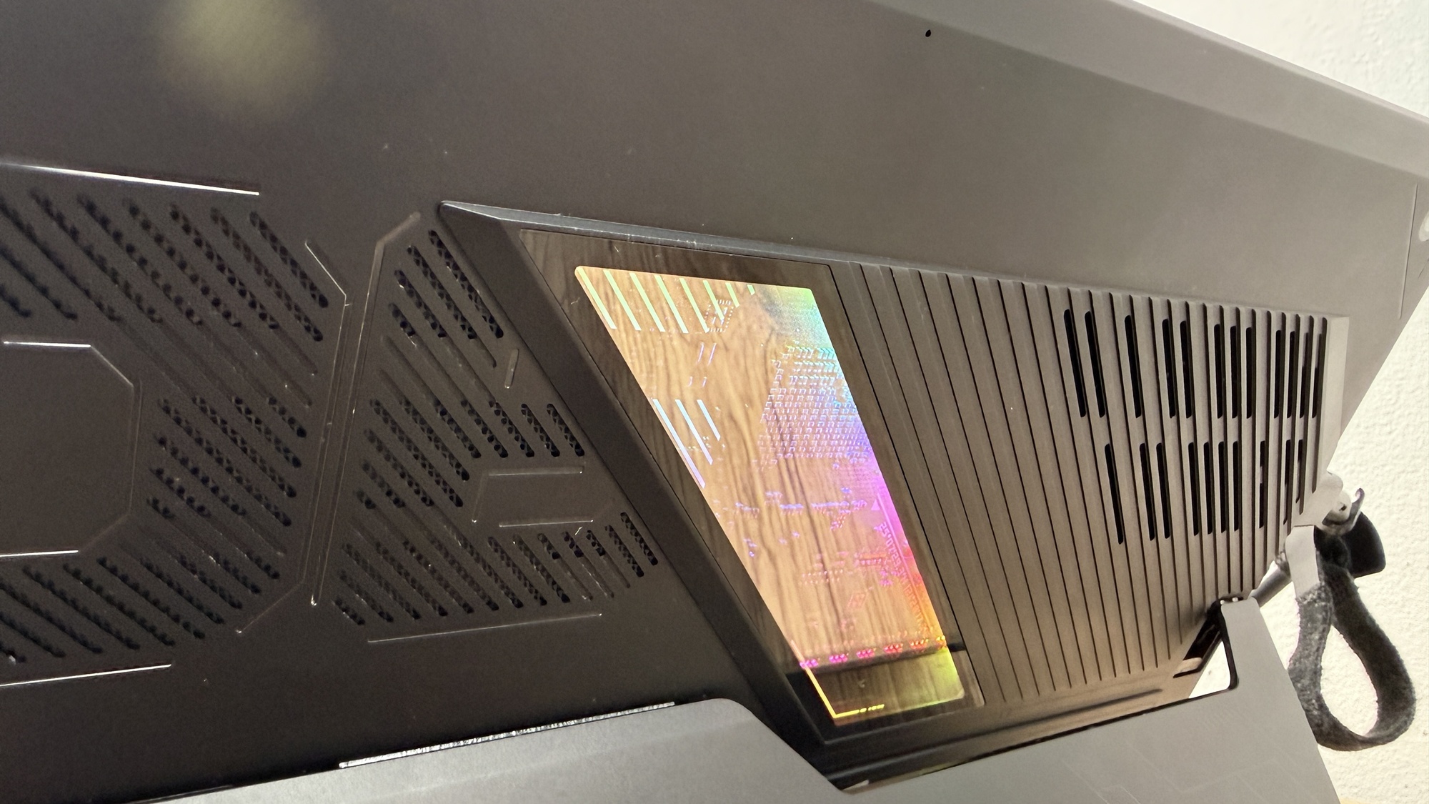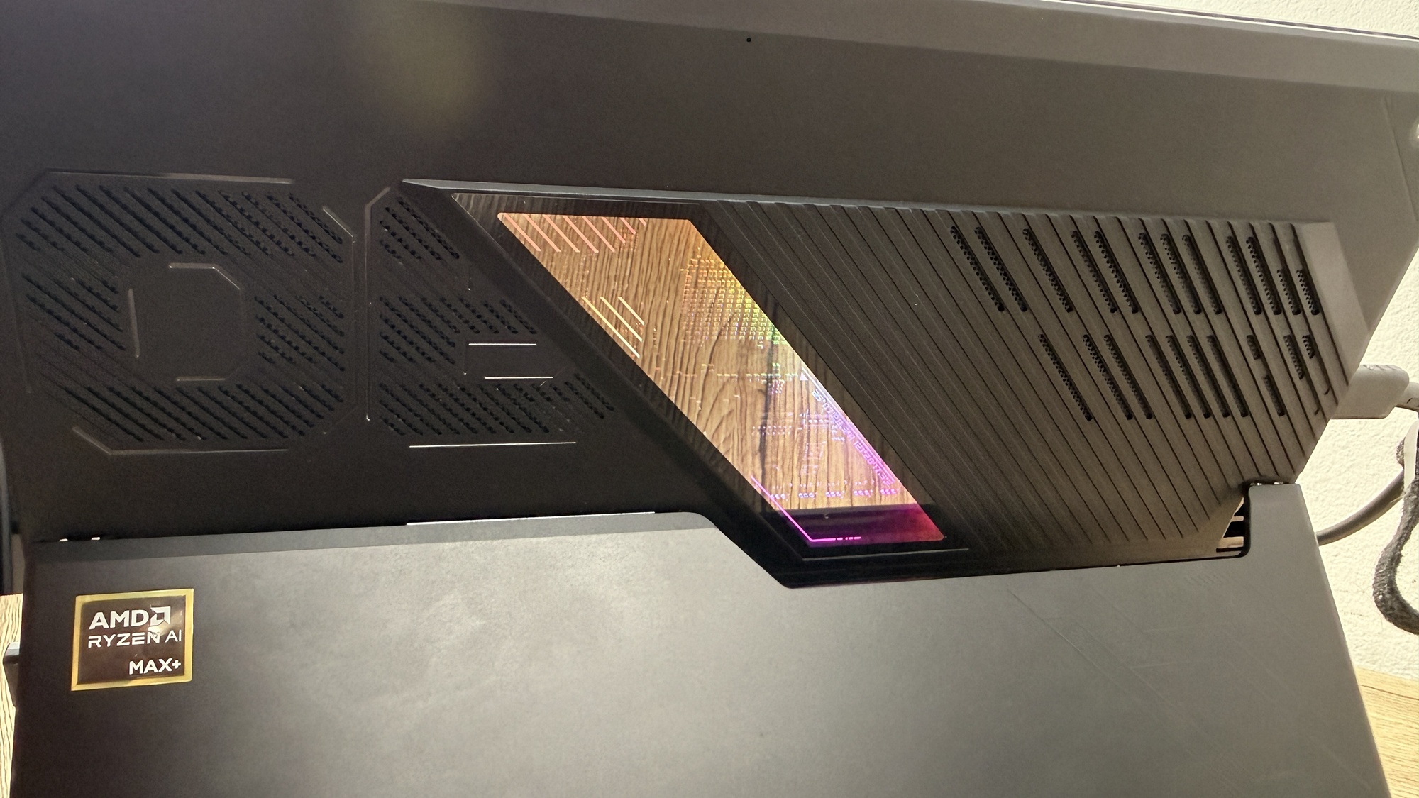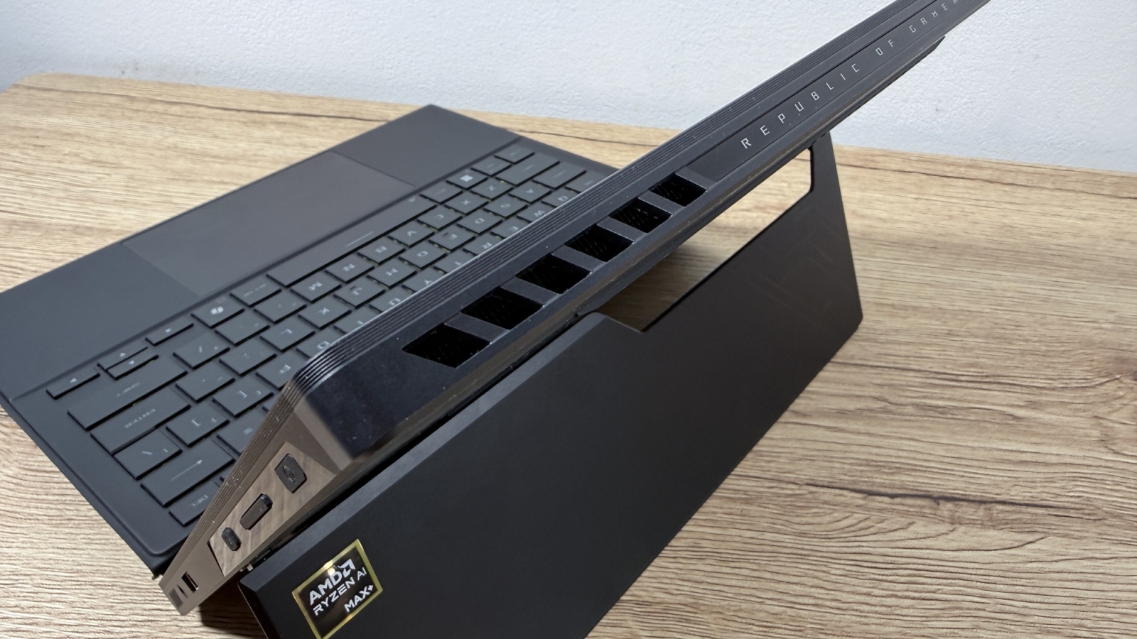 Când conectăm device-ul la priză zona aduce iluminare AURA Sync. Acest lucru pune device-ul în evidență atunci când te joci și îi „avertizează” pe cei din jur că ești prins într-o sesiune intensă de gaming. E un dispozitiv compact, mai greu decât o tabletă obișnuită, dar clar mai ușor decât un laptop de gaming. Asta se simte în timpul transportului, mai ales dacă nu mai ești nevoit să iei cu tine o tabletă pentru multimedia, respectiv un laptop pentru muncă on-the-go.