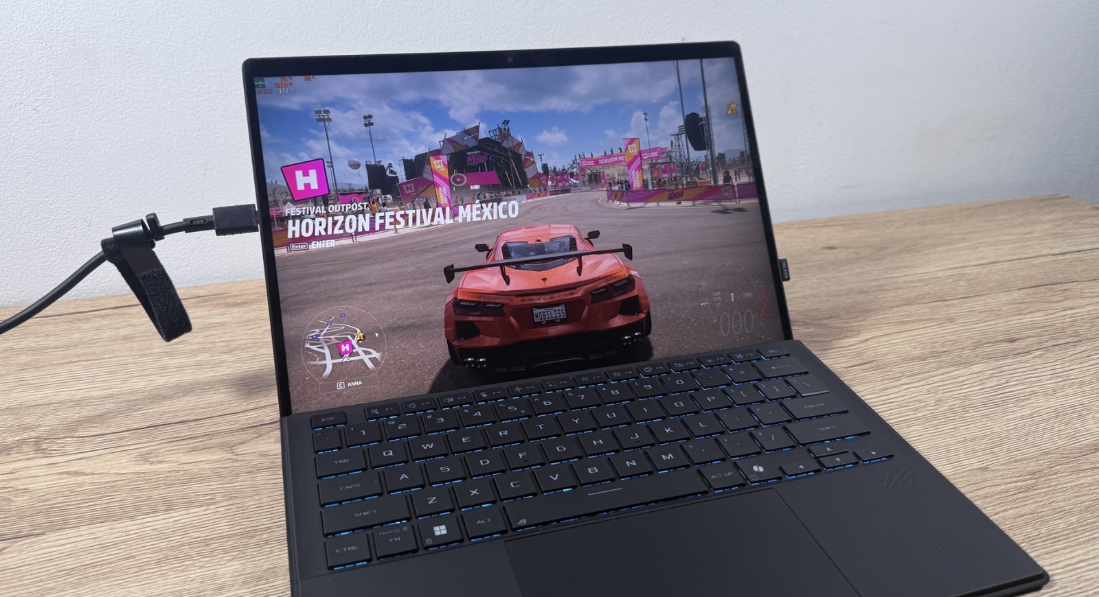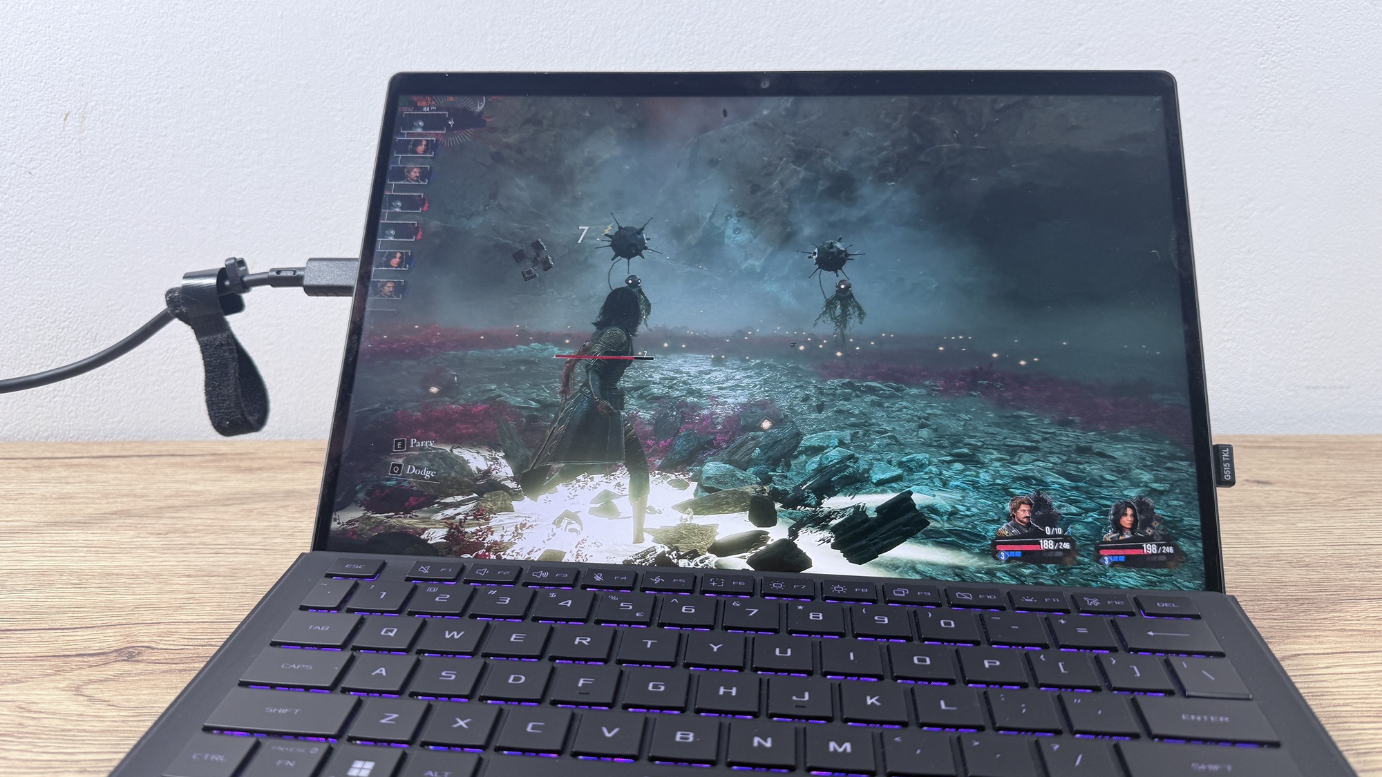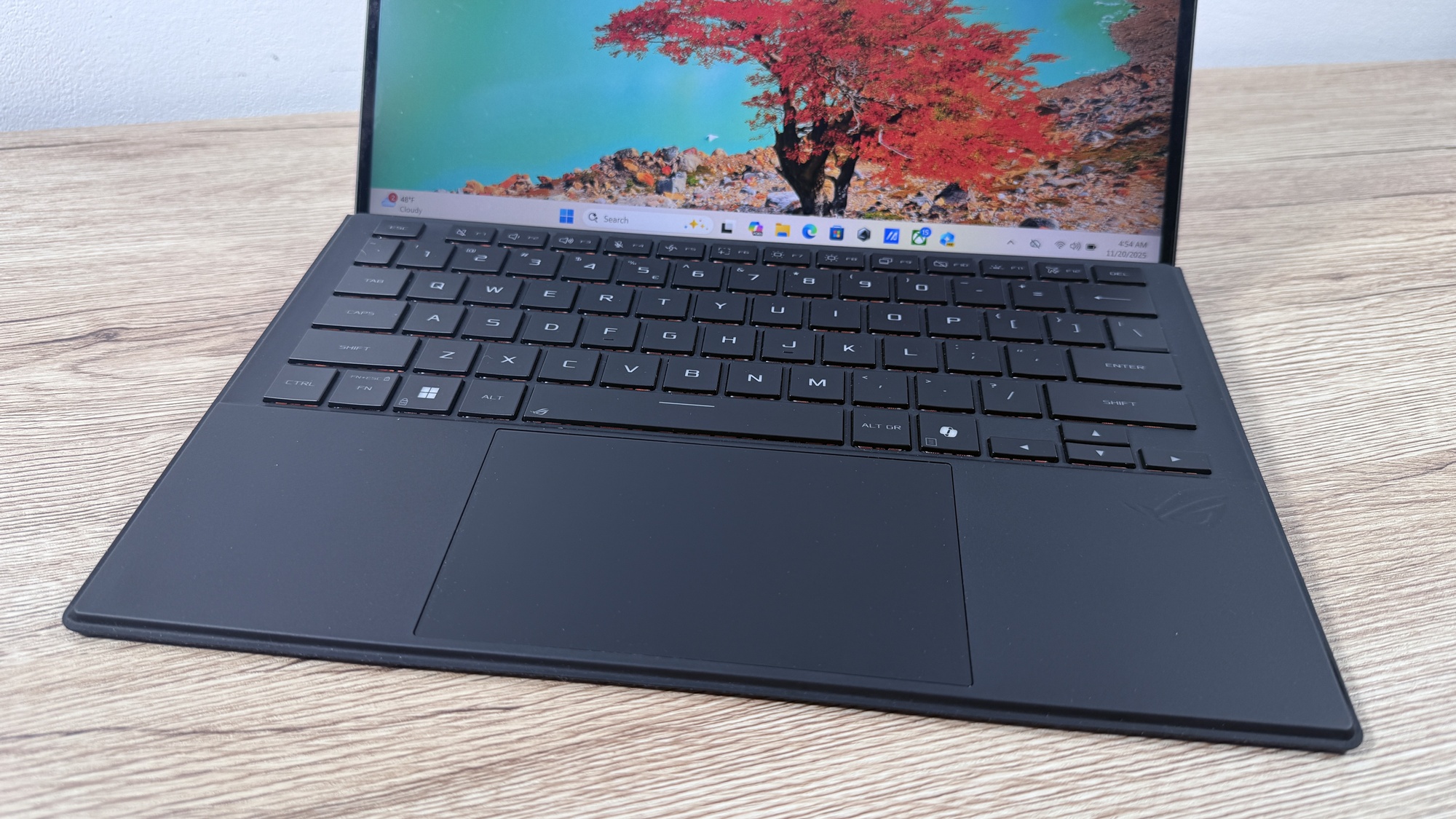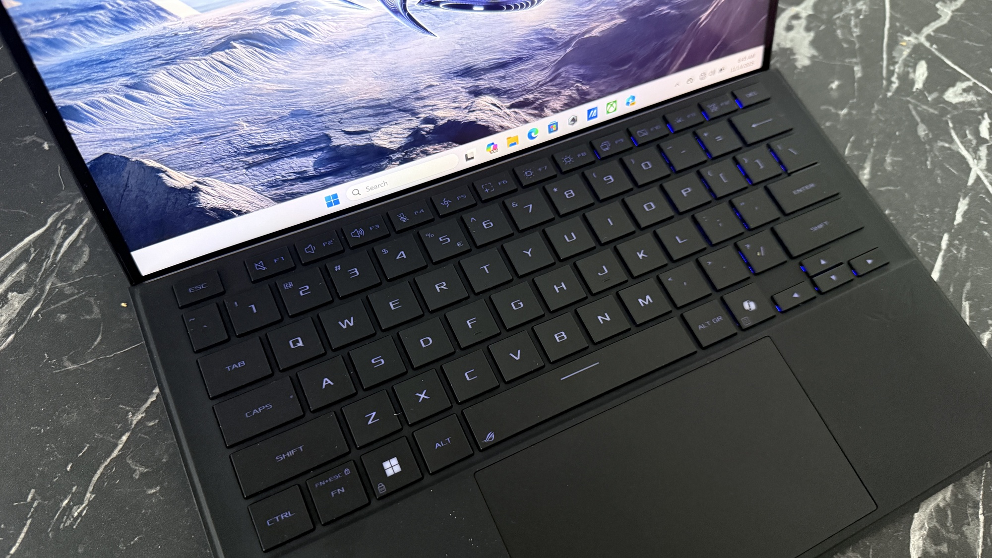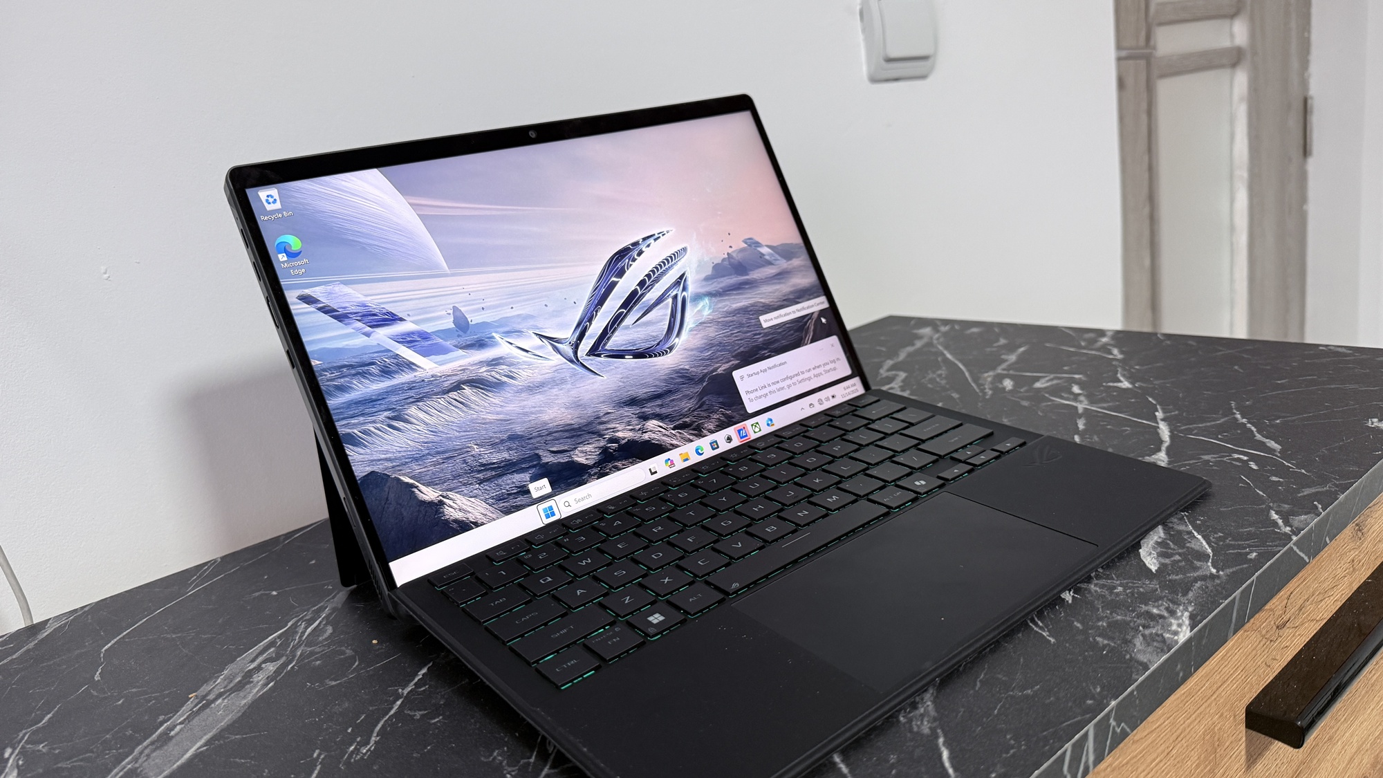 Când conectăm device-ul la priză zona aduce iluminare AURA Sync. Acest lucru pune device-ul în evidență atunci când te joci și îi „avertizează” pe cei din jur că ești prins într-o sesiune intensă de gaming. E un dispozitiv compact, mai greu decât o tabletă obișnuită, dar clar mai ușor decât un laptop de gaming. Asta se simte în timpul transportului, mai ales dacă nu mai ești nevoit să iei cu tine o tabletă pentru multimedia, respectiv un laptop pentru muncă on-the-go.
