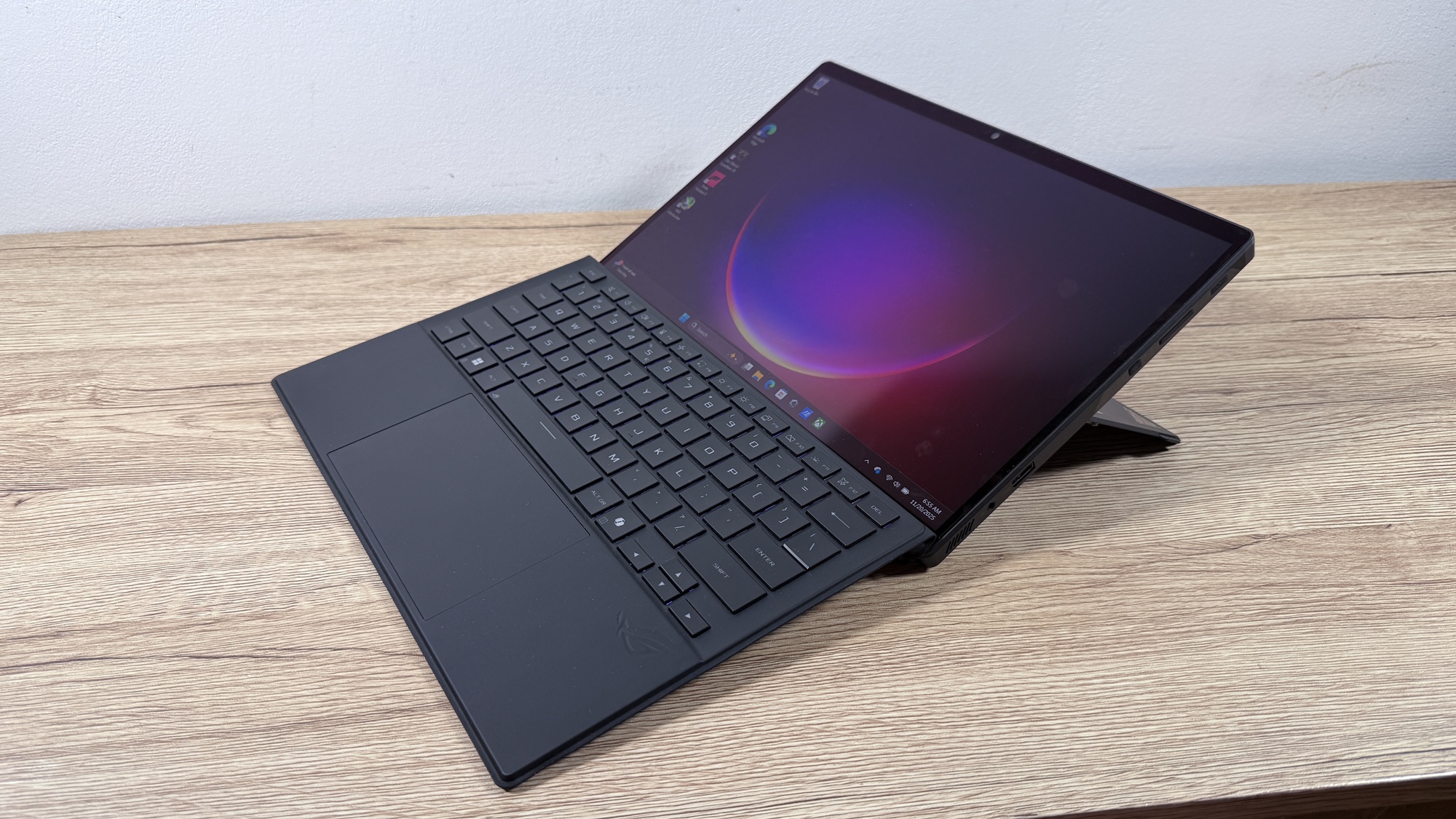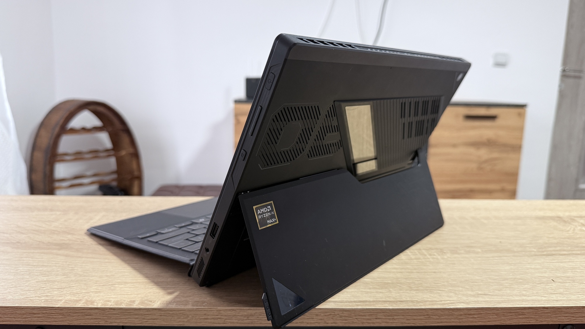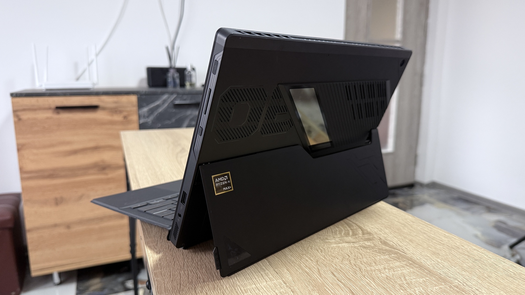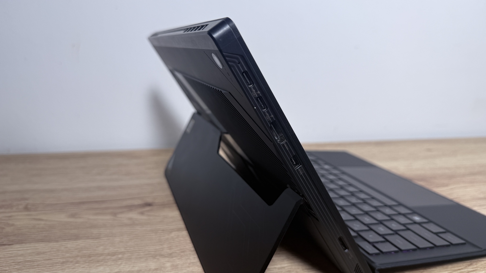 Am rămas ușor confuz când am scos din cutie prima oară ROG Flow Z 13 (2025). Nu seamănă cu nimic din ce am avut până acum. E o tabletă de 13 inch, dar una groasă, cu predispoziție clară spre gaming. Kickstand-ul din spate e solid, rezistent, cu un unghi generos. Odată ajustat vei avea un „monitor portabil” ce poate sta în pat, la birou, poate pe o masă îngustă din aeroport.