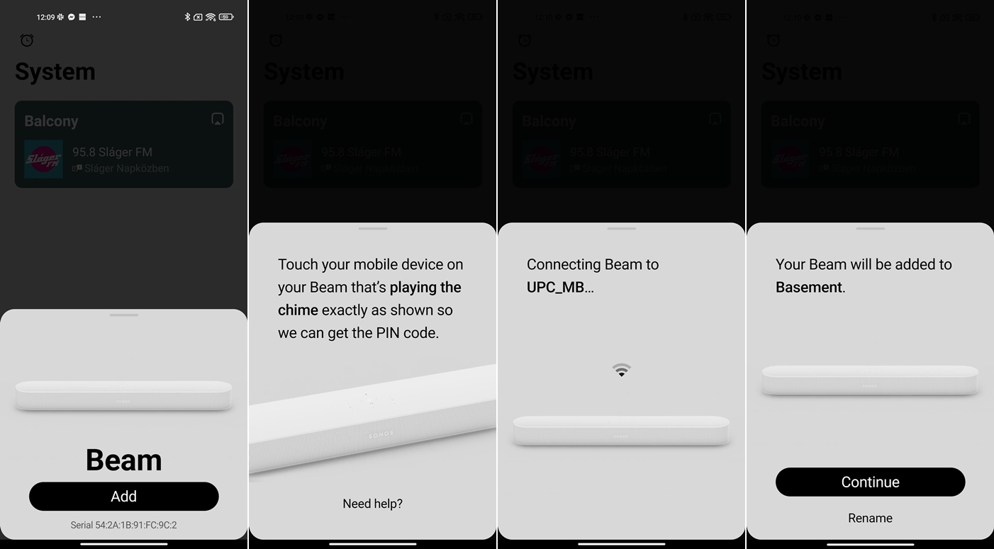 Conexiunea după unboxing se face simplu dacă aveți deja cont Sonos. Practic se conectează la priză, după care procesul de instalare începe folosind NFC. Atingeți telefonul compatibil NFC de partea superioară a dispozitivului (central), iar porcesul de setup începe. Vi se va cere să conectați soudbarul la televizor prin cablul HDMI, cu atenție la detaliul că trebuie conectat la un post de tip eARC. Această tehnologie poate comunica vice versa între TV și soundbar, făcând posibilă folosirea telecomenzii televizorului pentru a regla volumul lui Beam spre exemplu.