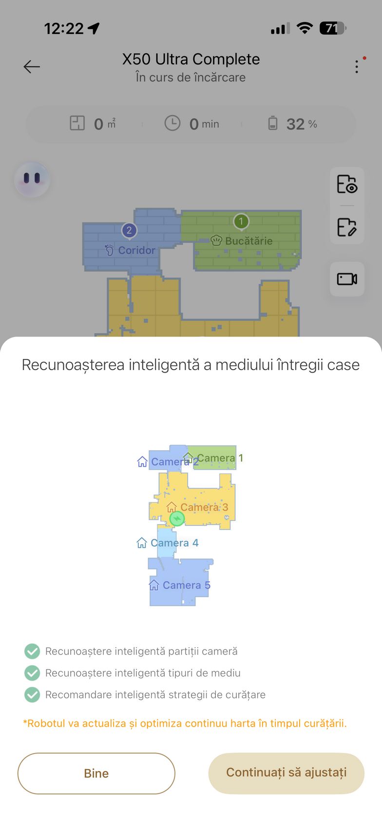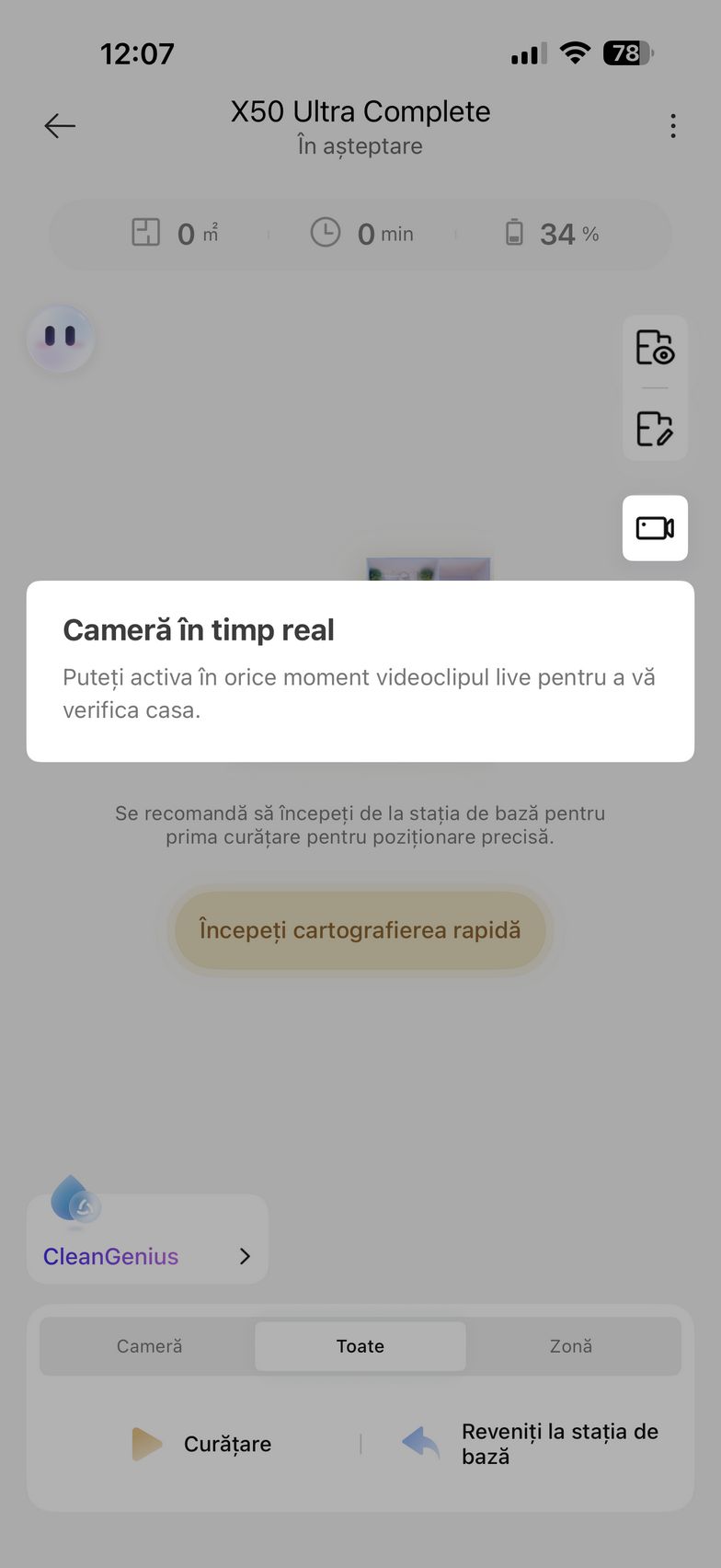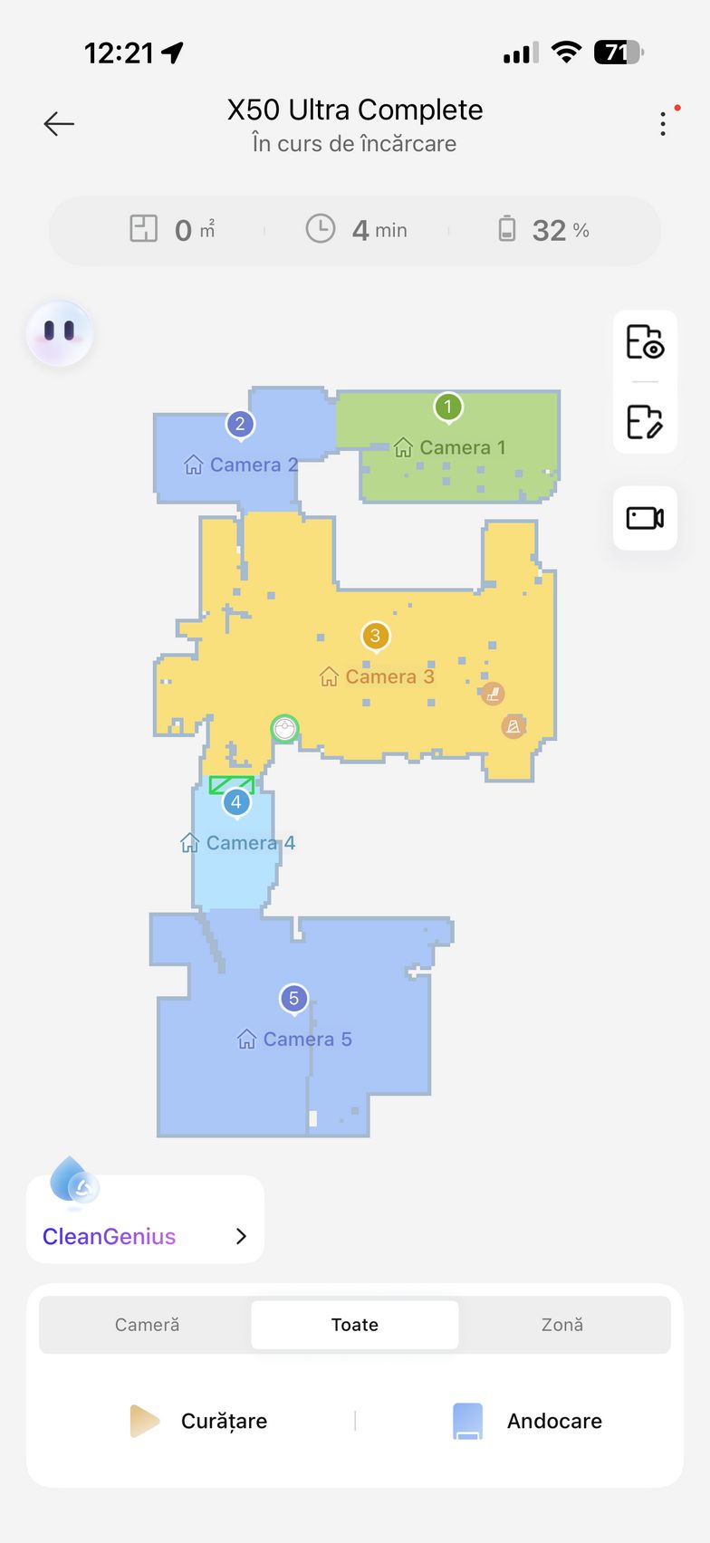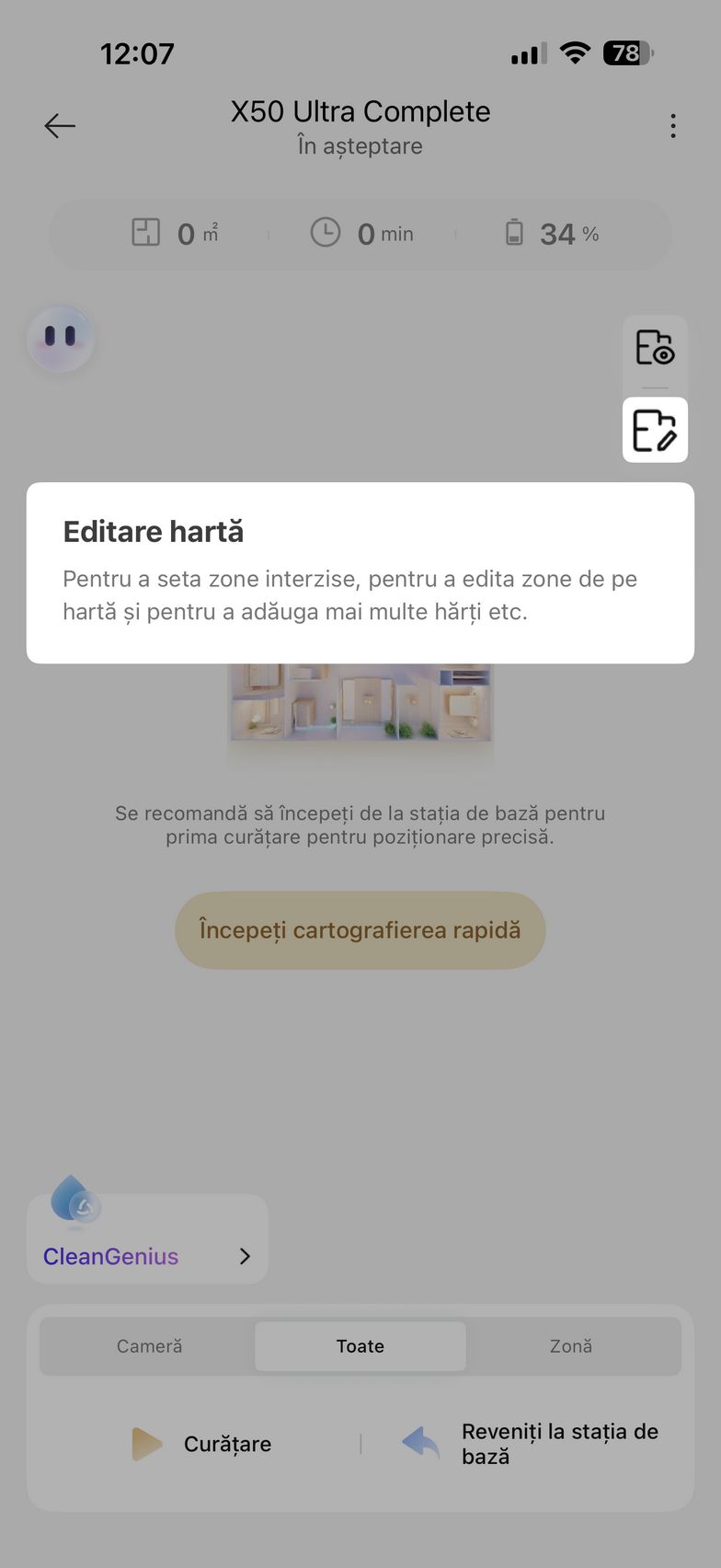 Am apăsat apoi butonul Accesați dispozitivul și am intrat în grosul funcțiilor. De aici am pus aspiratorul la treabă inițial pentru a mapa casa. Ulterior am editat harta cu zone no-go, tip de suprafață, denumire și jos am avut la dispoziție toate opțiunile de curățare. Se poate alege dintre Cameră, Toate sau Zonă. Dacă nu vrei să îți bați tu capul cu setat modurile de curățare/spălare, există CleanGenius care folosește algoritmi speciali pentru a curăța în mod inteligent întreaga casă.
