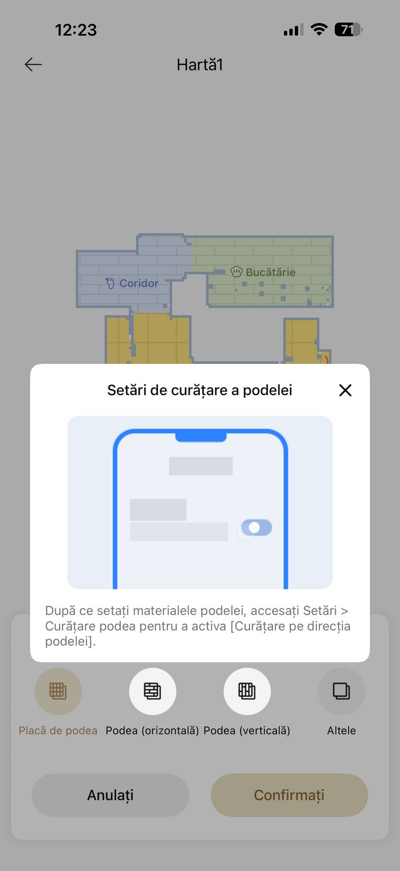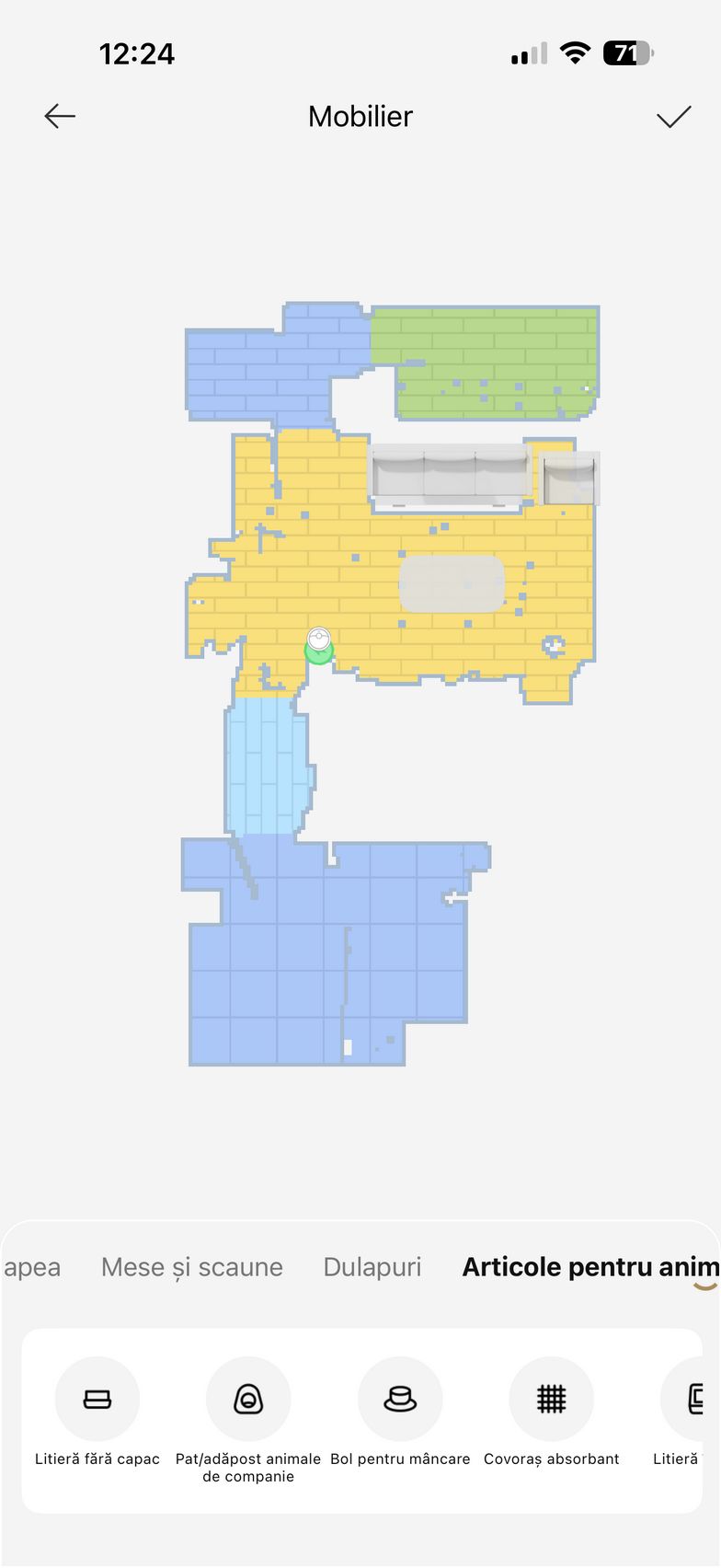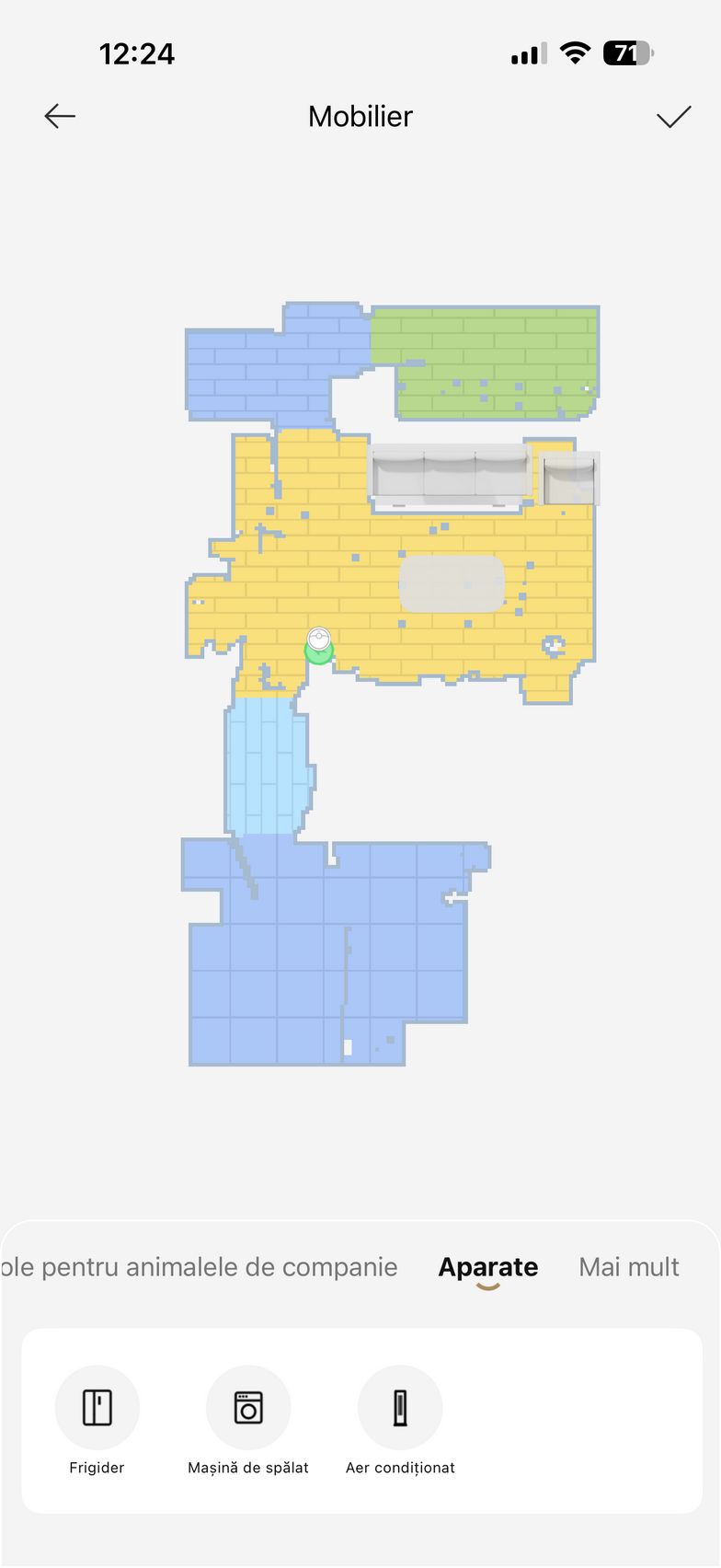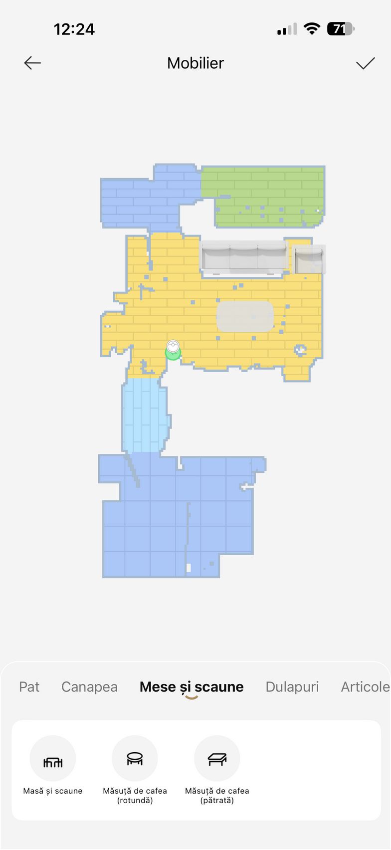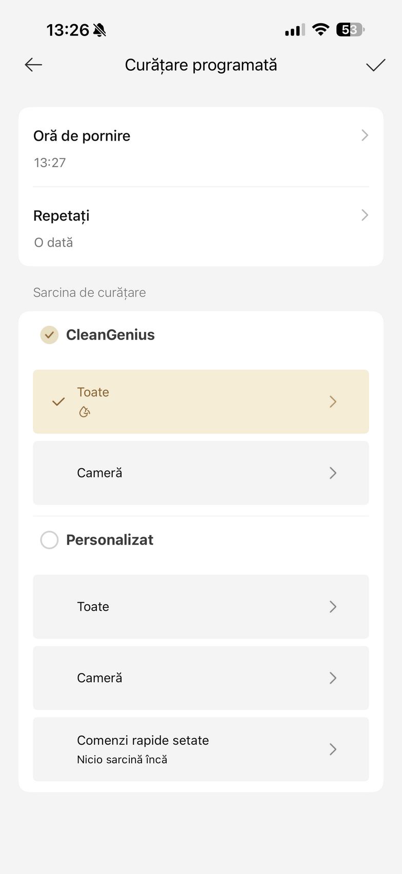 Am apăsat apoi butonul Accesați dispozitivul și am intrat în grosul funcțiilor. De aici am pus aspiratorul la treabă inițial pentru a mapa casa. Ulterior am editat harta cu zone no-go, tip de suprafață, denumire și jos am avut la dispoziție toate opțiunile de curățare. Se poate alege dintre Cameră, Toate sau Zonă. Dacă nu vrei să îți bați tu capul cu setat modurile de curățare/spălare, există CleanGenius care folosește algoritmi speciali pentru a curăța în mod inteligent întreaga casă.