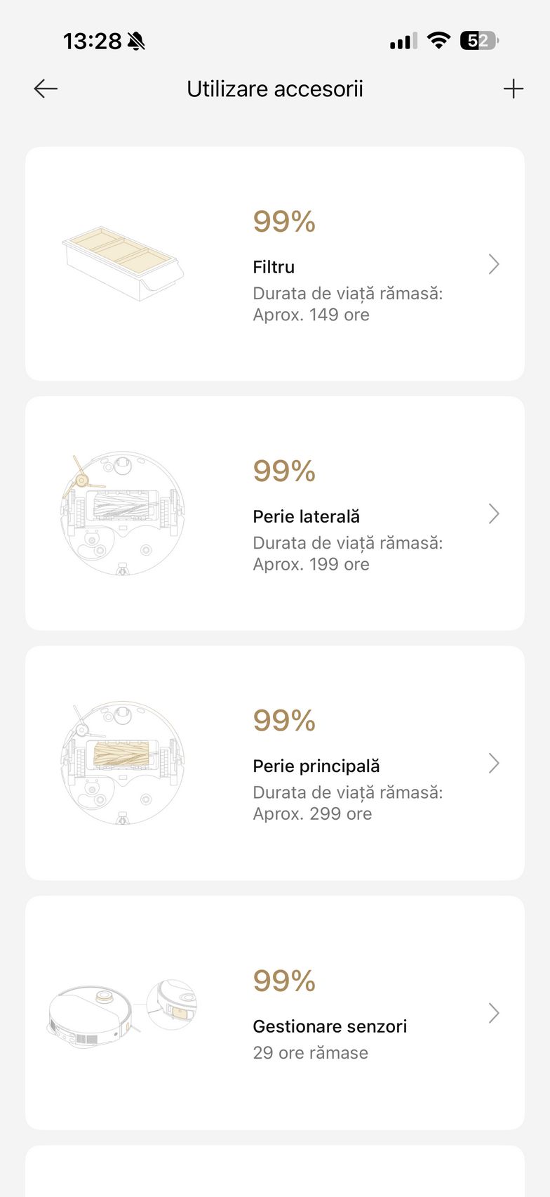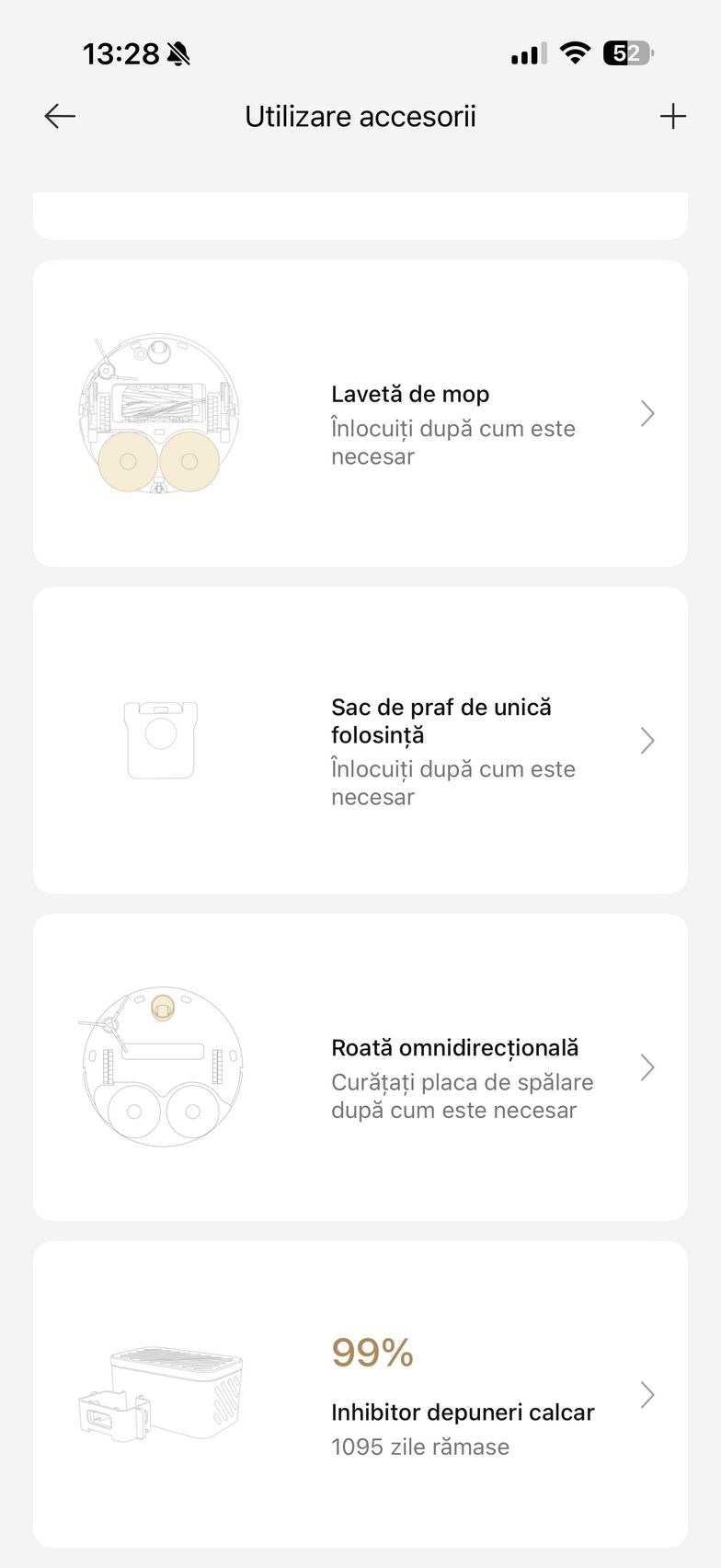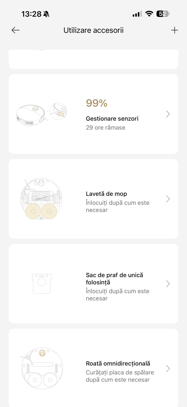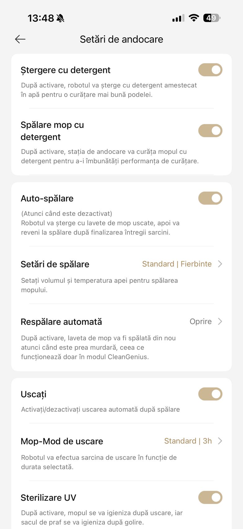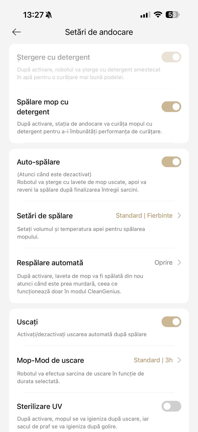 Mai jos am descoperit și setările pentru dock ce țin de spălarea mopului și uscarea sa și aici am dat peste ceva ce nu am mai văzut pe un aspirator robot până acum și anume Sterilizare UV (mopul se igienizează după uscare iar sacul de praf se igienizează după golire). Mai sunt și opțiunile de cameră în timp real, asistent vocal și am văzut care este lifetime-ul accesoriilor.