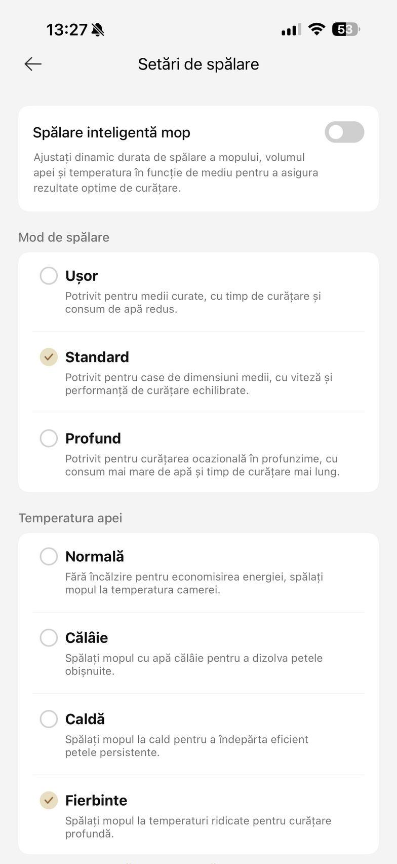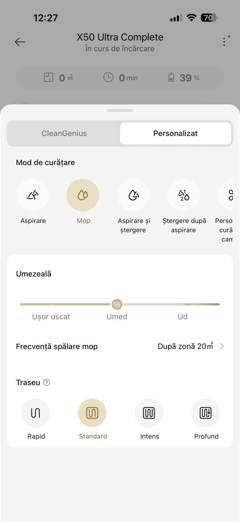 - Mop - umezeală mop de la 1-32 (ușor uscat - ud), frecvență spălare mop (după zonă, după timp, după cameră), Traseu - rapid, standard, intens, profund