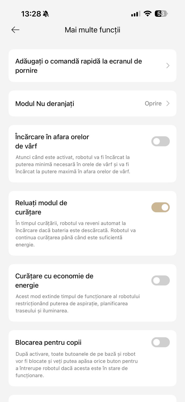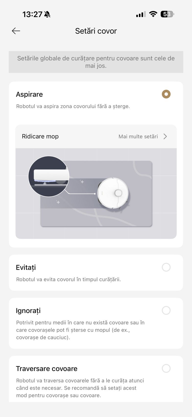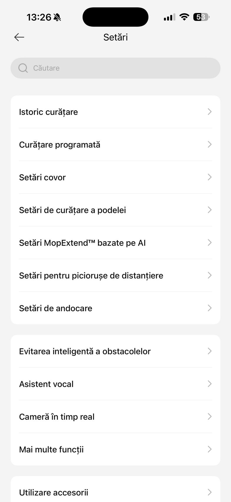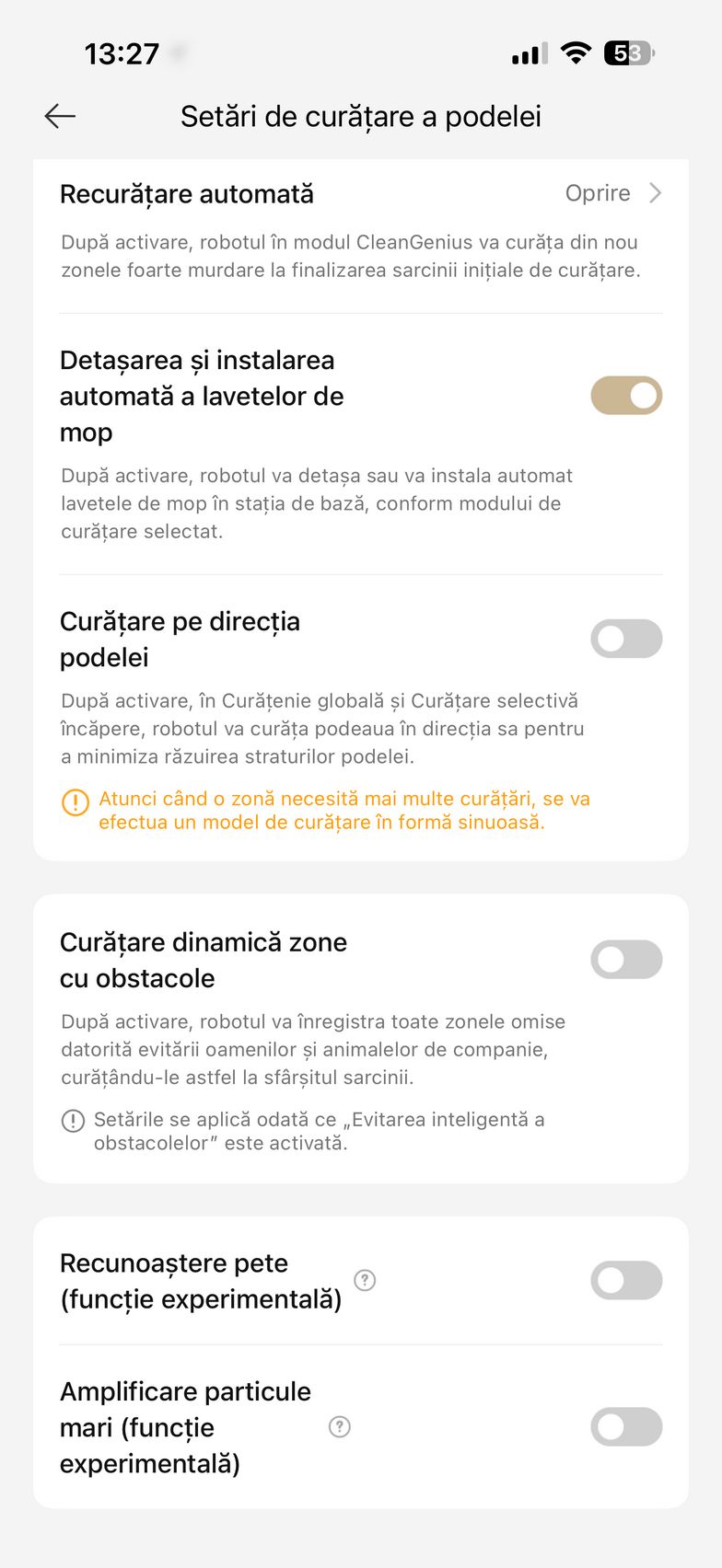 Aplicația abundă și în setări care mai de care și aici am găsit un istoric de curățare, modul de programare curățare, setări pentru covor (aspirare, ridicare mop, evitați, ignorați, traversare covoare), plus setări de curățare a podelei. Aici am dat și de funcțiile experimentale Recunoaștere pete și Amplificare particule mari (ex - bobițe de hrană pentru animale de companie). Mai jos am găsit și setările pentru extinderea mopului și a periei laterale, cât și setările pentru piciorușele de distanțiere (stil piedică - piciorușele traversează obstacolele secvențial, ideal pentru uși culisante sau stil sincronizat - ambele piciorușe traversează obstacole simultan, recomandat pentru praguri).