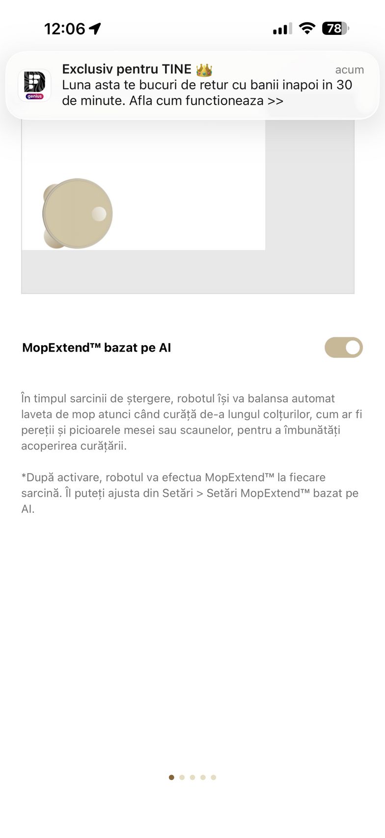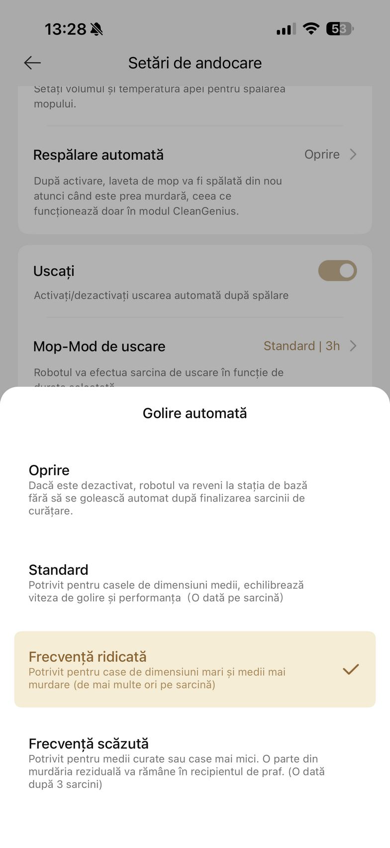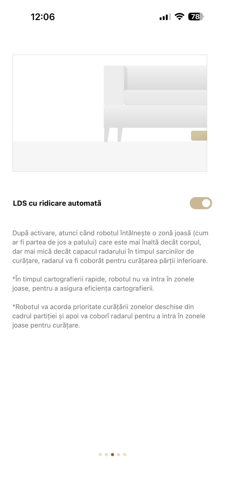 Aplicația abundă și în setări care mai de care și aici am găsit un istoric de curățare, modul de programare curățare, setări pentru covor (aspirare, ridicare mop, evitați, ignorați, traversare covoare), plus setări de curățare a podelei. Aici am dat și de funcțiile experimentale Recunoaștere pete și Amplificare particule mari (ex - bobițe de hrană pentru animale de companie). Mai jos am găsit și setările pentru extinderea mopului și a periei laterale, cât și setările pentru piciorușele de distanțiere (stil piedică - piciorușele traversează obstacolele secvențial, ideal pentru uși culisante sau stil sincronizat - ambele piciorușe traversează obstacole simultan, recomandat pentru praguri).