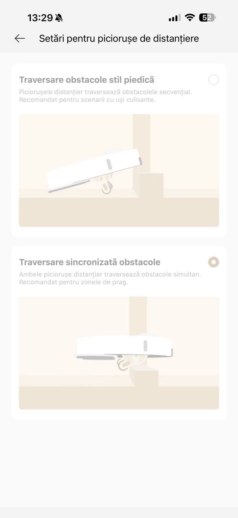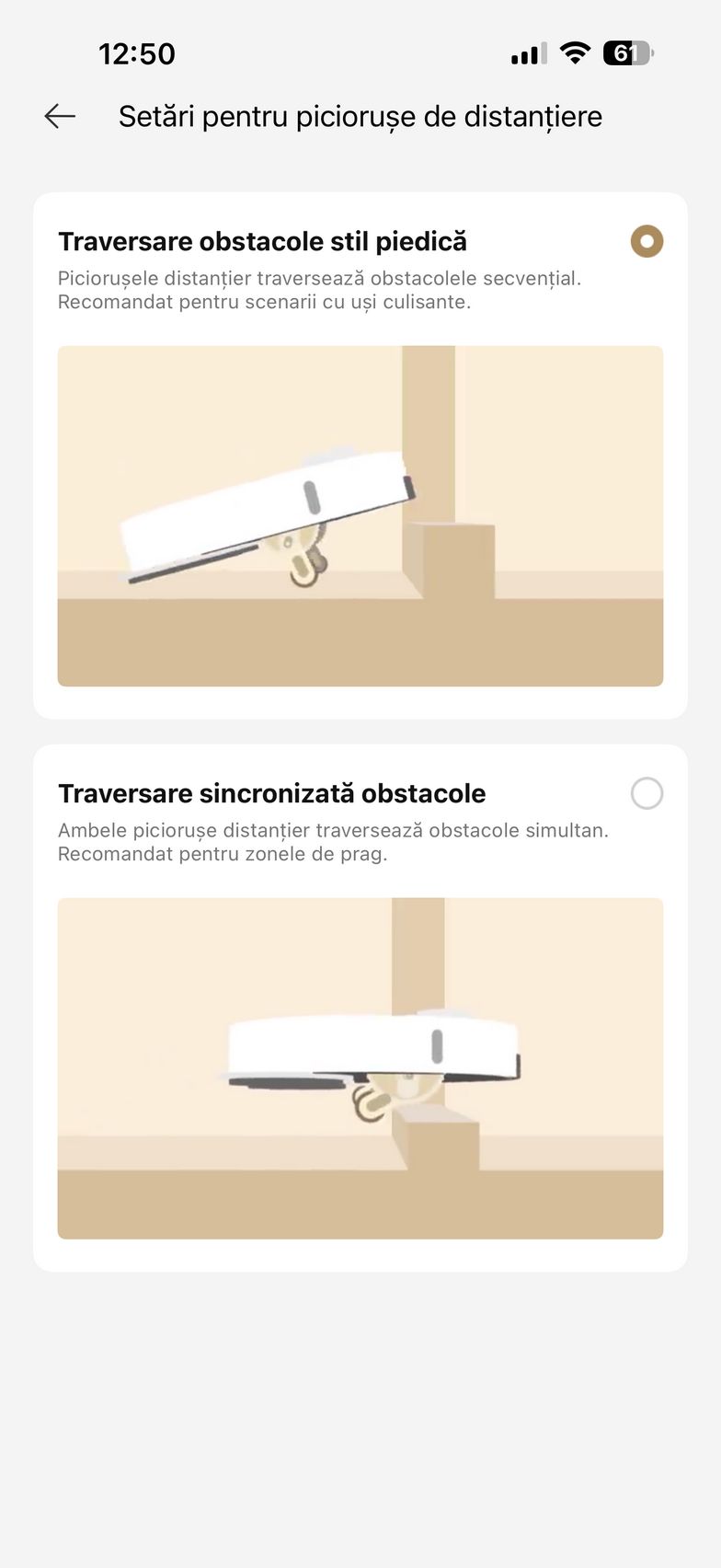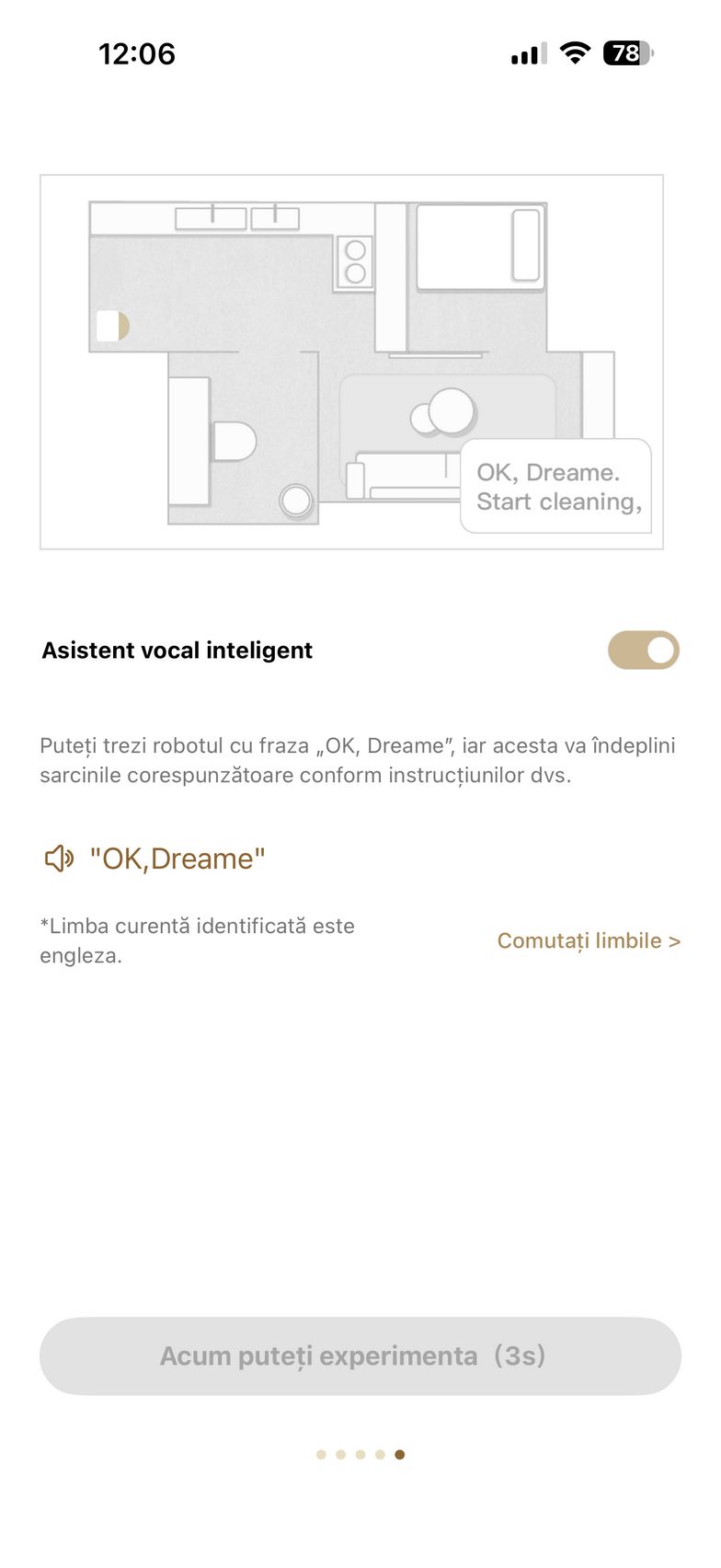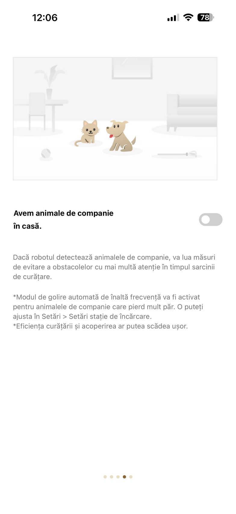 Aplicația abundă și în setări care mai de care și aici am găsit un istoric de curățare, modul de programare curățare, setări pentru covor (aspirare, ridicare mop, evitați, ignorați, traversare covoare), plus setări de curățare a podelei. Aici am dat și de funcțiile experimentale Recunoaștere pete și Amplificare particule mari (ex - bobițe de hrană pentru animale de companie). Mai jos am găsit și setările pentru extinderea mopului și a periei laterale, cât și setările pentru piciorușele de distanțiere (stil piedică - piciorușele traversează obstacolele secvențial, ideal pentru uși culisante sau stil sincronizat - ambele piciorușe traversează obstacole simultan, recomandat pentru praguri).