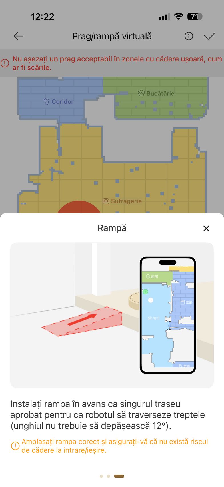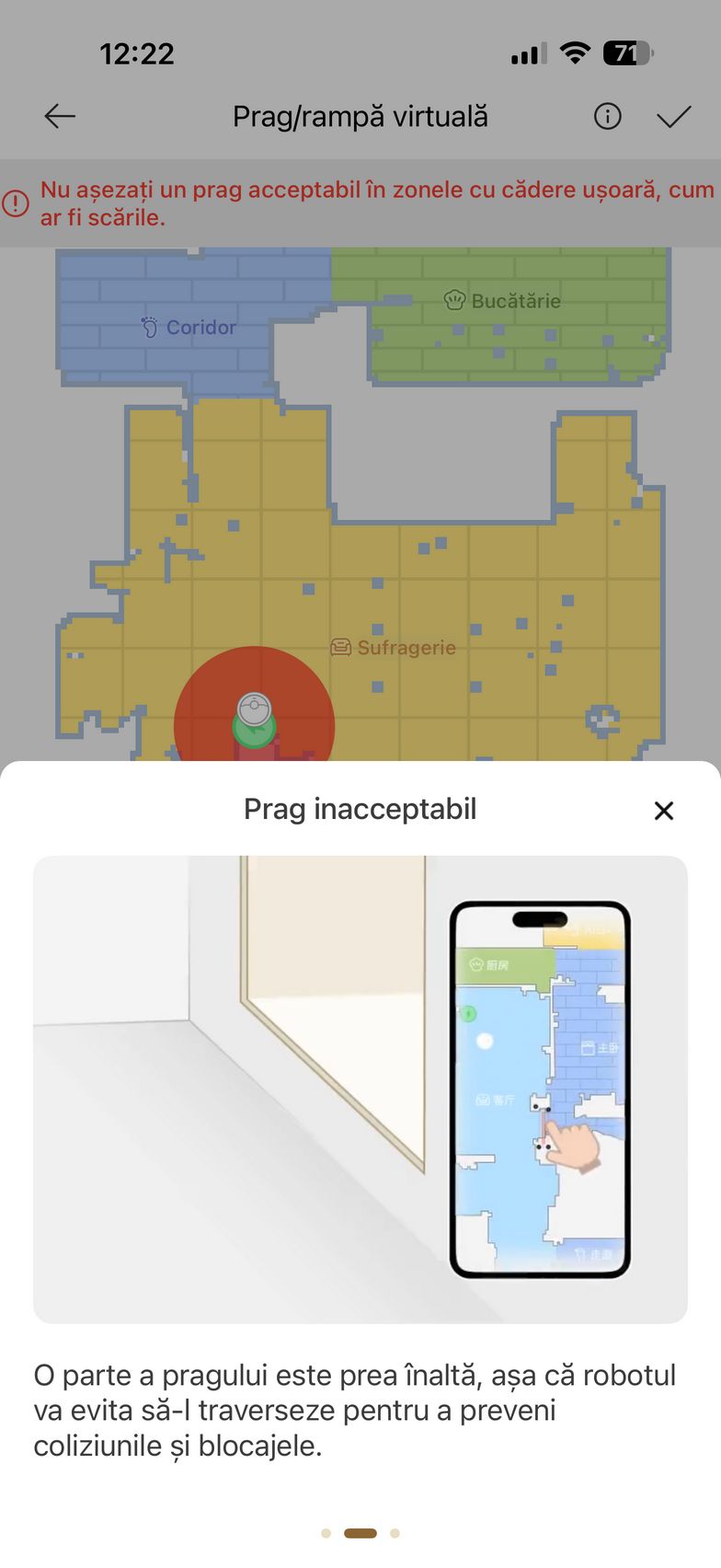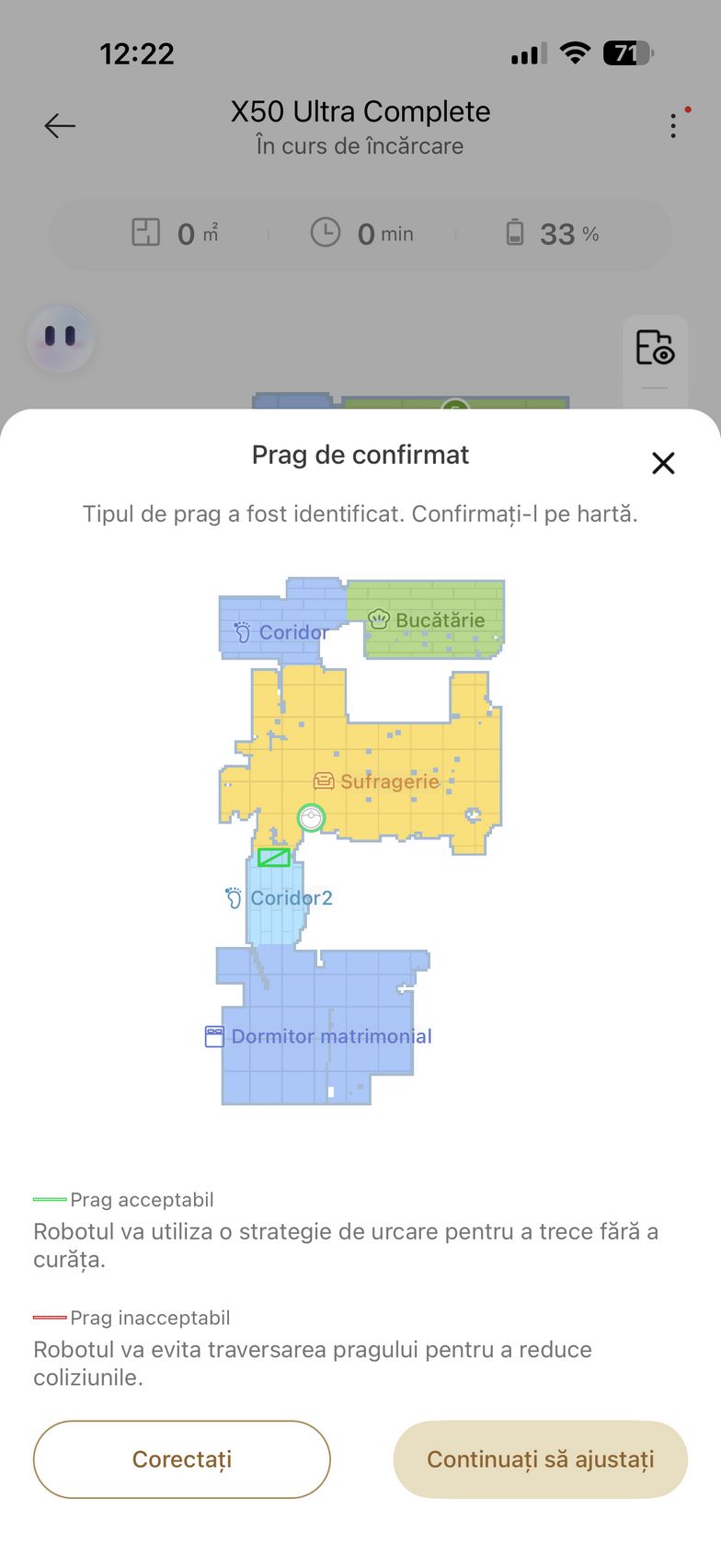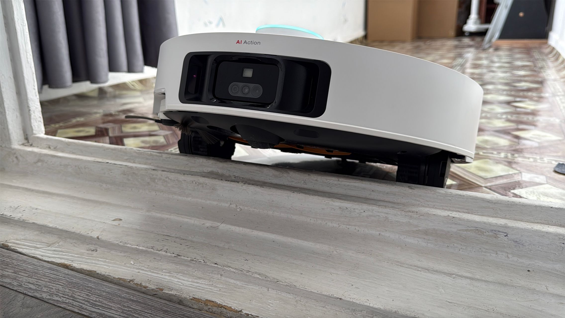 Apropo, sistemul cu picioarele retractabile rezistă la peste 30.000 de utilizări, deci nu e cazul să te îngrijorezi cu privire la durabilitatea sa. Eu am încercat să îl pun la treabă pentru a urca și în baie, dar fiind la 10 cm înălțime, peste limita sa, a decis să spună pas. S-a descurcat mai bine la intrarea pe balcon cu prag în trepte ca să zic așa, unde nici un alt aspirator robot nu a mai ajuns până acum, puțin derutat în primă fază pentru că nu scanase balconul inițial, dar apoi a sărit să aspire și "depozitul" de cutii pentru produse ajunse la review. Urcarea a fost mai lină, dar la întoarcerea spre living a dat față în față cu partea opusă a pragului, fără acele trepte de îmbinare a ușii și credeam că scoate steagul alb, dar după ce a mai gândit puțin situația a știut cum să se înalțe și să treacă de obstacol. A ajuns cu succes la finish!