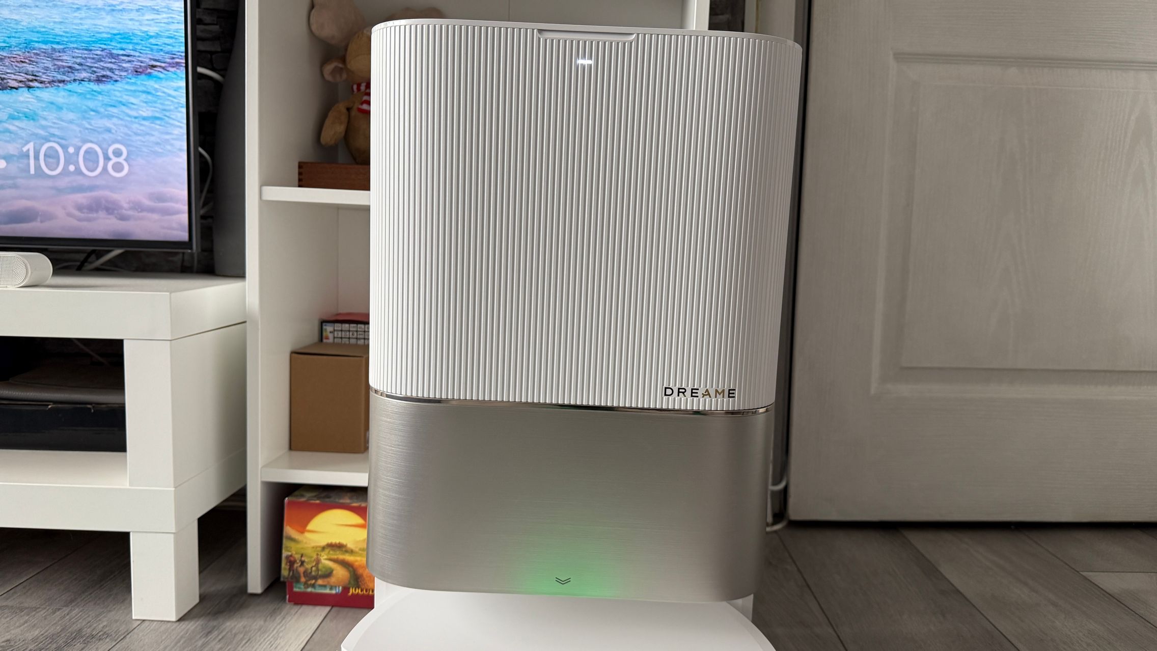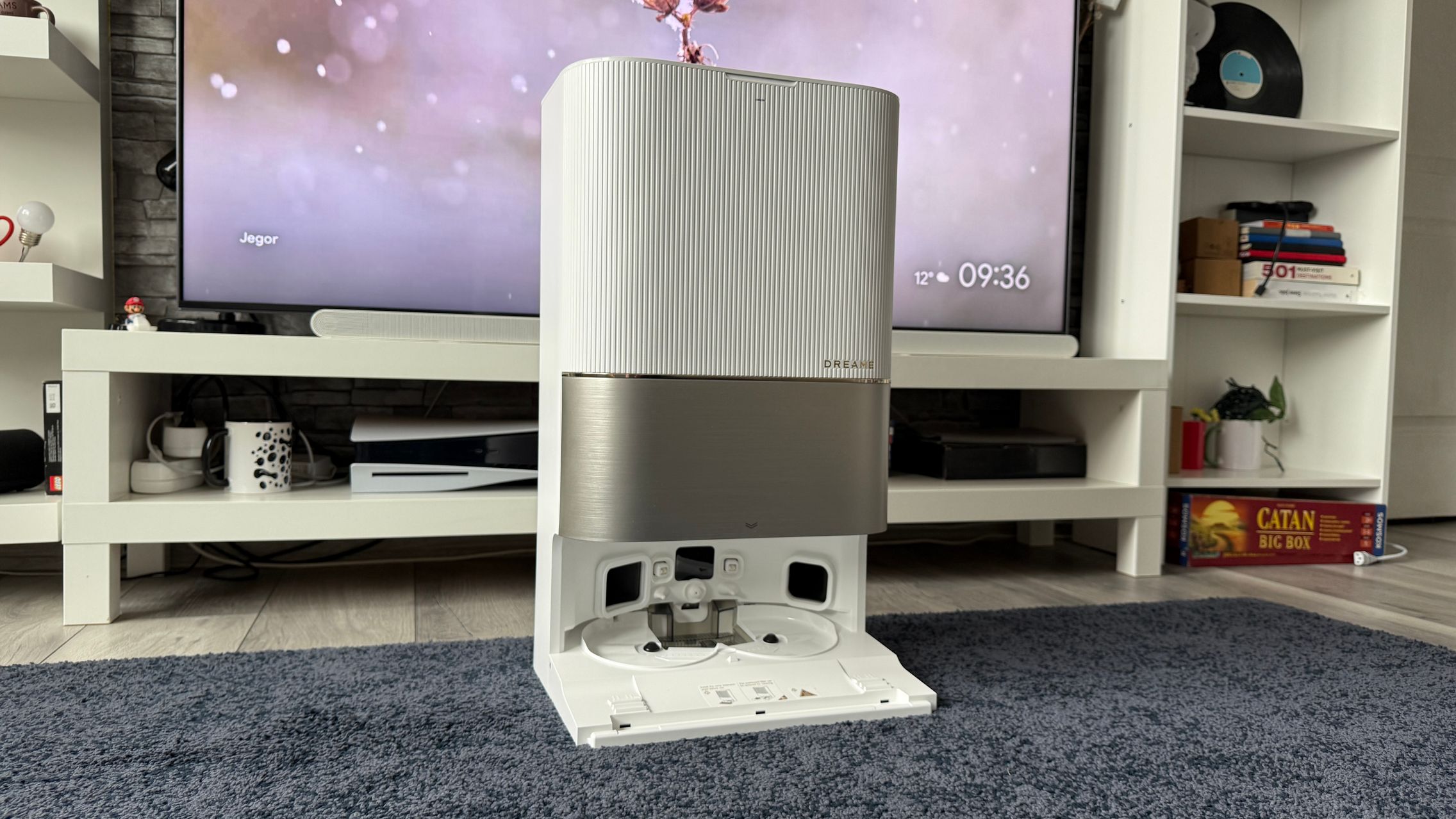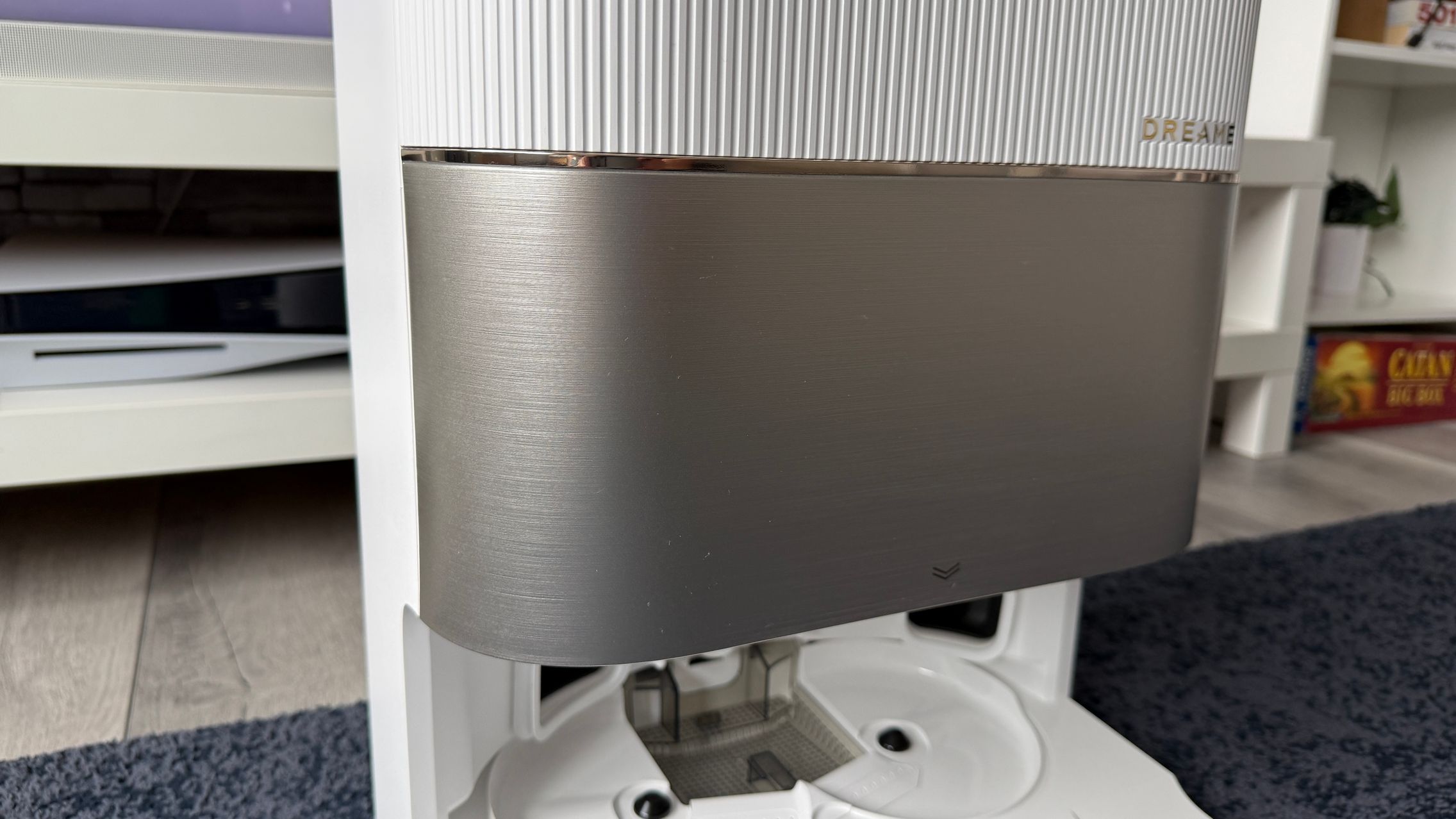 Acest aspirator fiind alb nici urmă de amprente și praf, iar dock-ul preia coloritul și adaugă un capac argintiu-sidefiu tip brushed-metal, dar nu glossy, Are și accente aurii iar textura liniară de pe dock mă duce cumva cu gândul la o pereche de boxe premium. Ar da perfect dacă în spate s-ar afla un perete cu riflaje cum este mai nou la modă.