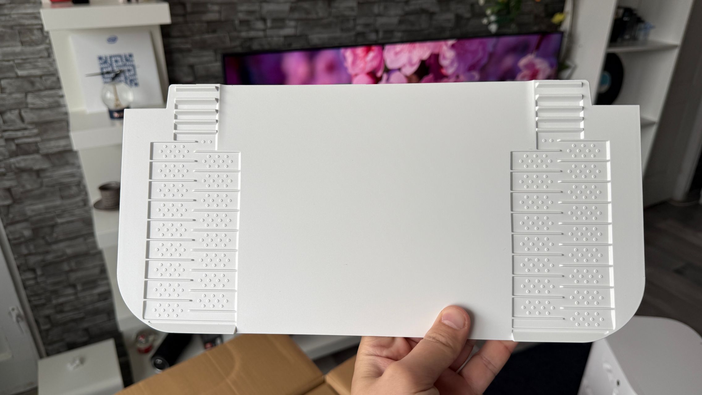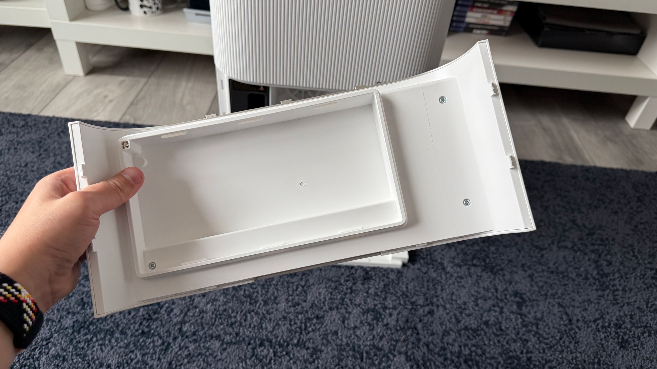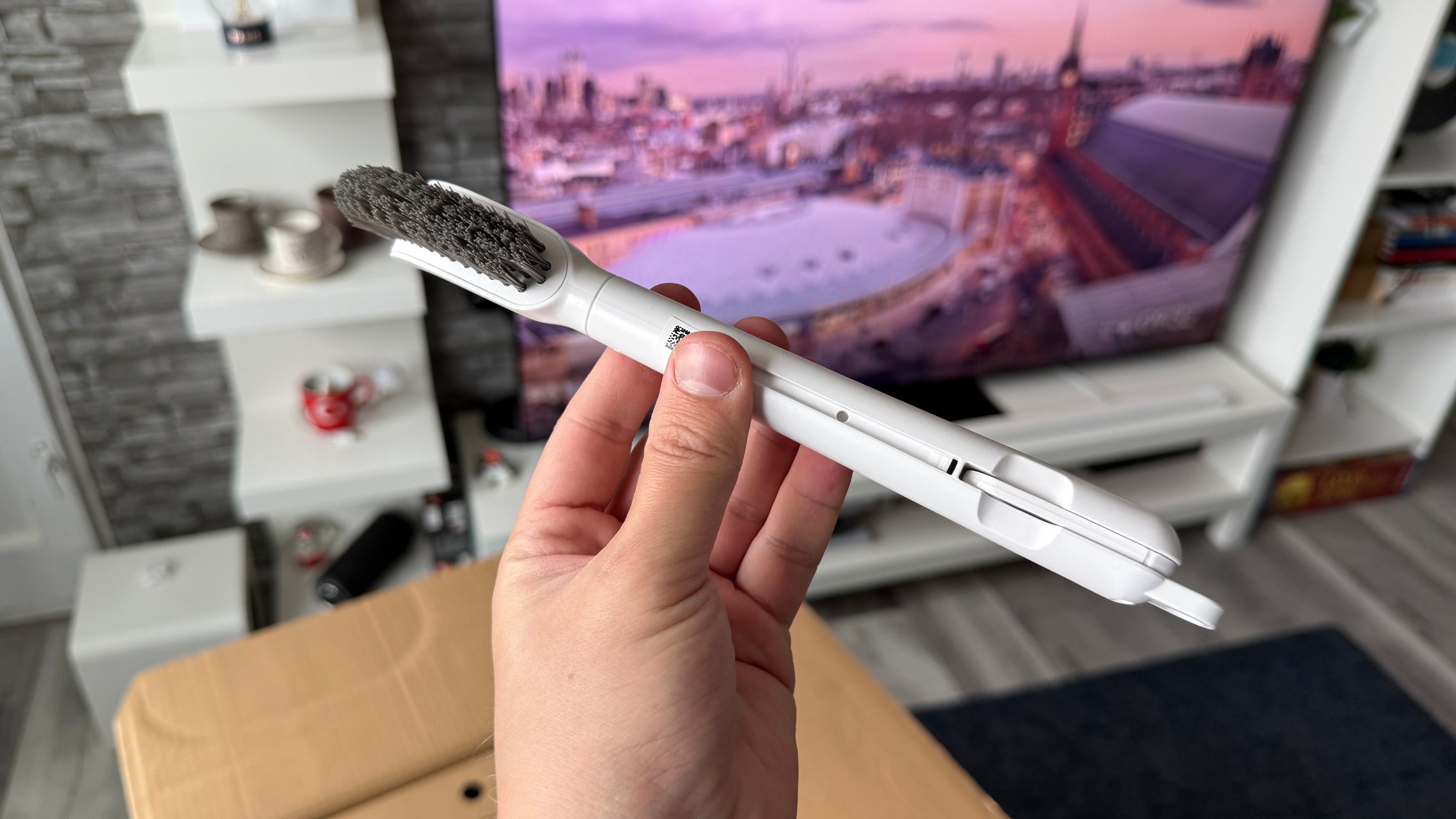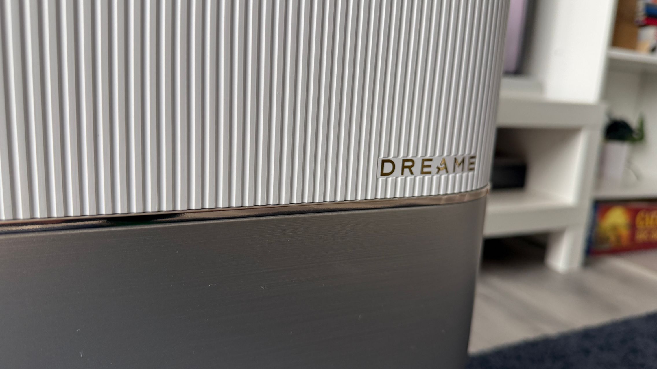 Acest aspirator fiind alb nici urmă de amprente și praf, iar dock-ul preia coloritul și adaugă un capac argintiu-sidefiu tip brushed-metal, dar nu glossy, Are și accente aurii iar textura liniară de pe dock mă duce cumva cu gândul la o pereche de boxe premium. Ar da perfect dacă în spate s-ar afla un perete cu riflaje cum este mai nou la modă.