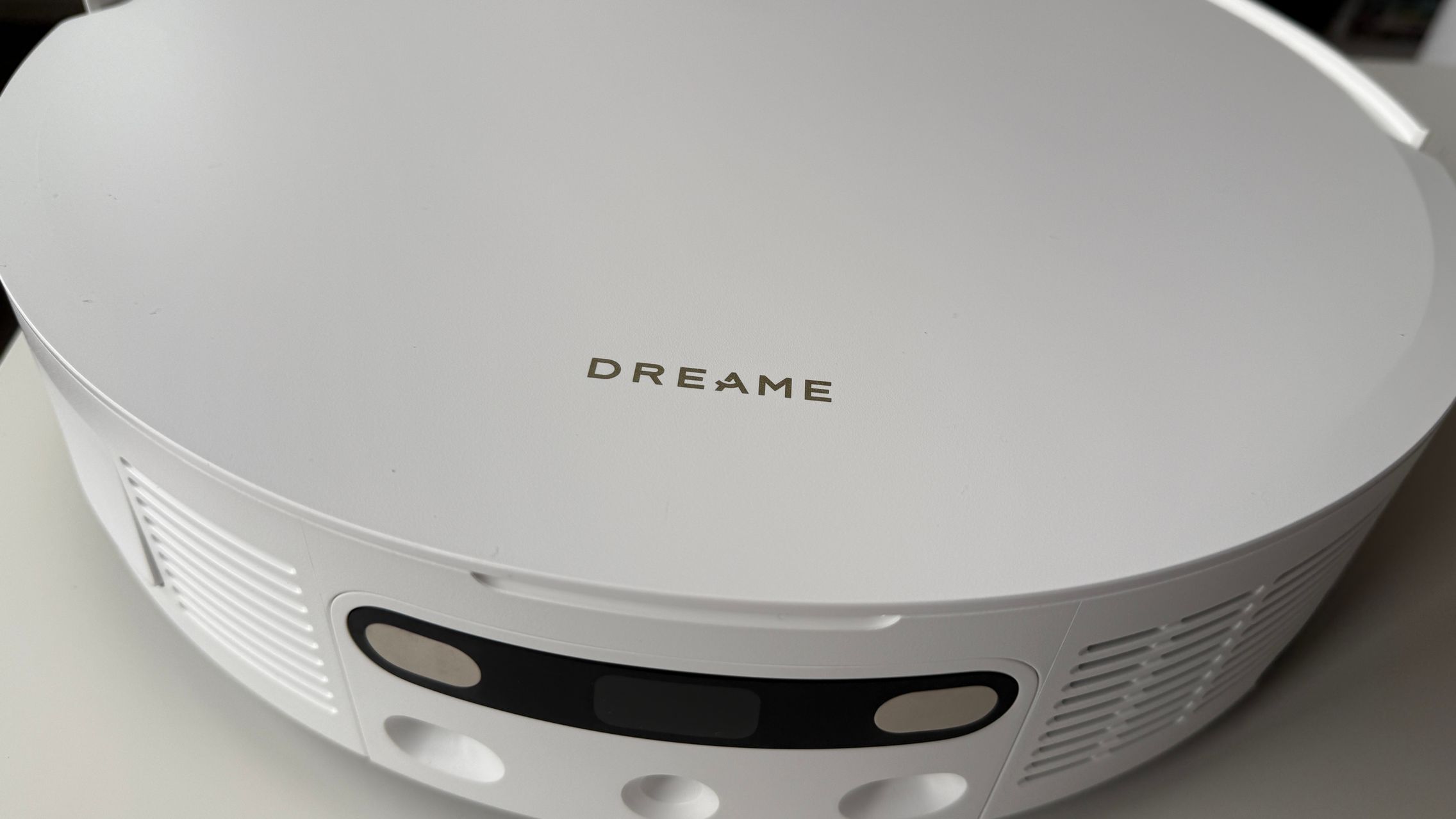 Dreame are un stil aparte când vine vorba de design, iar Dreame X50 Ultra Complete arată fix cum mi-aș dori să arate un aspirator smart care stă la vedere. Am primit varianta pe alb și mă bucur că are finisaje mate de jur împrejur. Singurul loc în care am găsit "reflexii" e în zona frontală unde sunt senzori și camere și aici nu am obiecții, fiind nevoie de precizie. Se șterge ușor cu o lavetă la nevoie.